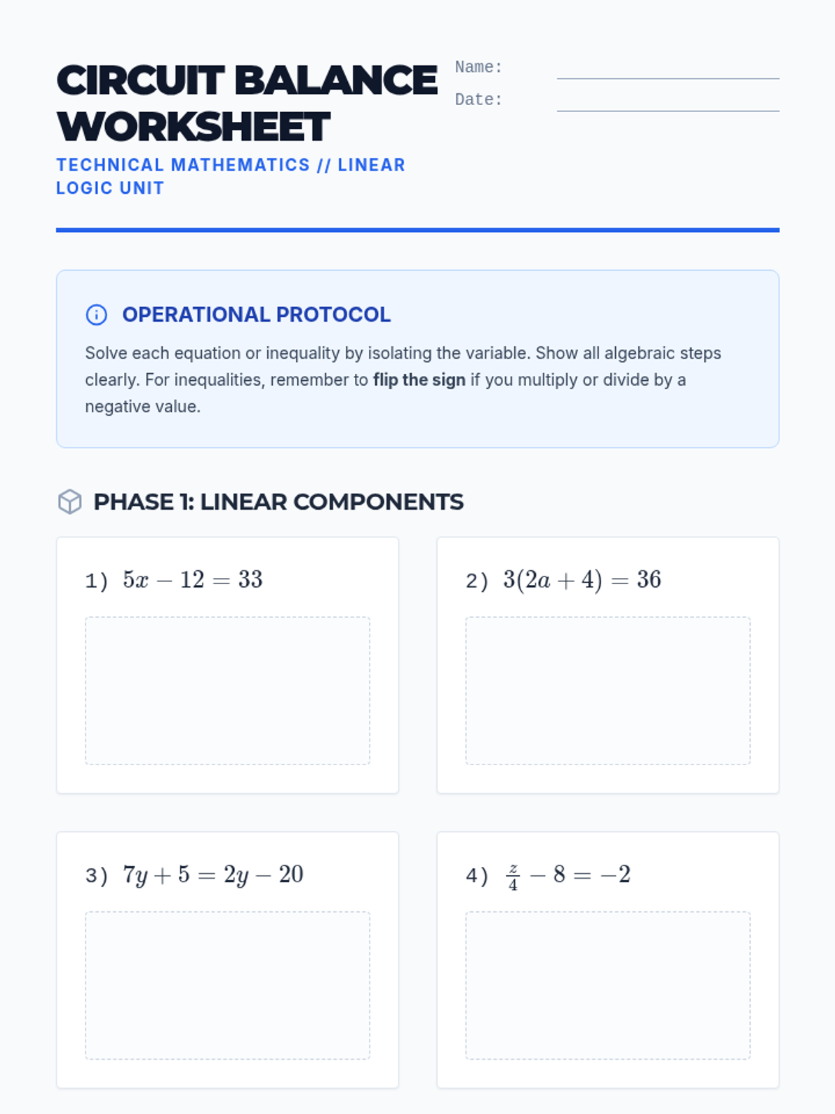 A focused lesson on solving linear equations and inequalities with one variable, emphasizing the balancing method and the specific rules for inequality signs.