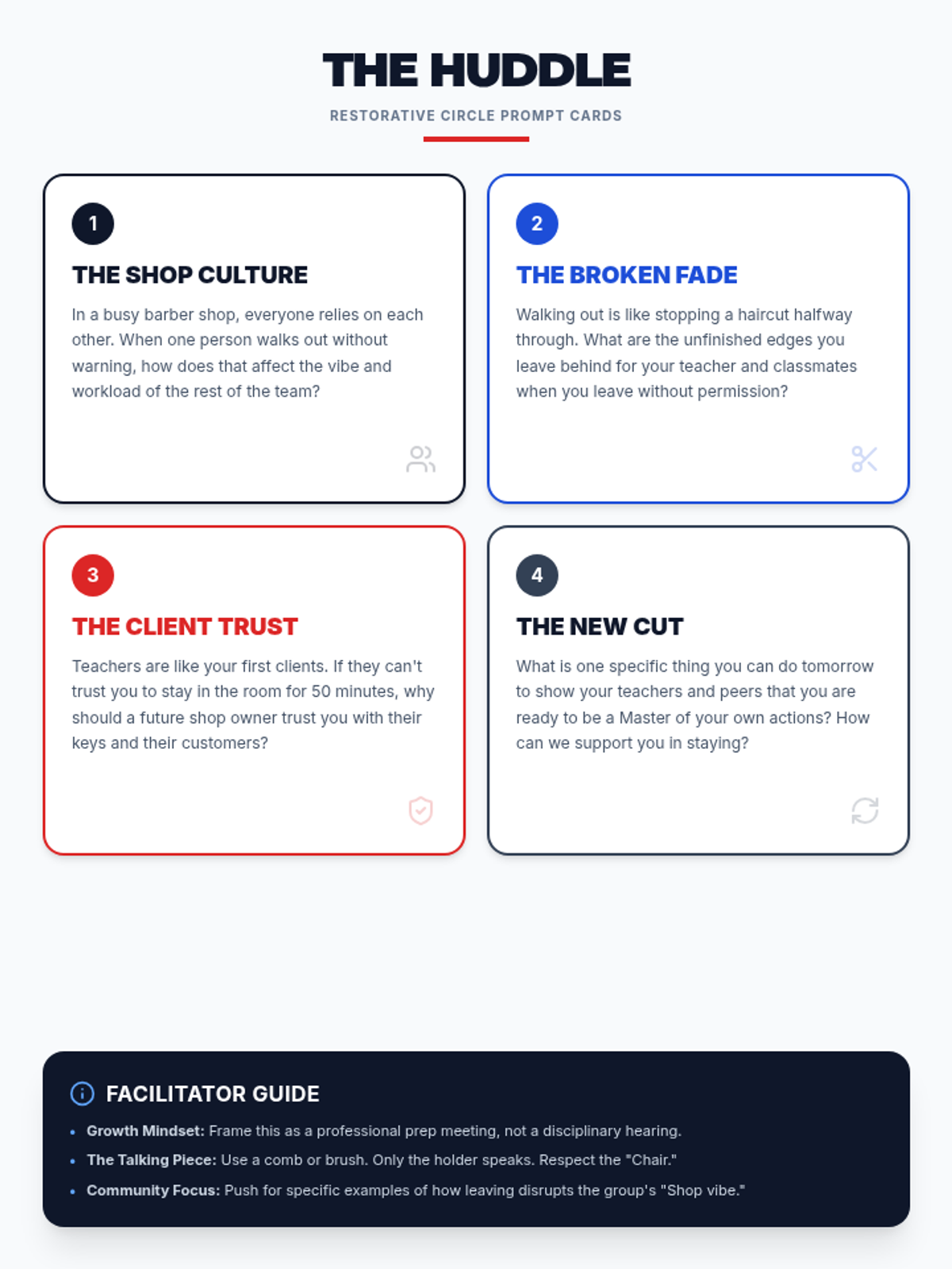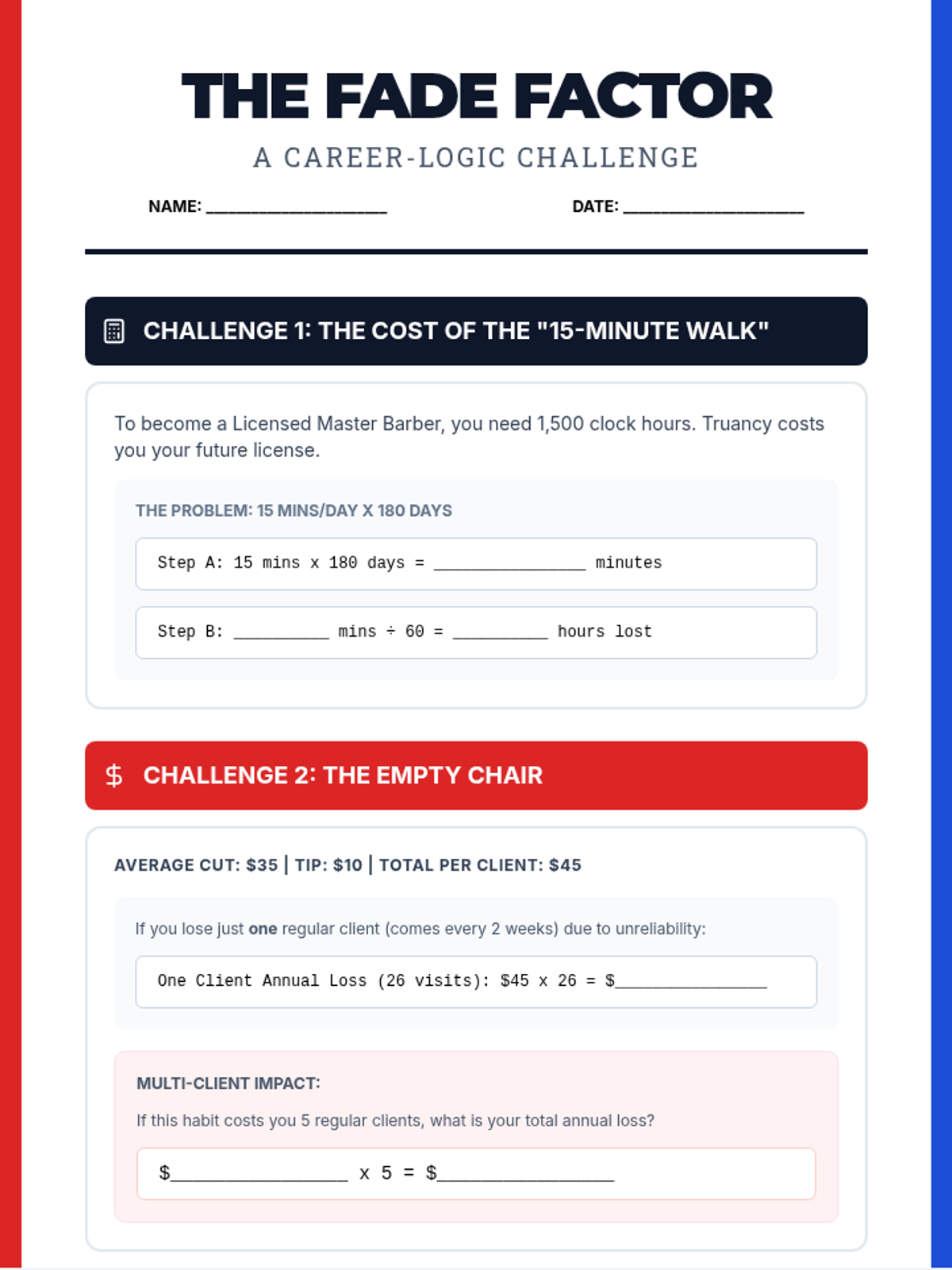 This lesson uses a barbering-inspired theme to help students reflect on the impact of truancy and class-walking on their long-term career goals. It focuses on professionalism, accountability, and the direct connection between classroom behavior and future success in the barbering industry.