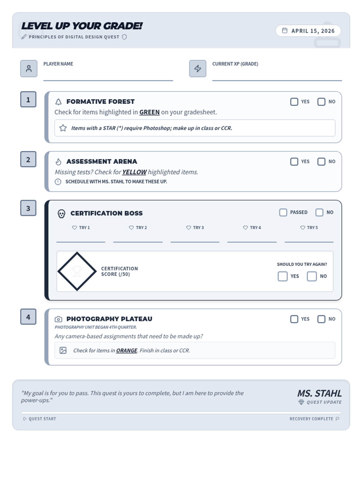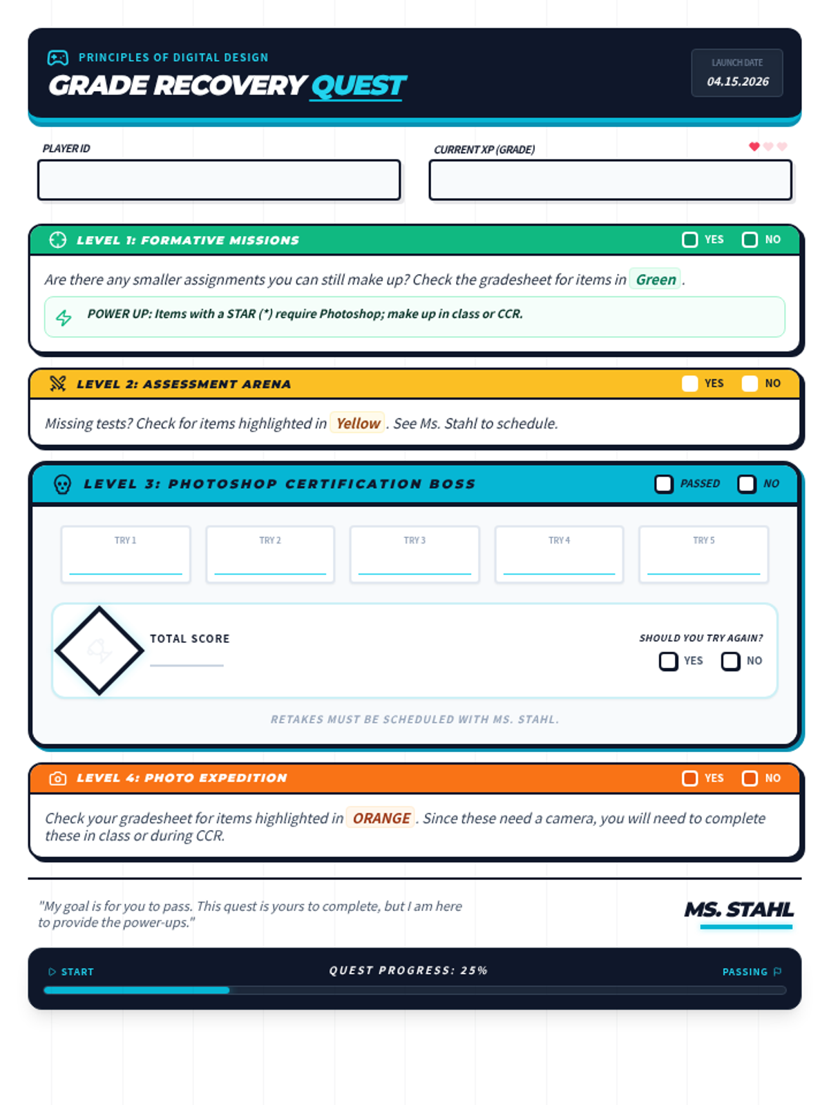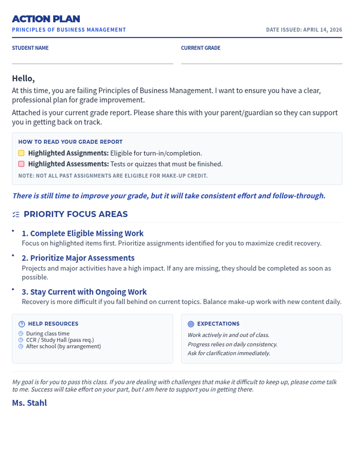 A collection of grade recovery action plans for various elective classes, designed to help failing students get back on track with clear, actionable steps.