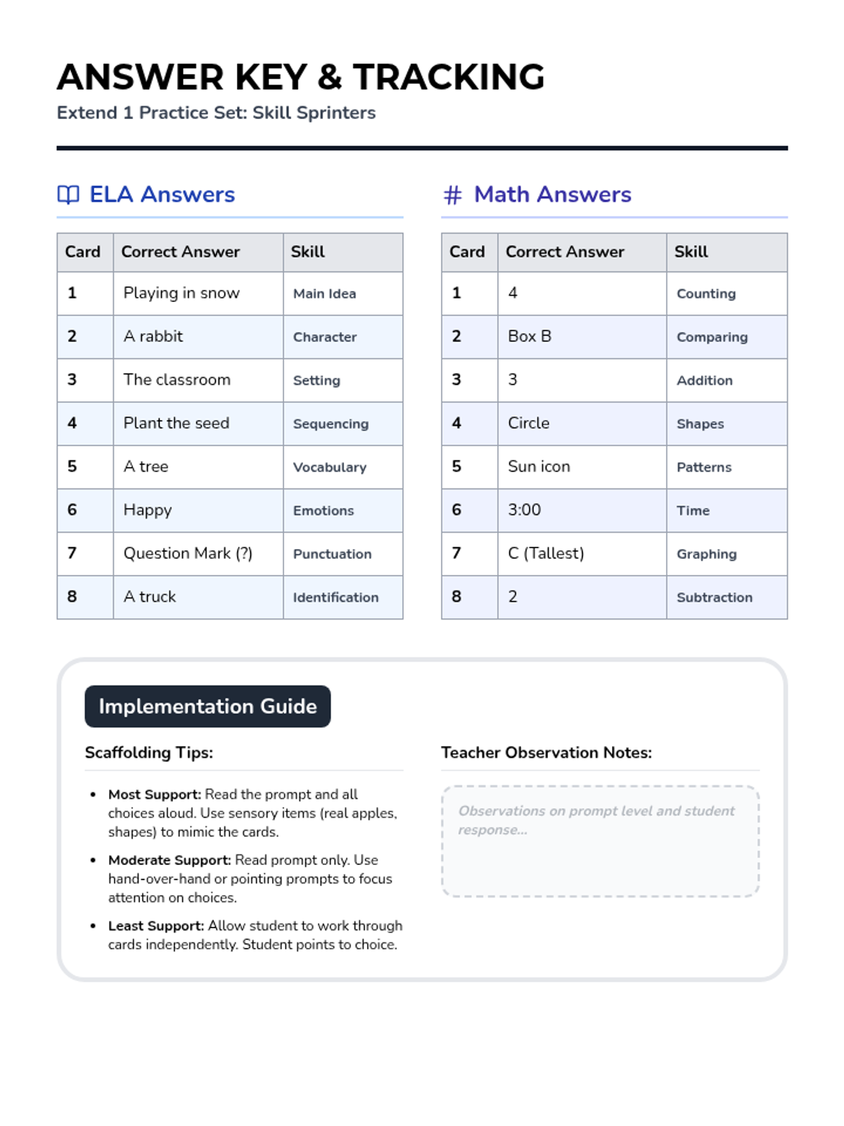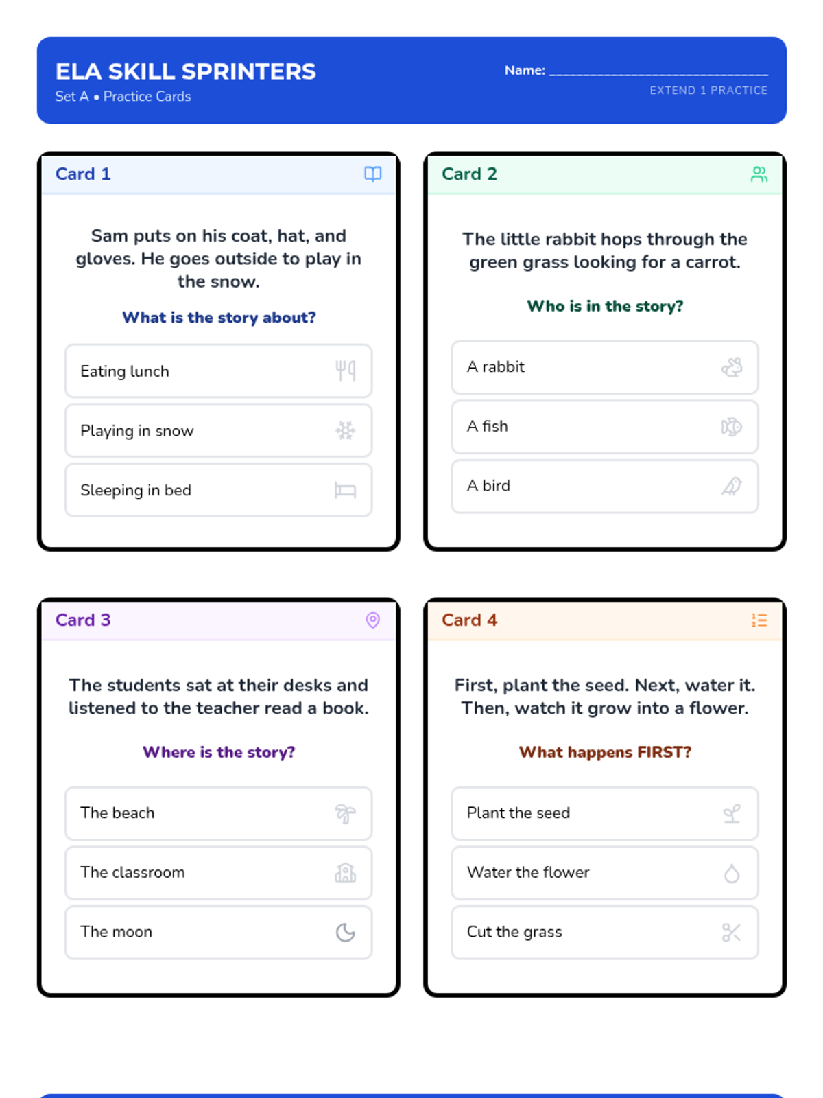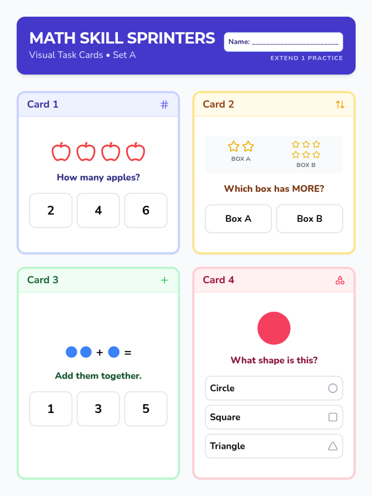 A set of ELA and Math visual task cards designed for students preparing for the Extend 1 alternate assessment, featuring high-contrast visuals and simplified choices.