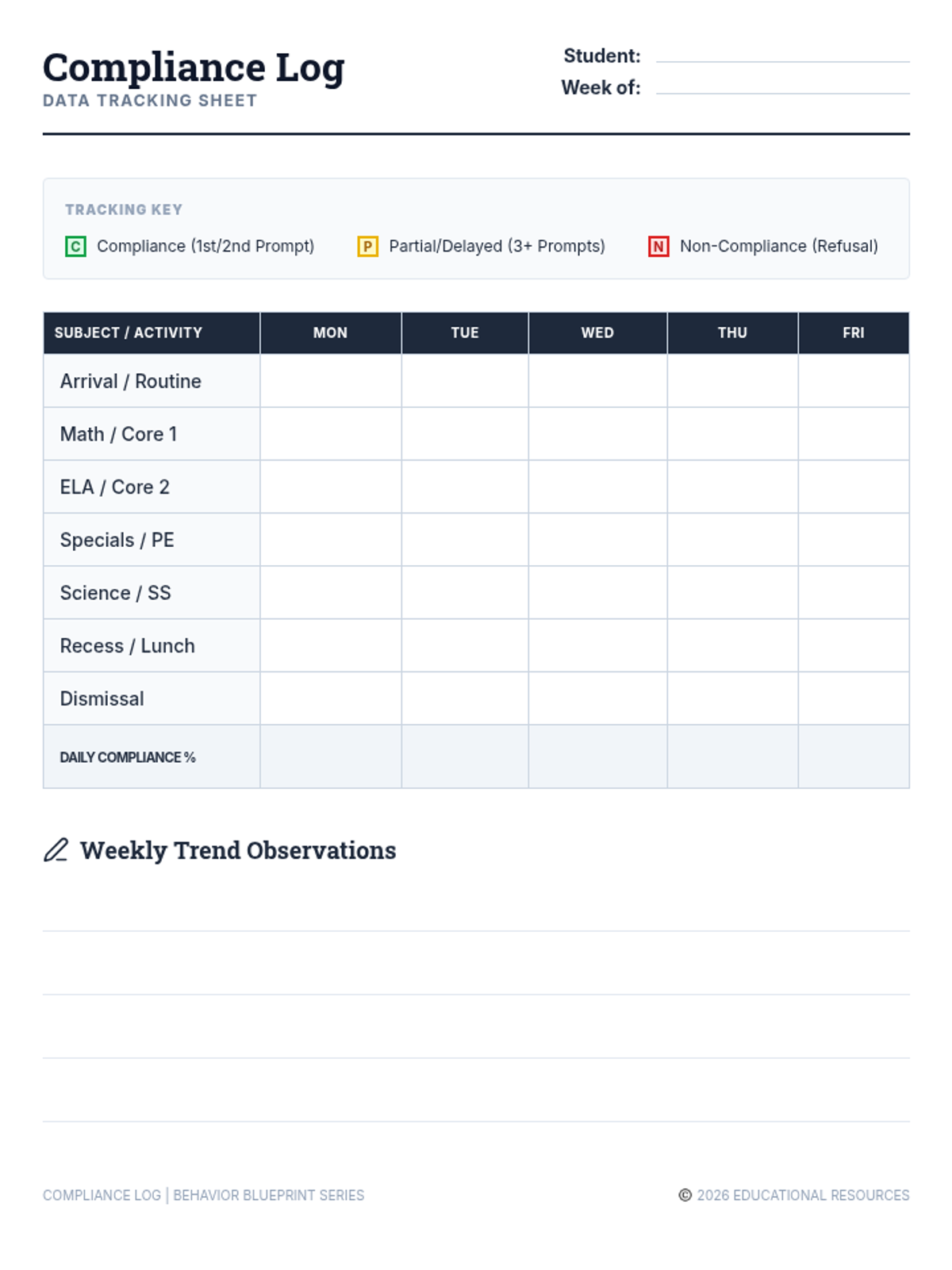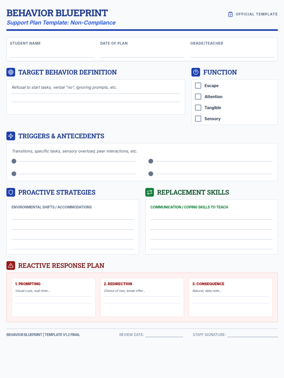 A professional and structured set of templates for creating and monitoring Behavior Support Plans, specifically designed for managing non-compliance in the classroom.