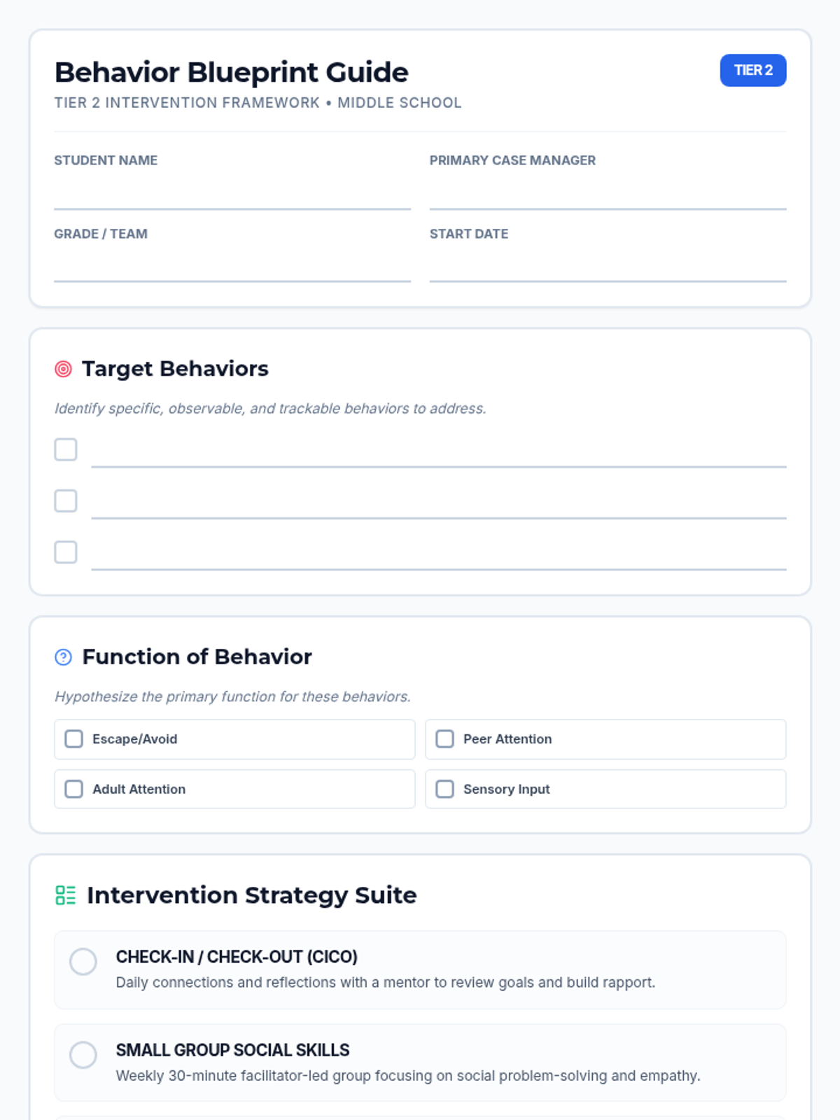 A comprehensive Tier 2 intervention package designed for middle school students facing social-emotional and behavioral challenges. It includes planning guides for staff and tracking tools for students.