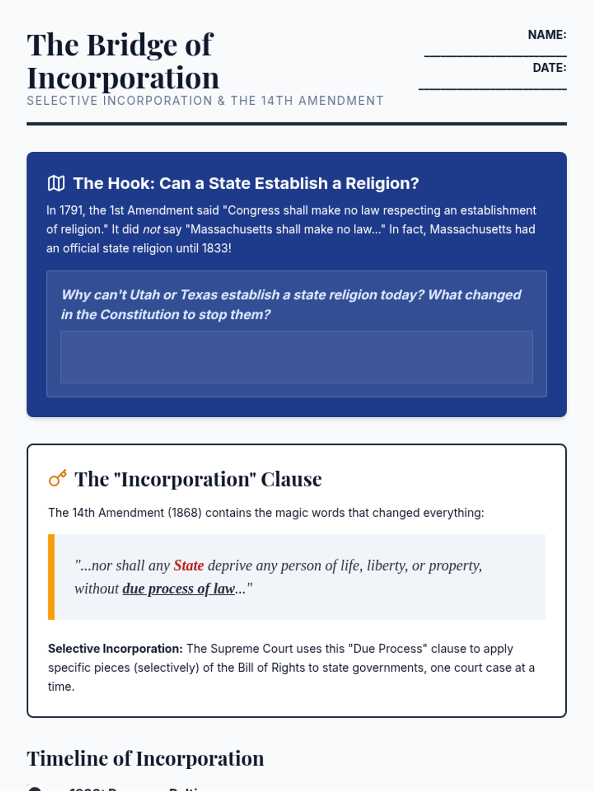 Students explore selective incorporation and how the 14th Amendment's Due Process clause applies the Bill of Rights to the states.