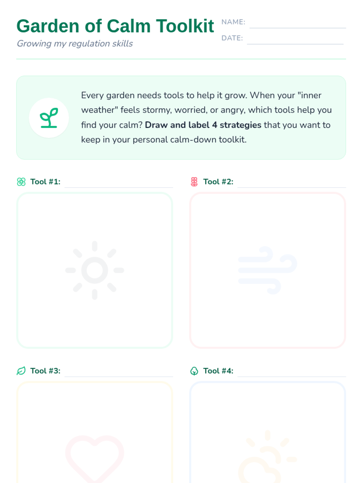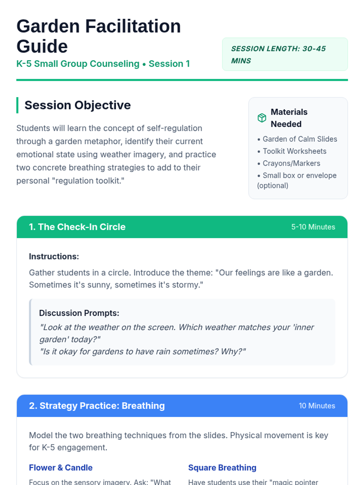 A small-group counseling lesson focused on teaching K-5 students self-regulation techniques and building a personalized calm-down toolkit. Students explore feelings through a garden-themed check-in and practice various breathing exercises.