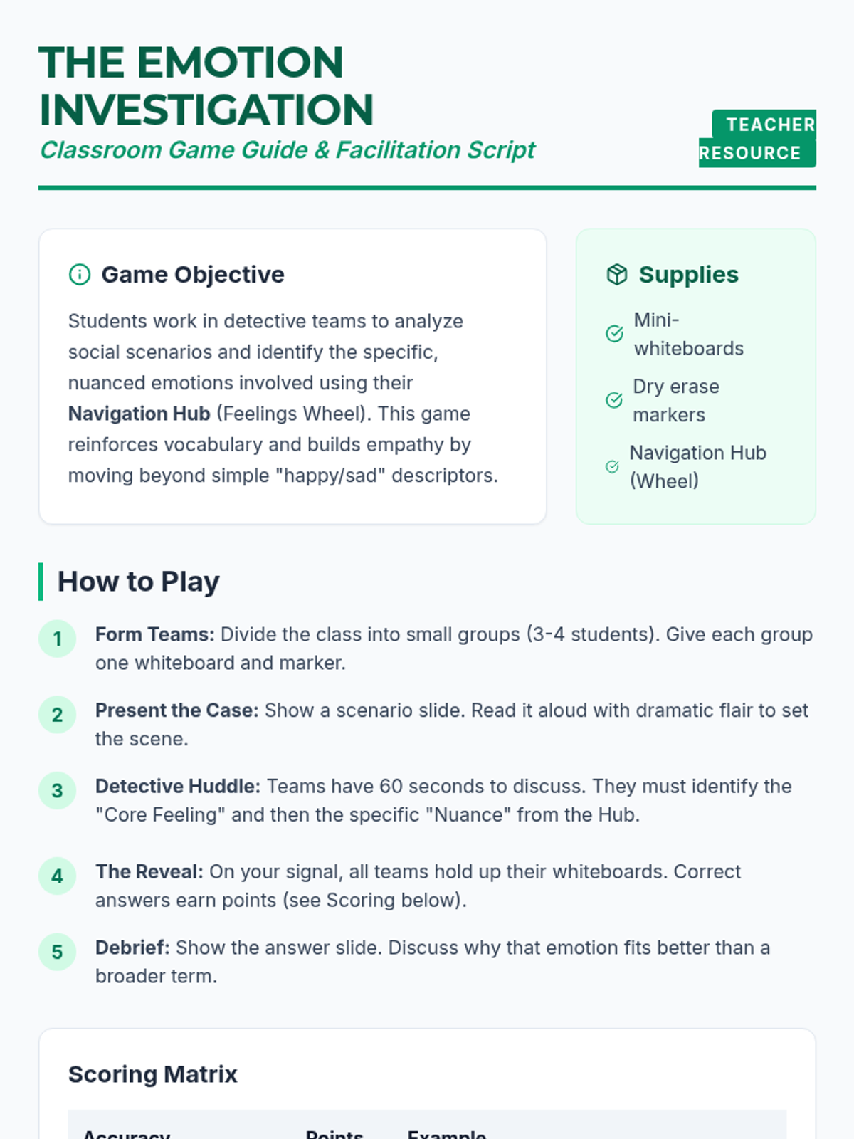 A lesson focused on identifying and analyzing complex emotions using a feelings wheel. Students will practice self-awareness and empathy through real-world scenarios designed for middle schoolers.