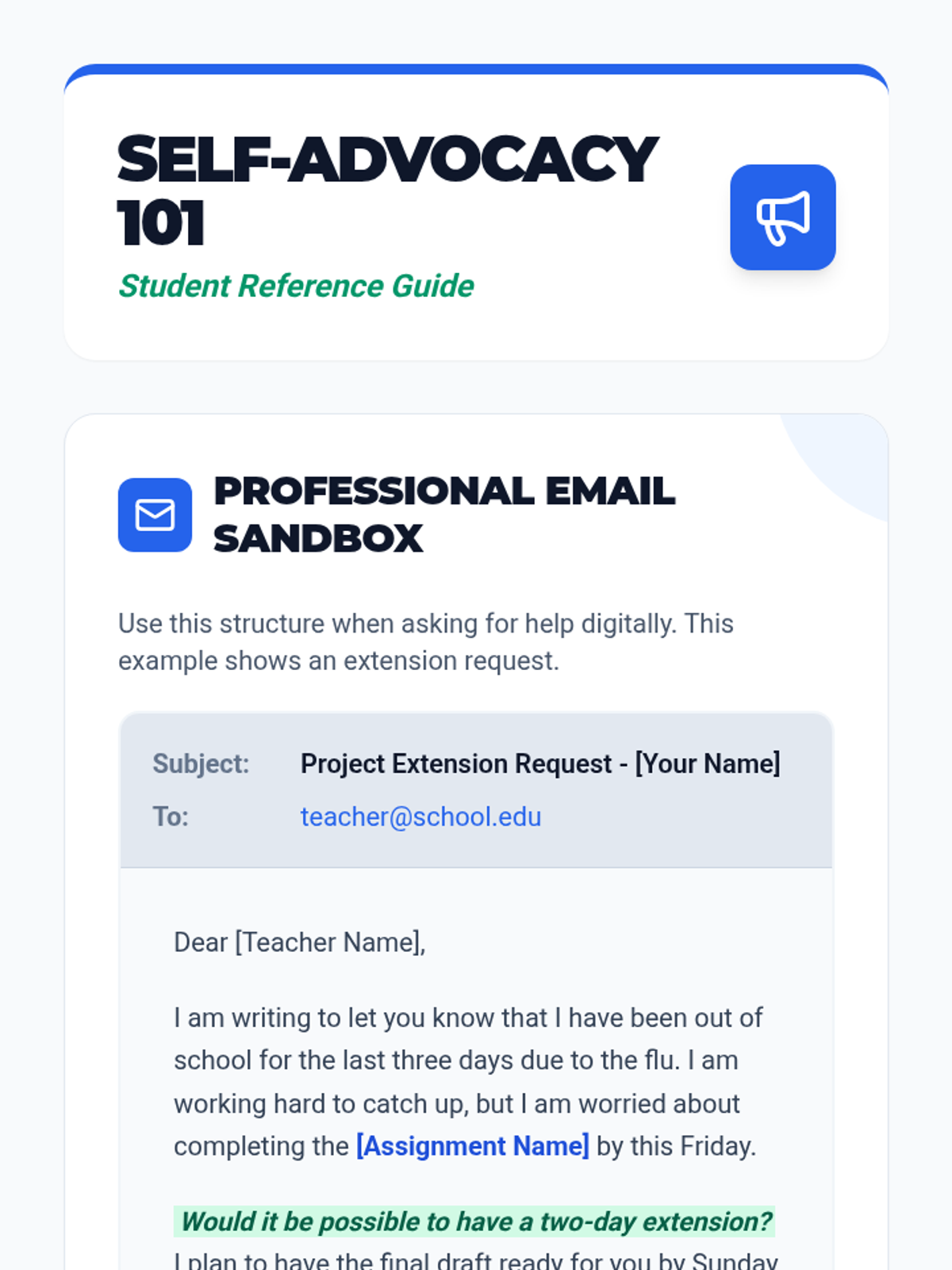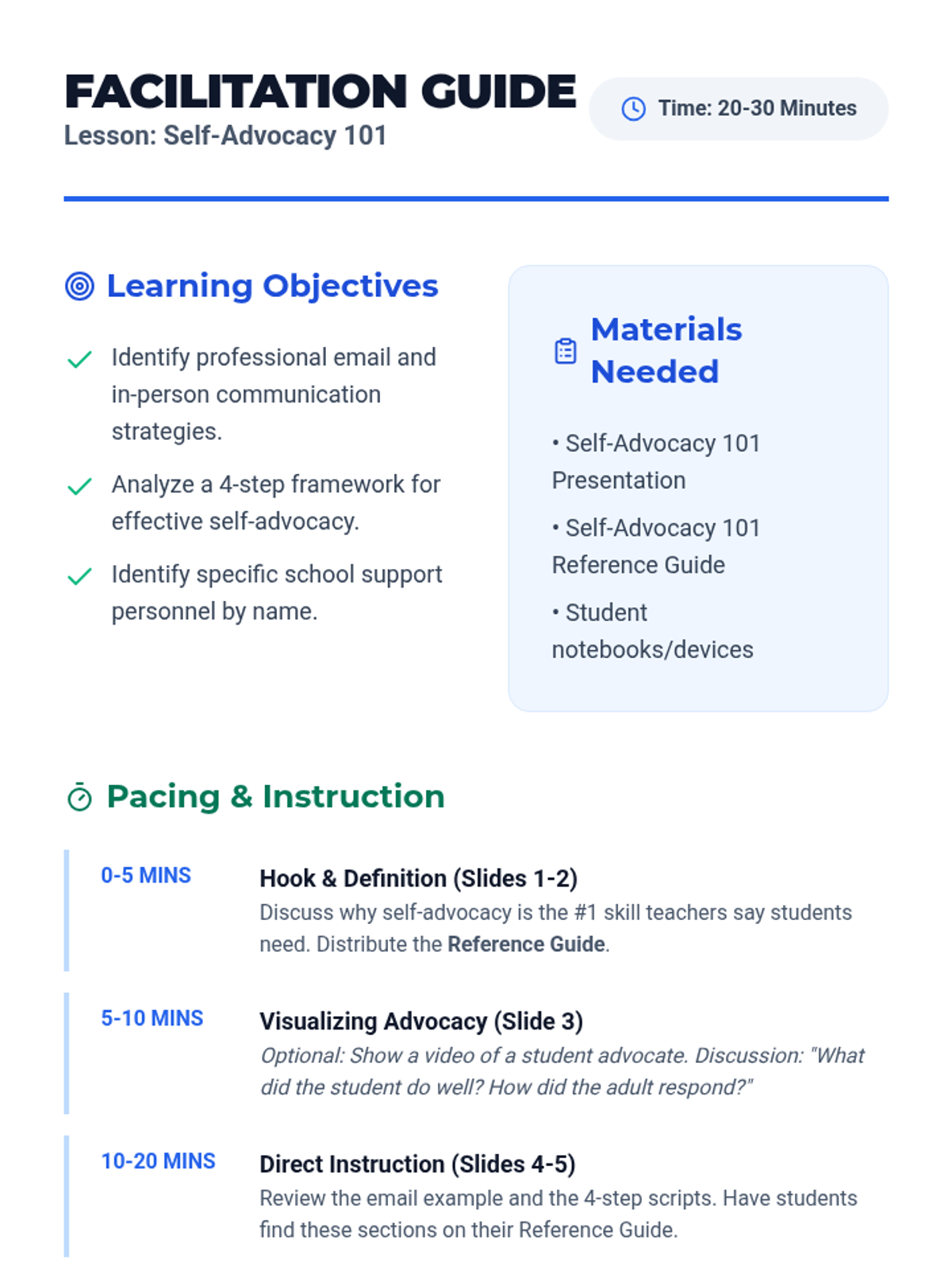 A introductory lesson designed to empower high school students with essential self-advocacy skills. Students learn to navigate professional communication via email and in-person requests, identifying their school support network and applying a 4-step advocacy framework.