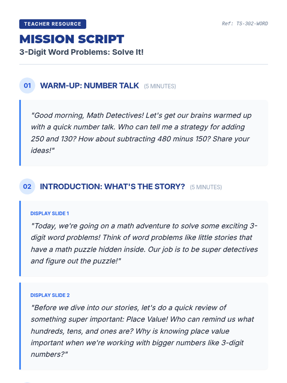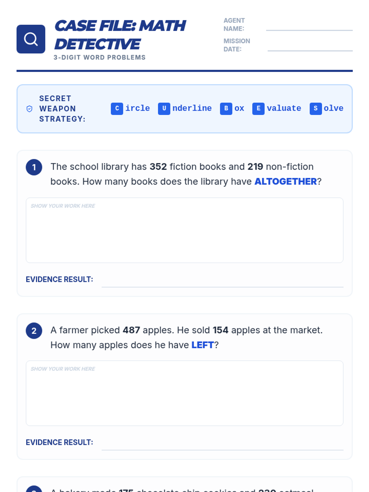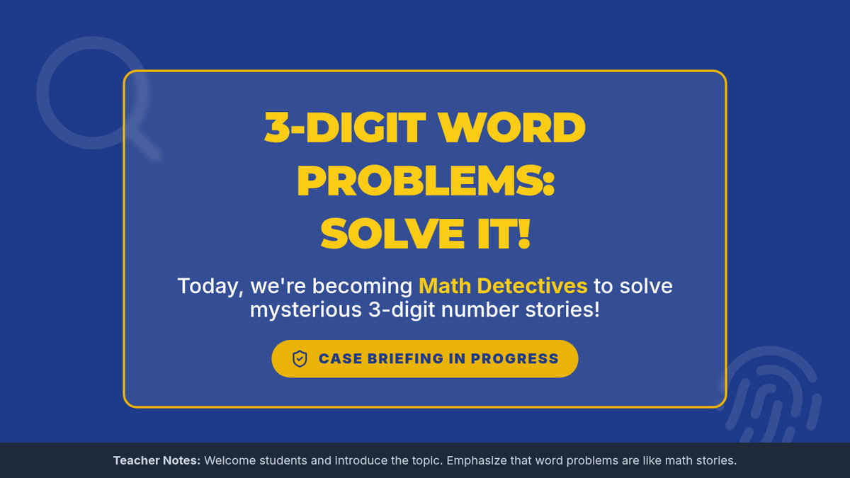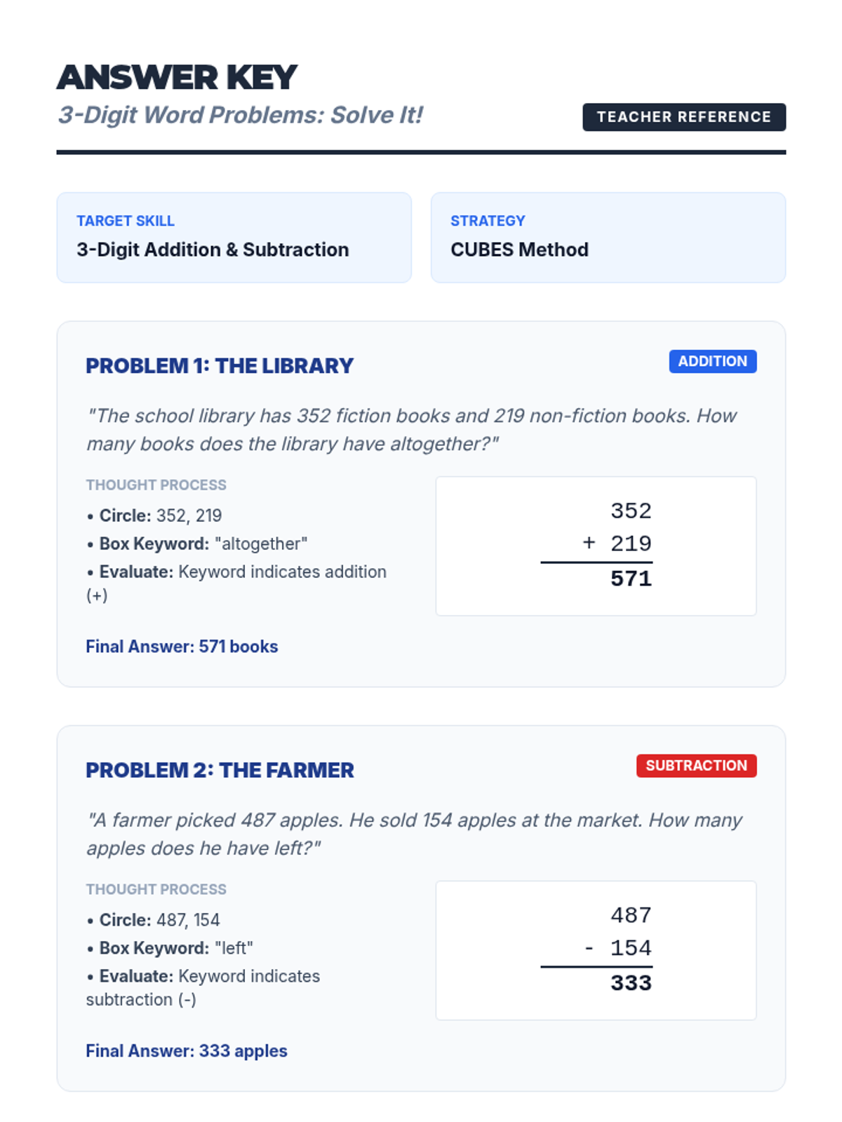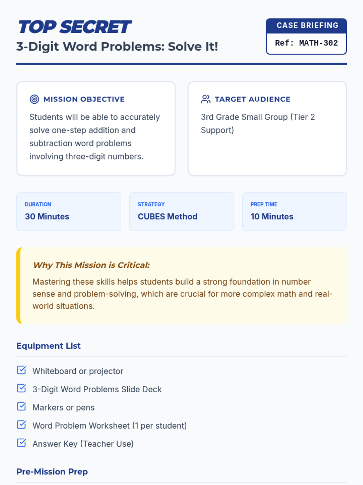 A 30-minute small group lesson for 3rd graders focusing on solving one-step addition and subtraction word problems with 3-digit numbers using the CUBES strategy.