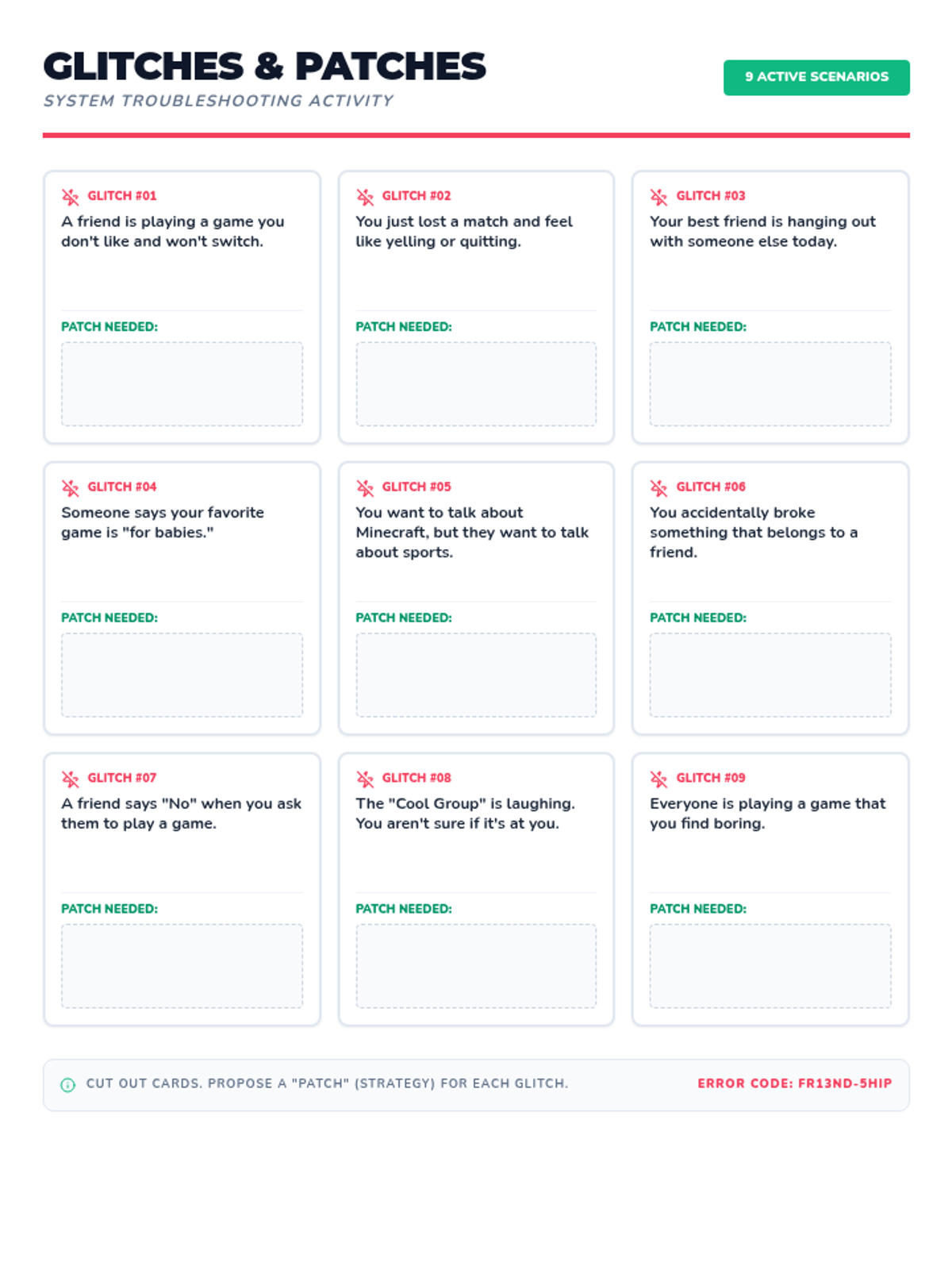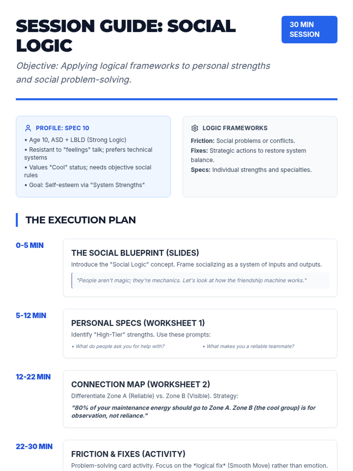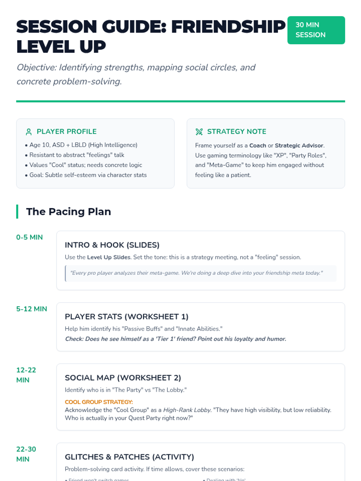 A 30-minute high-engagement individual counseling session for a student with ASD and LBLD, using a video game strategy theme to explore personal strengths and friendship dynamics.
