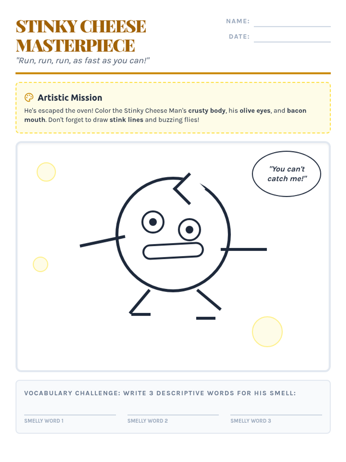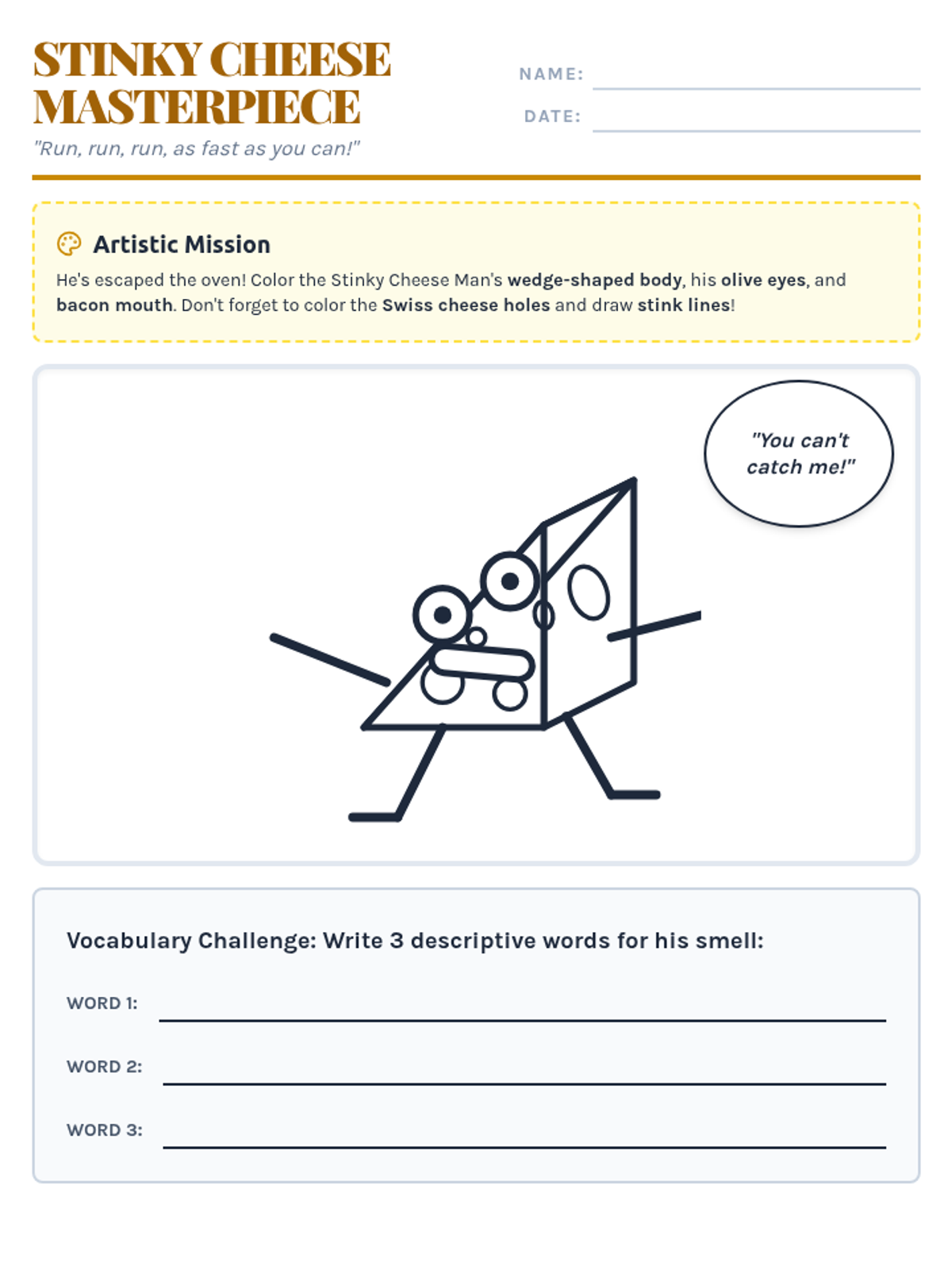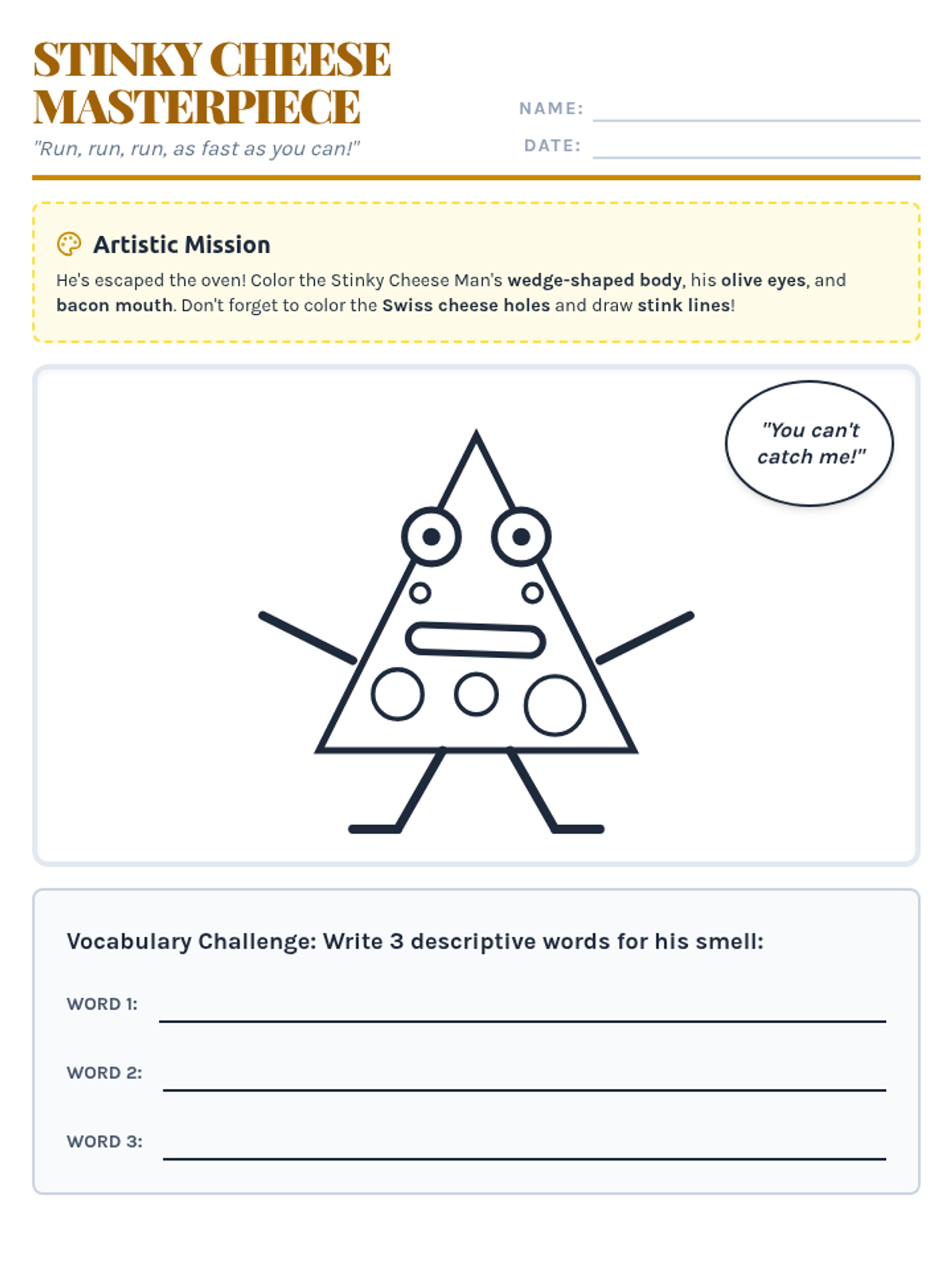 A collection of fun activities based on the classic book 'The Stinky Cheese Man', focusing on creative expression and vocabulary.