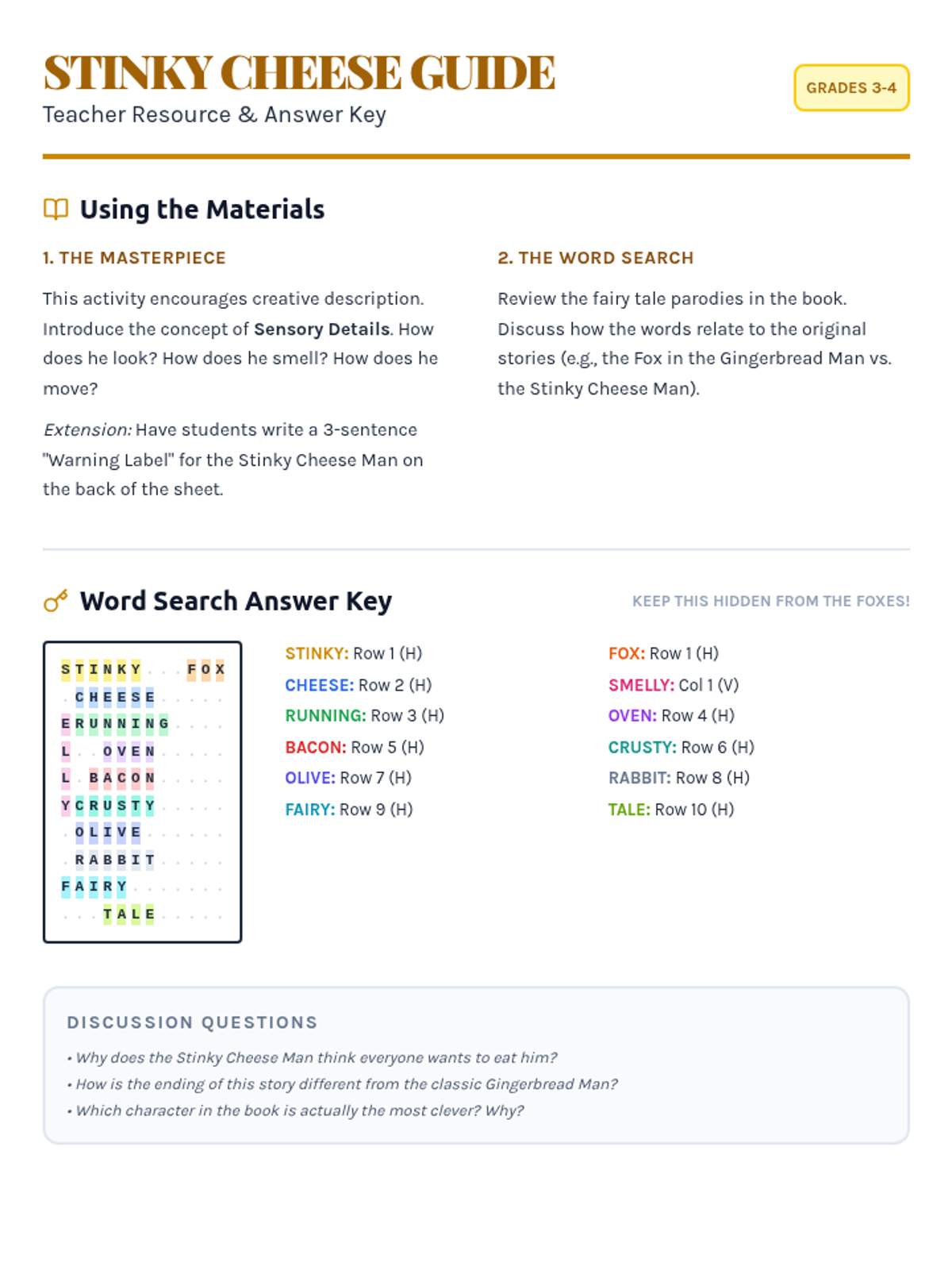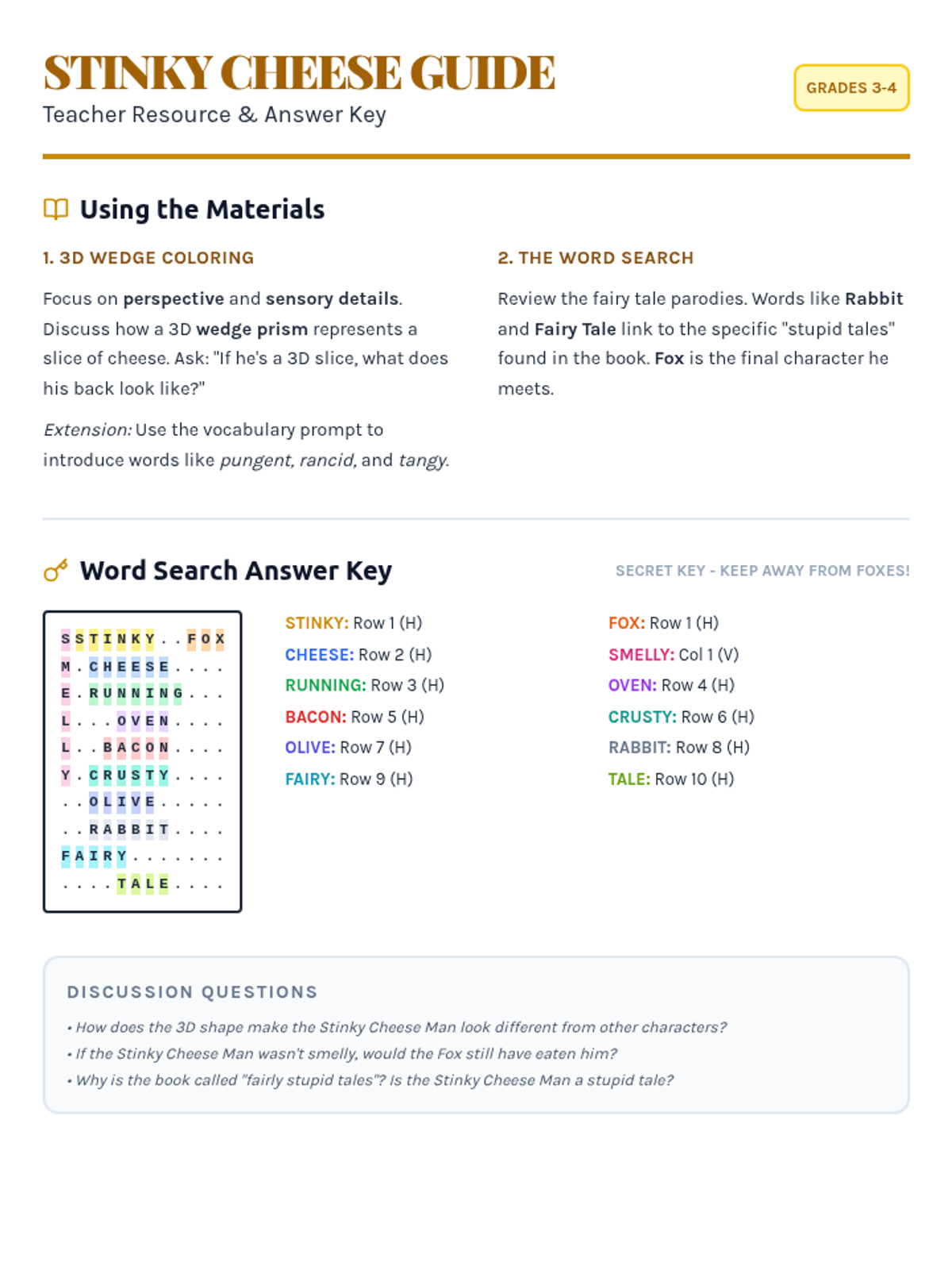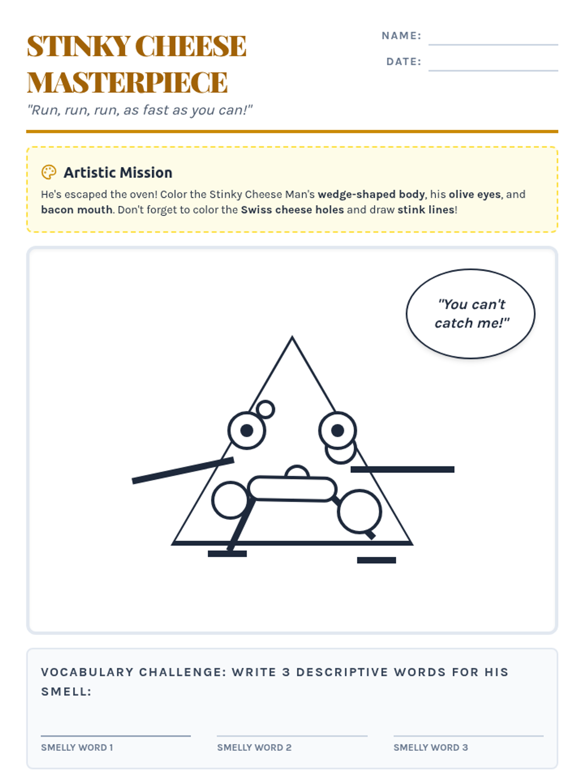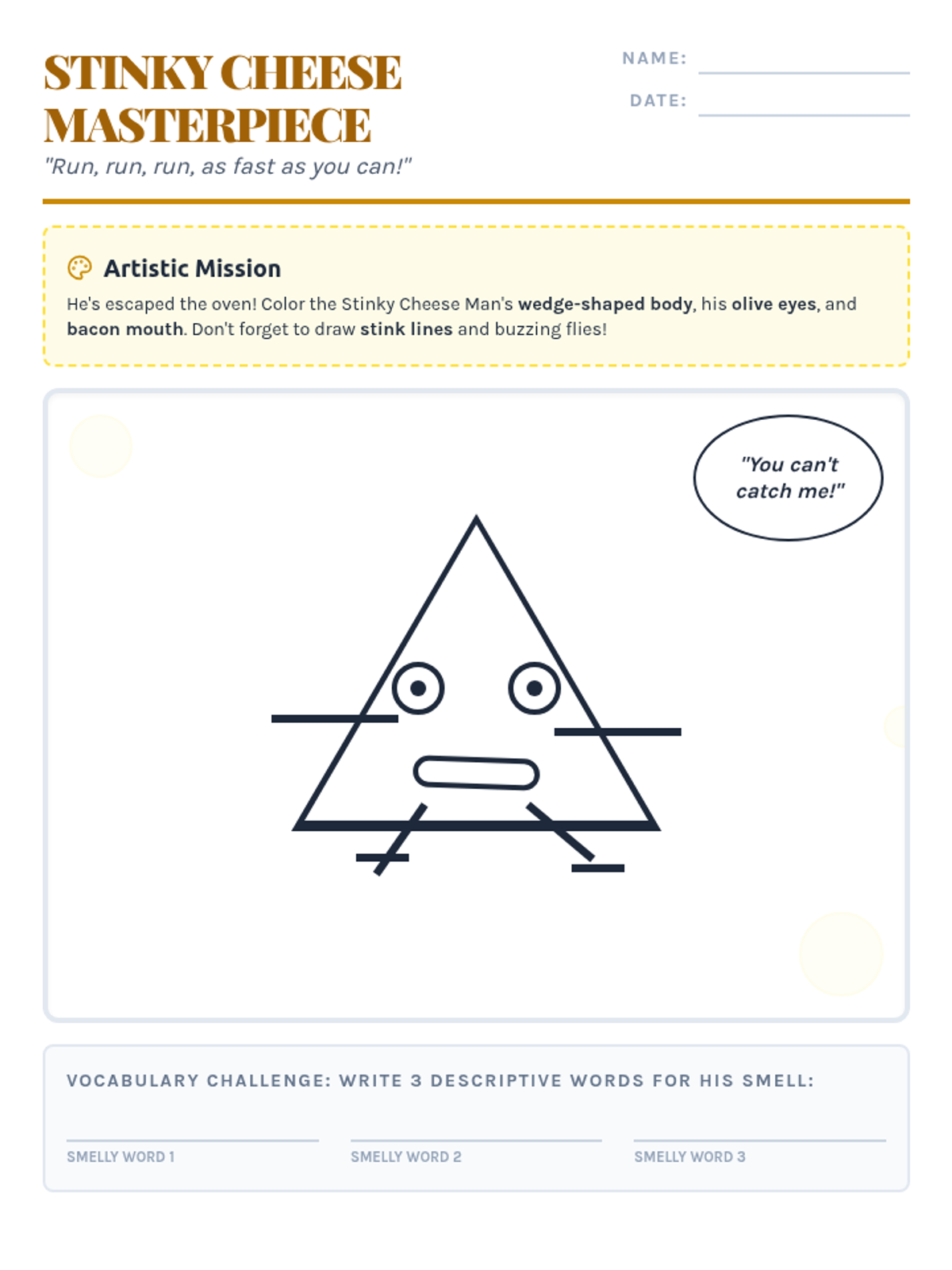 A collection of fun activities based on the classic book 'The Stinky Cheese Man', focusing on creative expression and vocabulary.