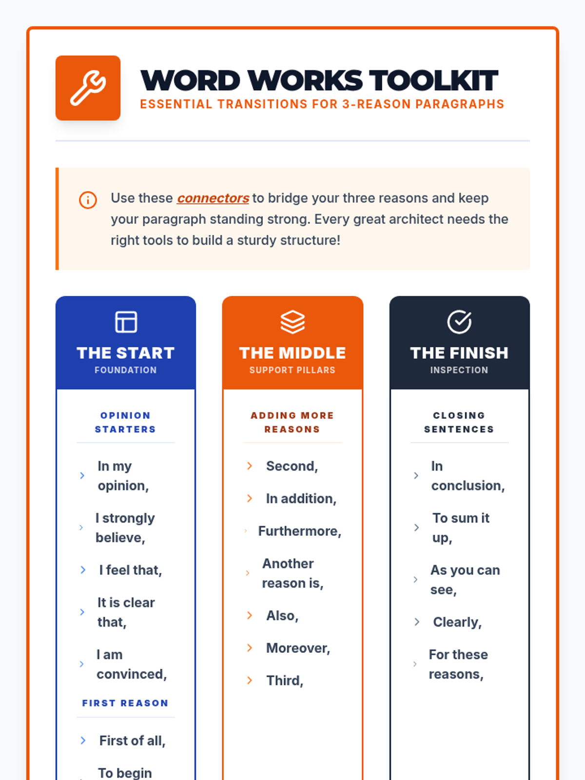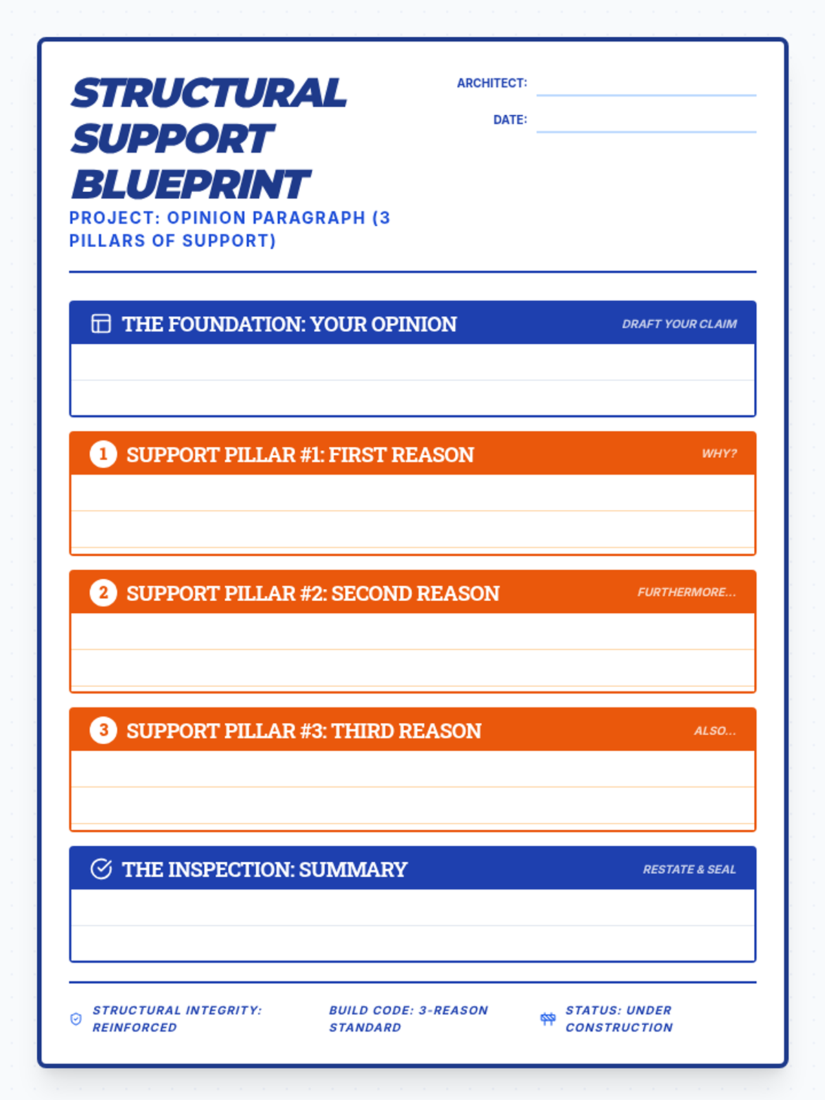 A comprehensive guide to building strong opinion paragraphs using a three-reason structural blueprint, designed with visual supports for 6th-grade special education students.