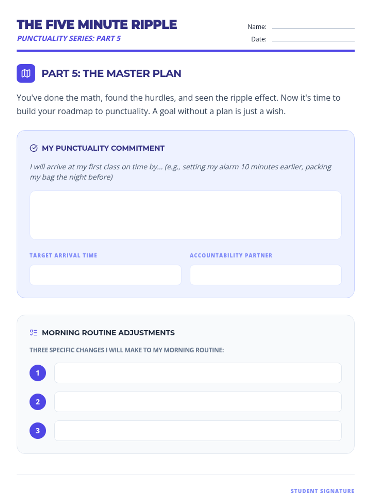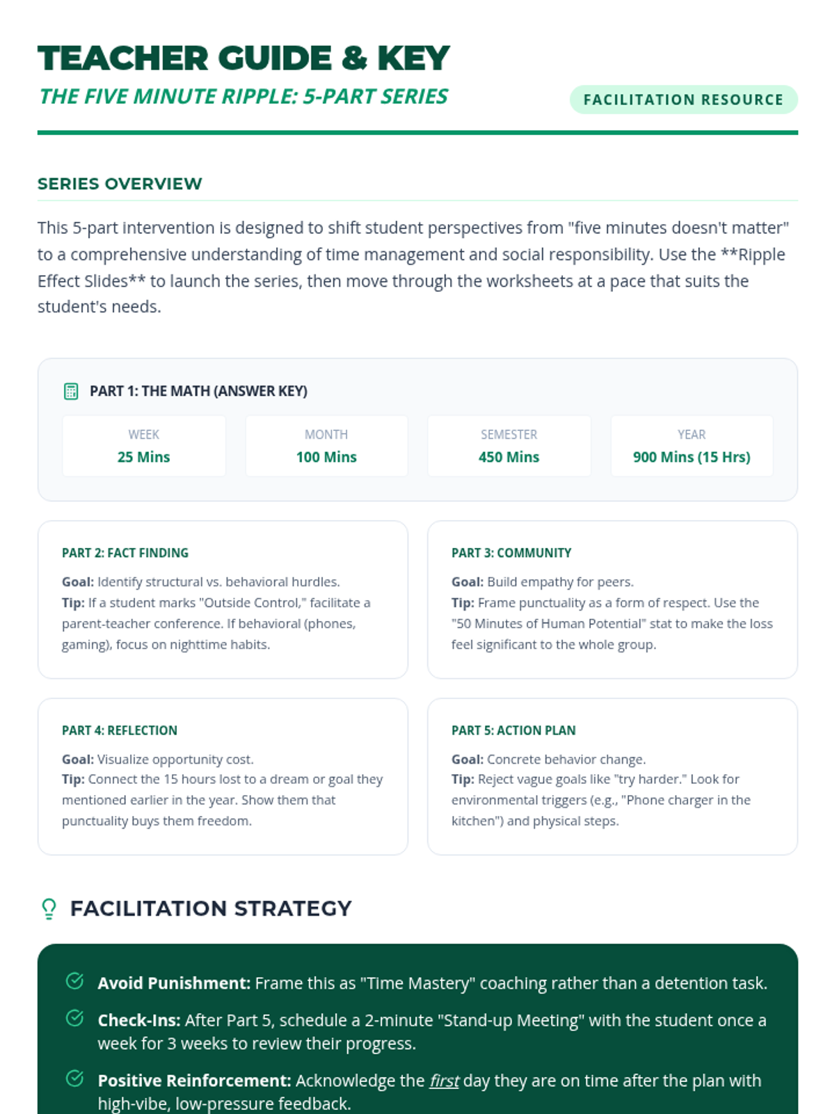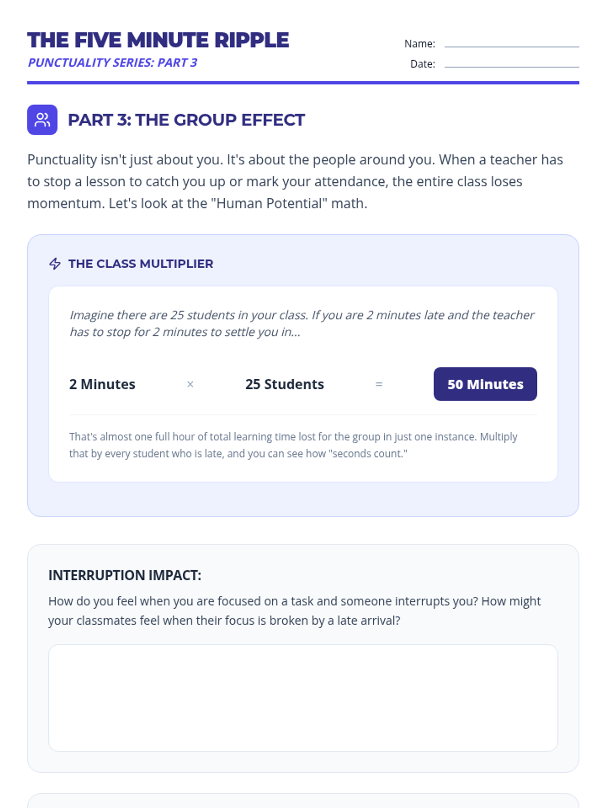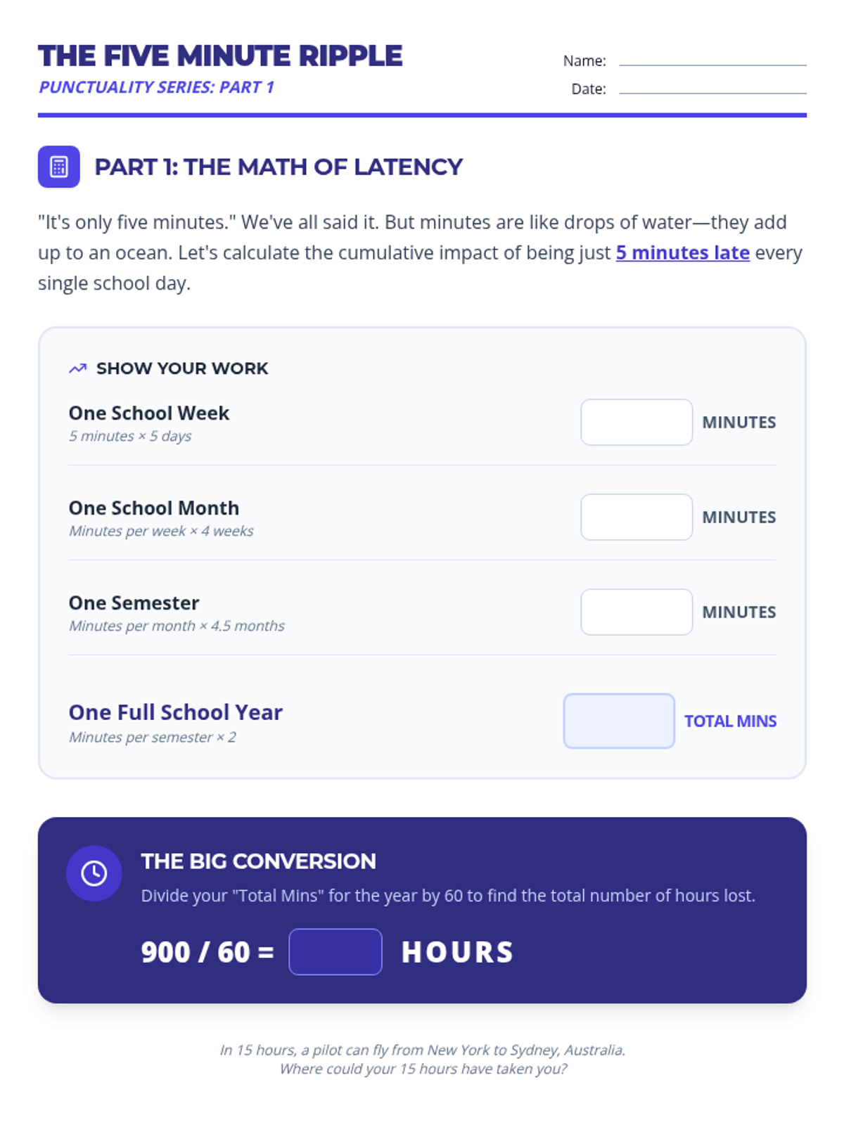 A lesson designed to help middle school students understand the cumulative impact of being late to school. Students calculate lost time, reflect on the value of short intervals, and develop a plan for punctuality.