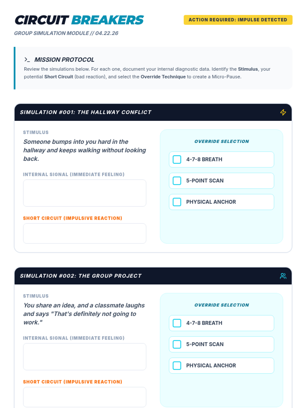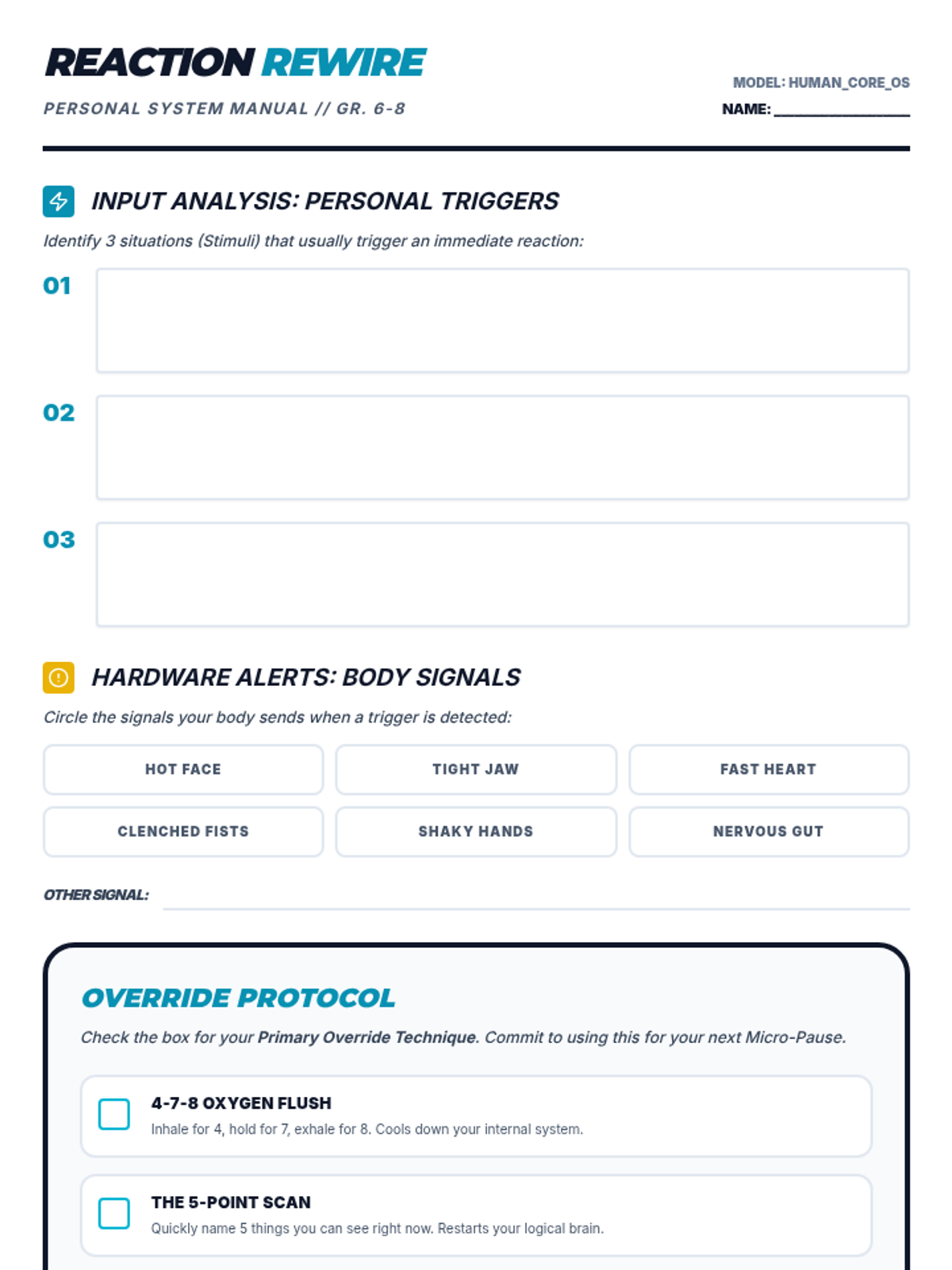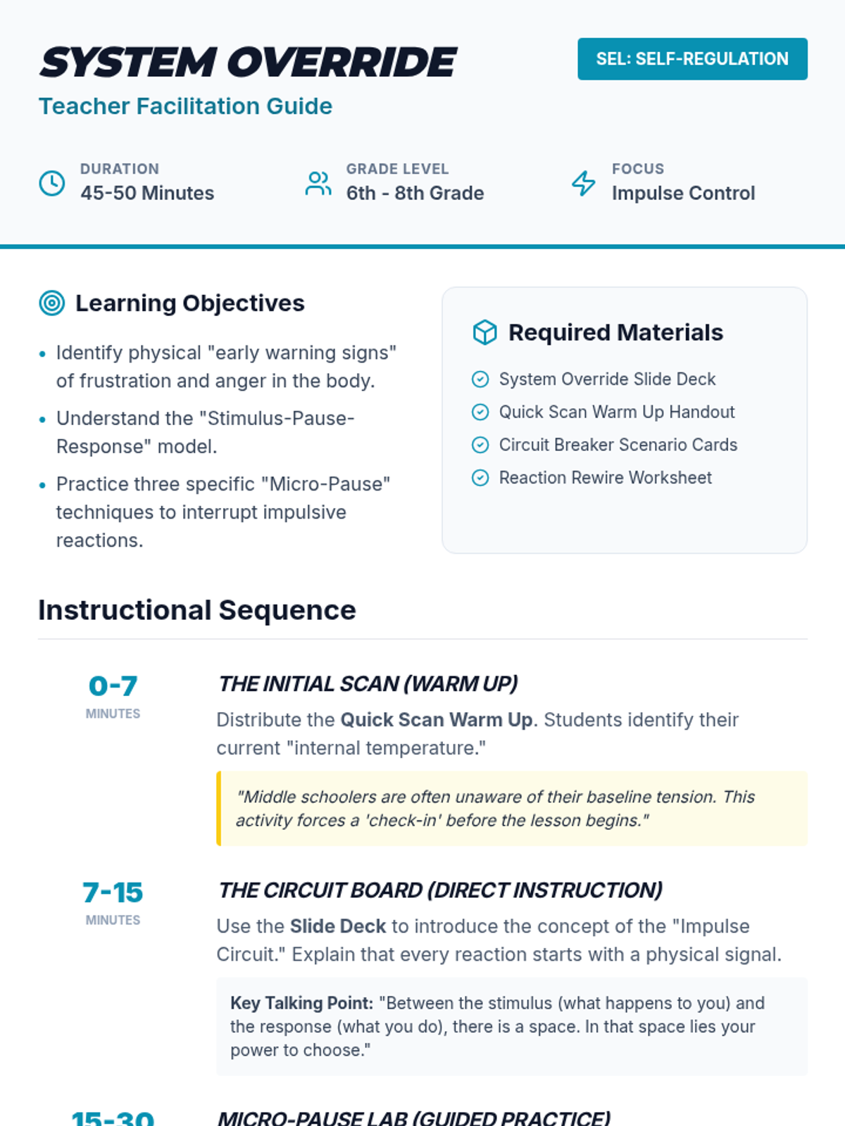 A social-emotional learning lesson for middle schoolers focused on identifying physical triggers and using 'micro-pauses' to regulate impulsive reactions. Students learn to recognize the 'body signals' of frustration or anger and apply brief techniques to regain control before responding.