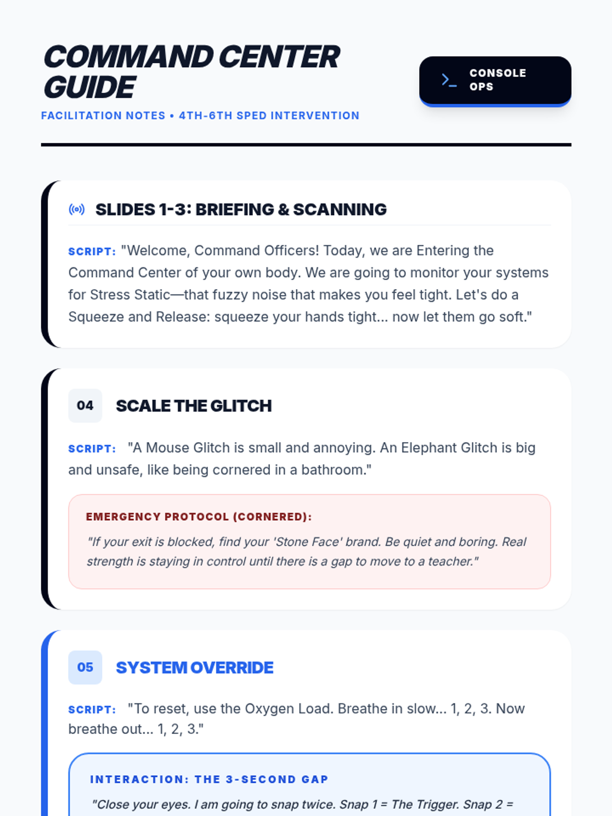 A specialized 15-20 minute stress management lesson for 4th-6th grade Special Education students. Focuses on identifying body signals through a 'Command Center' theme, scaling stressors (Mouse vs. Elephant), and using immediate sensory-based grounding tools.