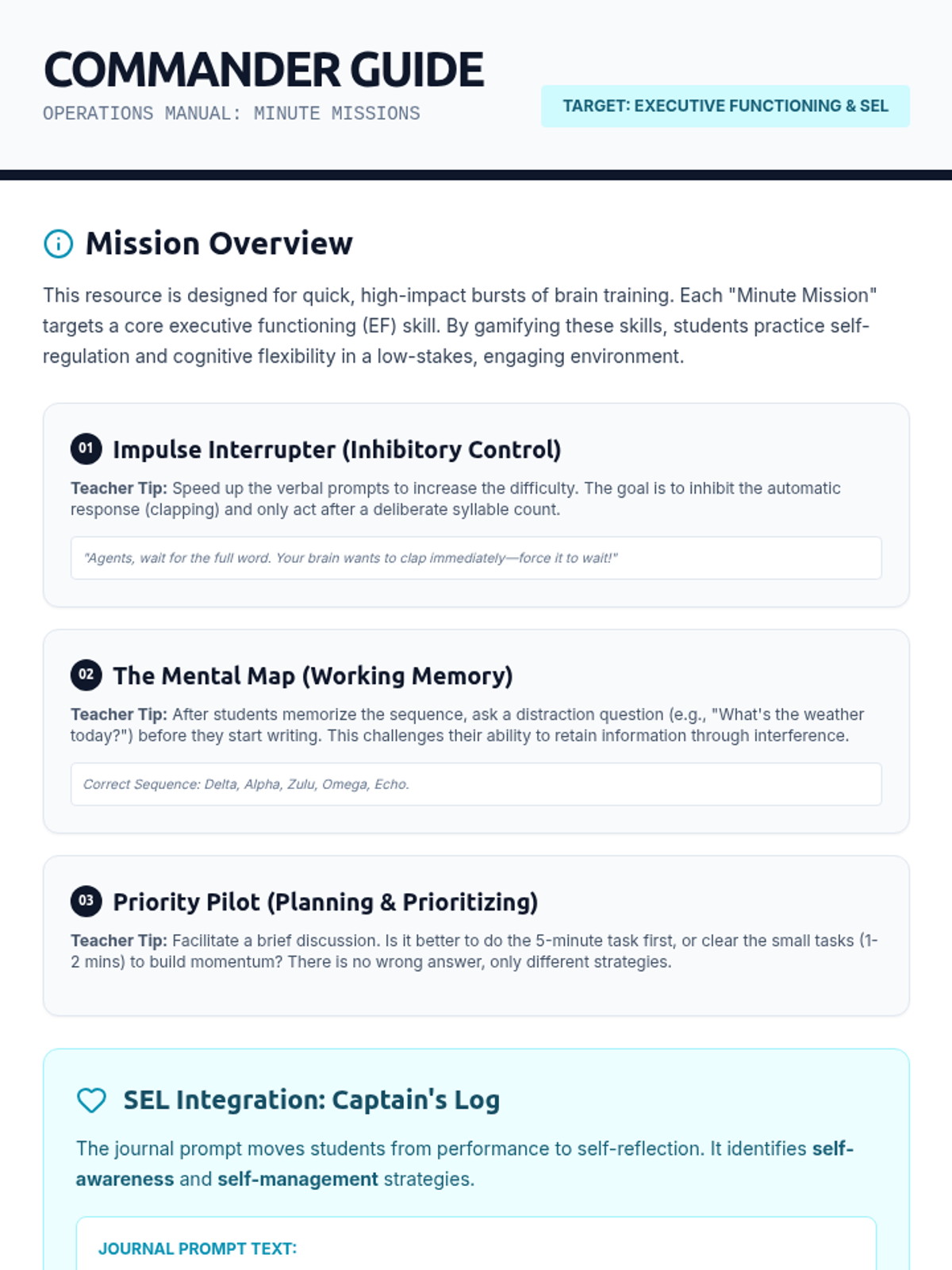A series of rapid-fire 'Minute Missions' designed to strengthen executive functioning skills like impulse control, planning, and focus, paired with an SEL journal reflection.