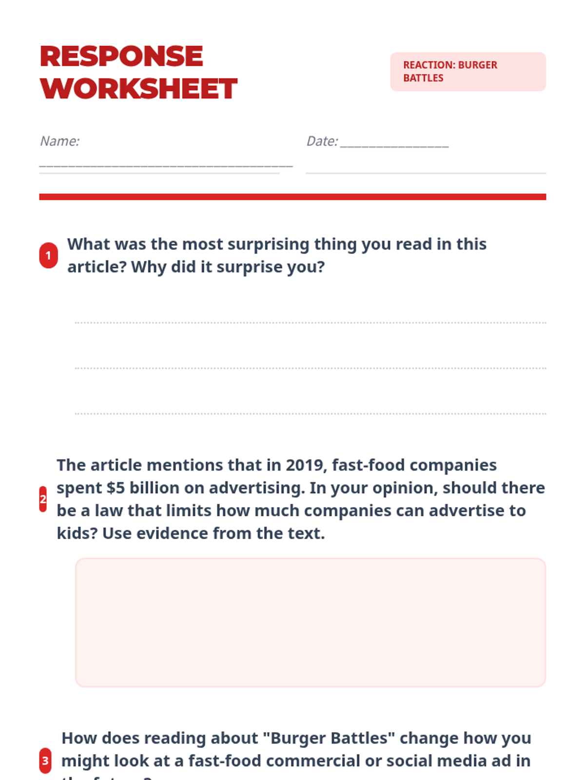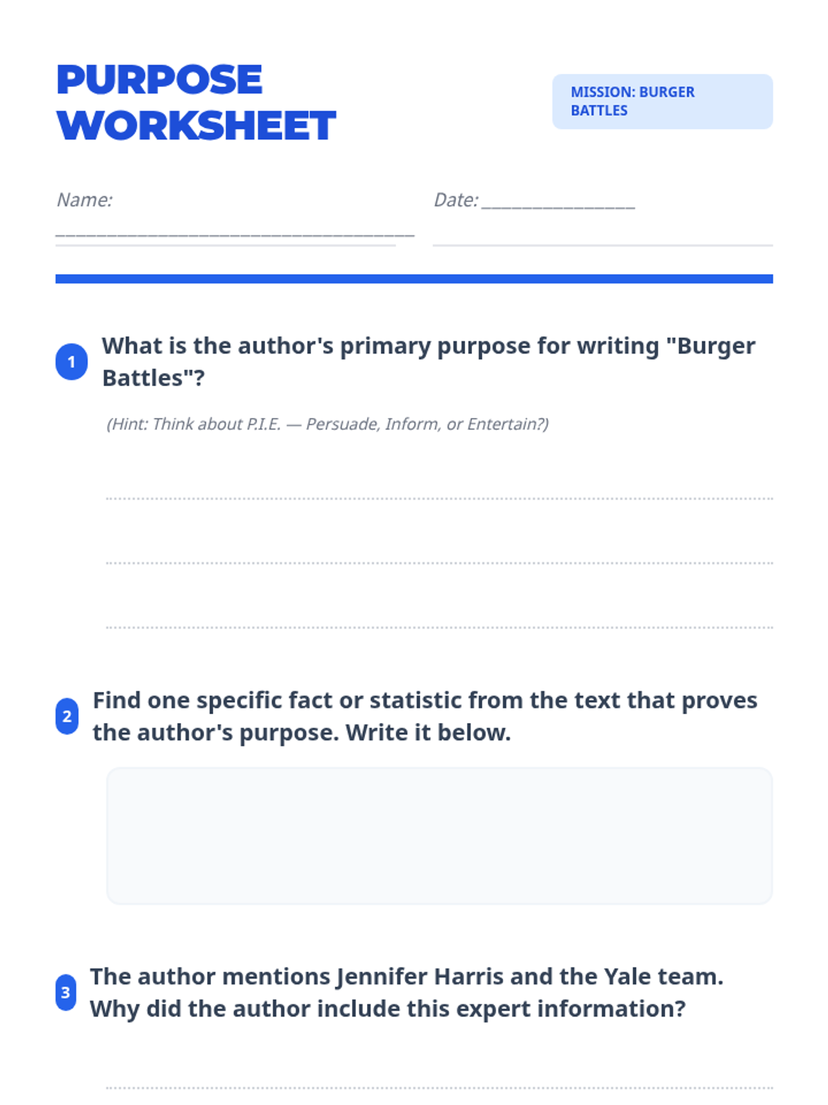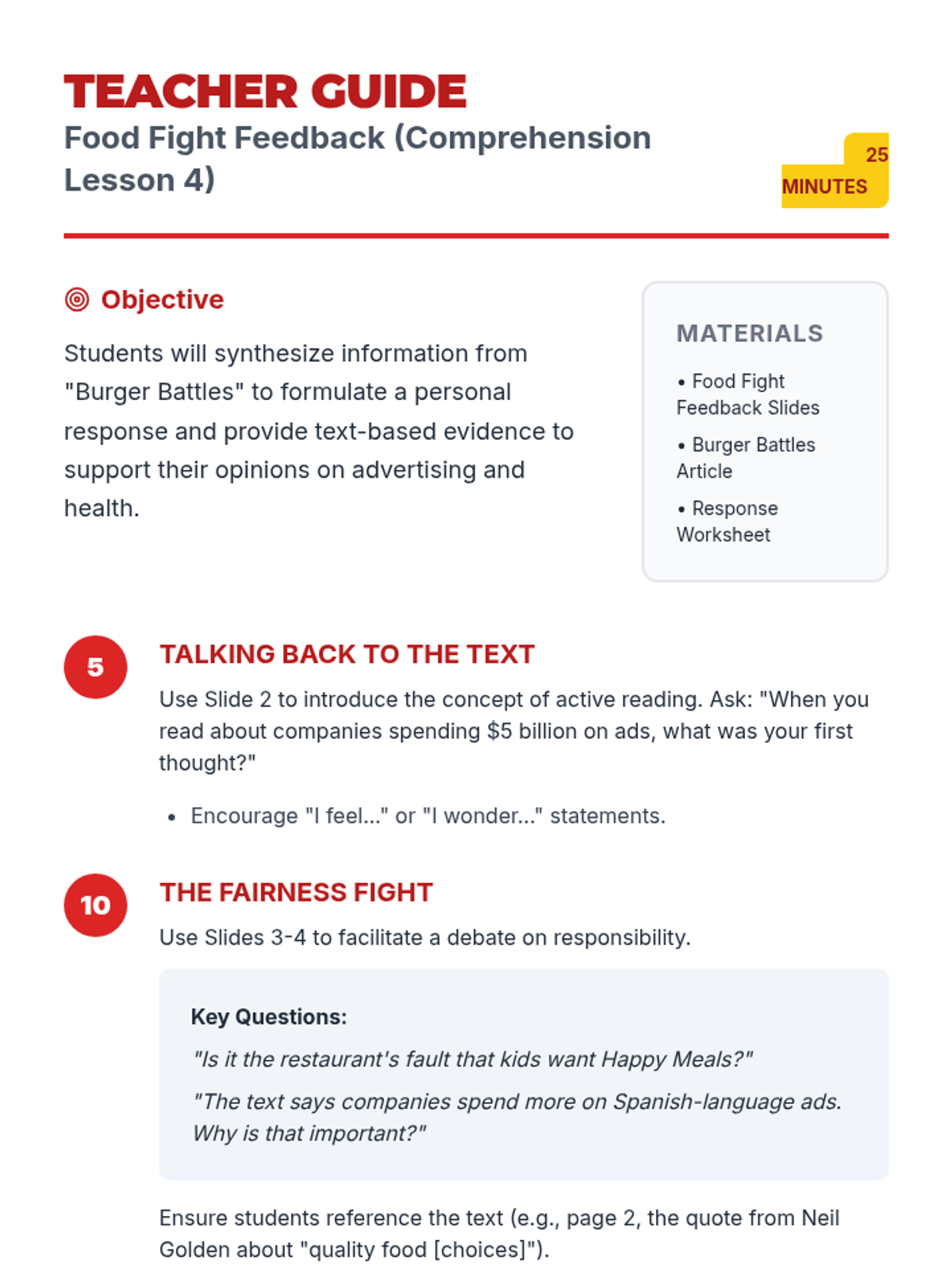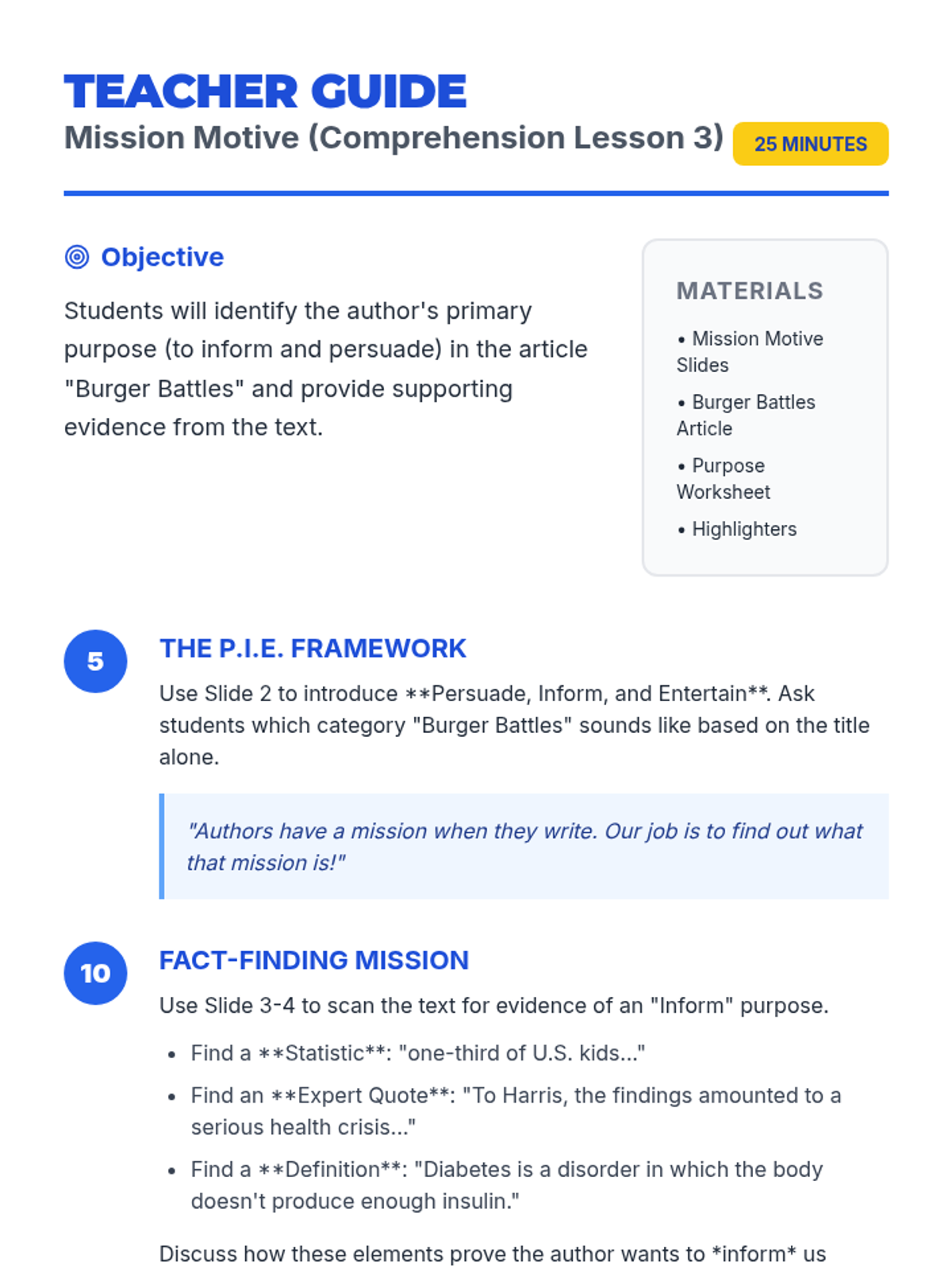 The first comprehension intervention lesson focused on identifying the author's purpose in the 'Burger Battles' article.