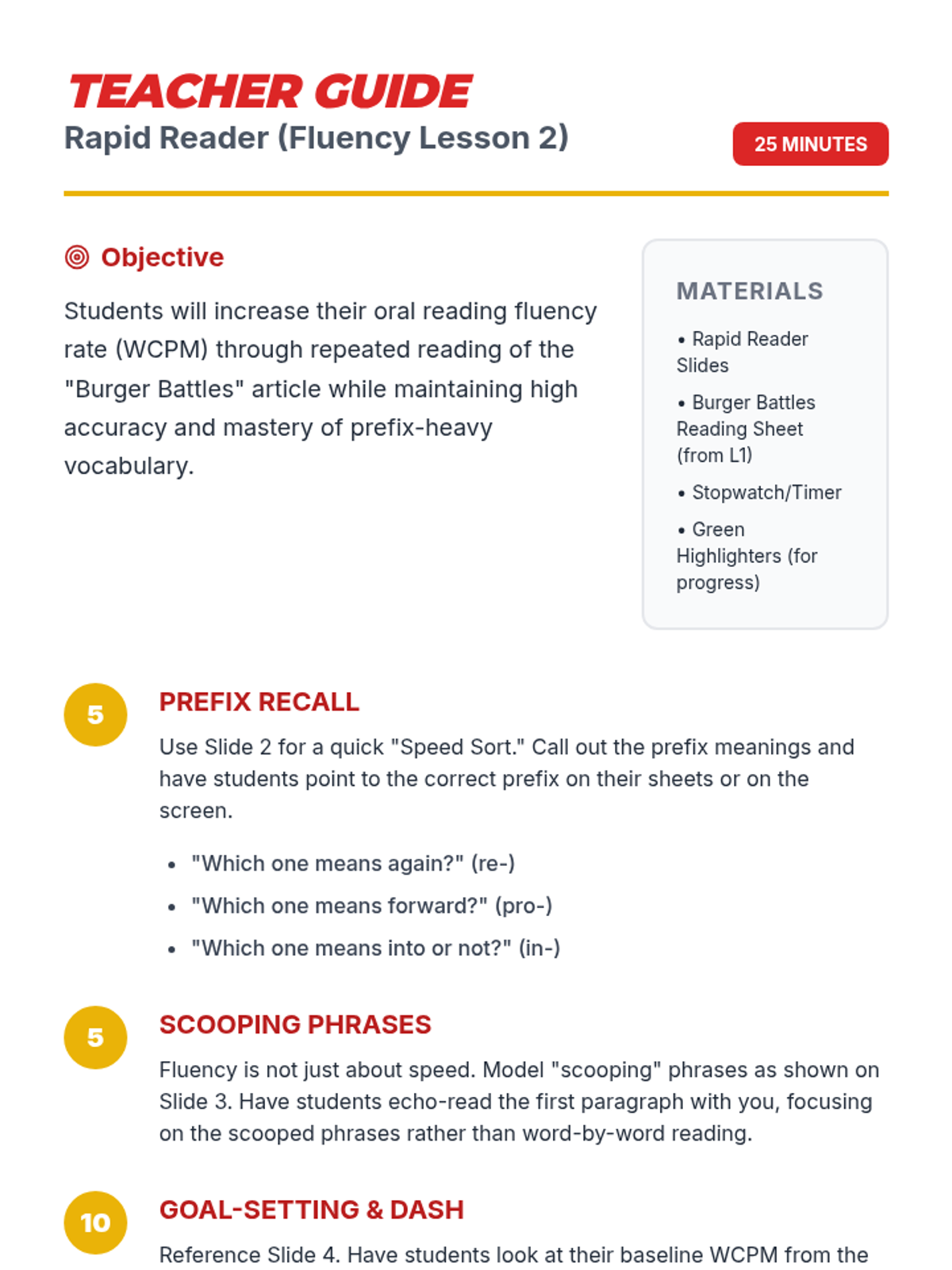 The second fluency intervention lesson focusing on prefix mastery and repeated 1-minute timed readings to increase reading rate.