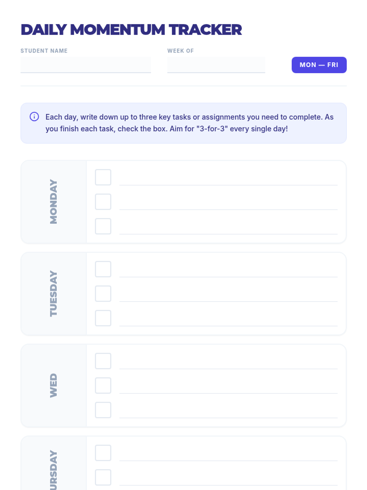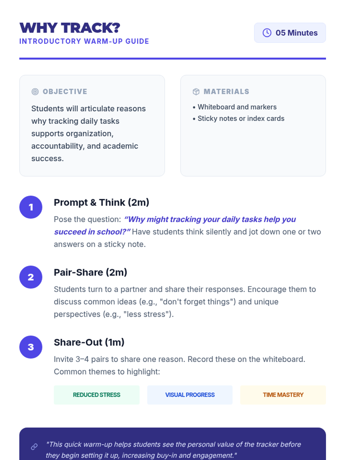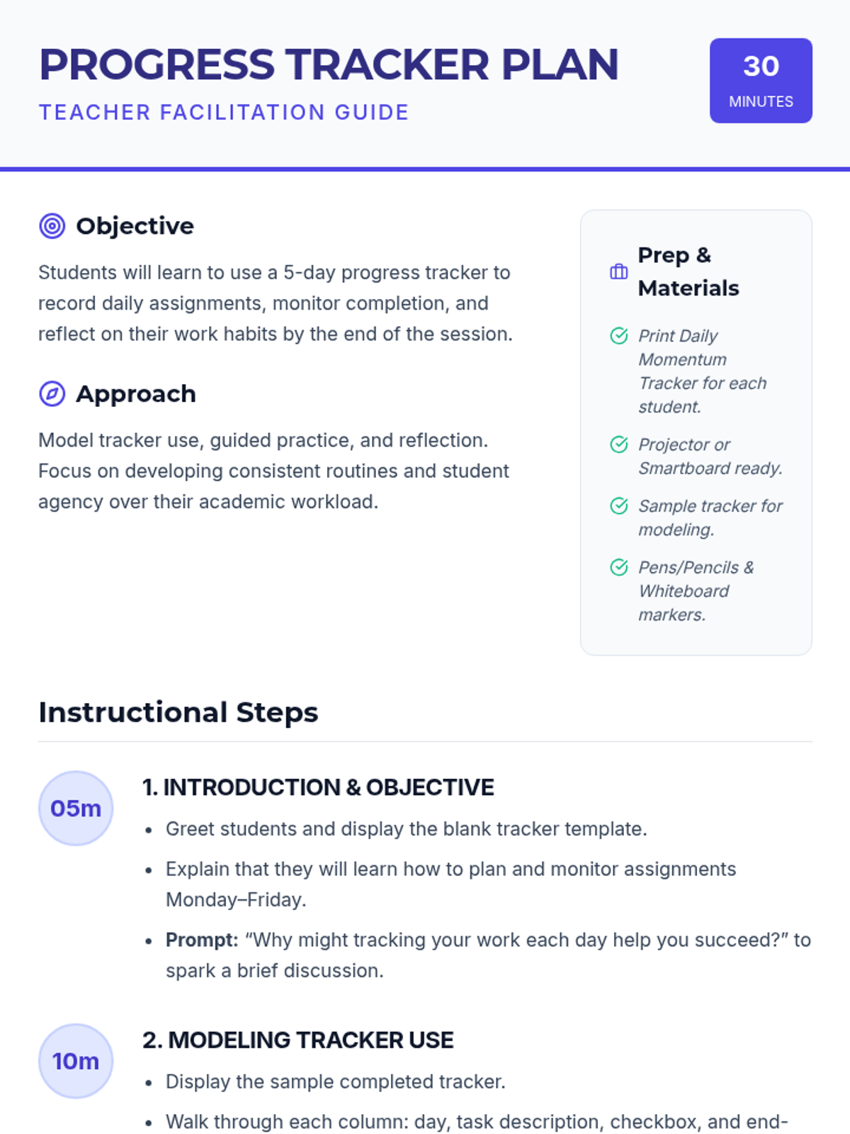 A 30-minute session for 9th graders to master time management and organization through daily progress tracking and reflection.