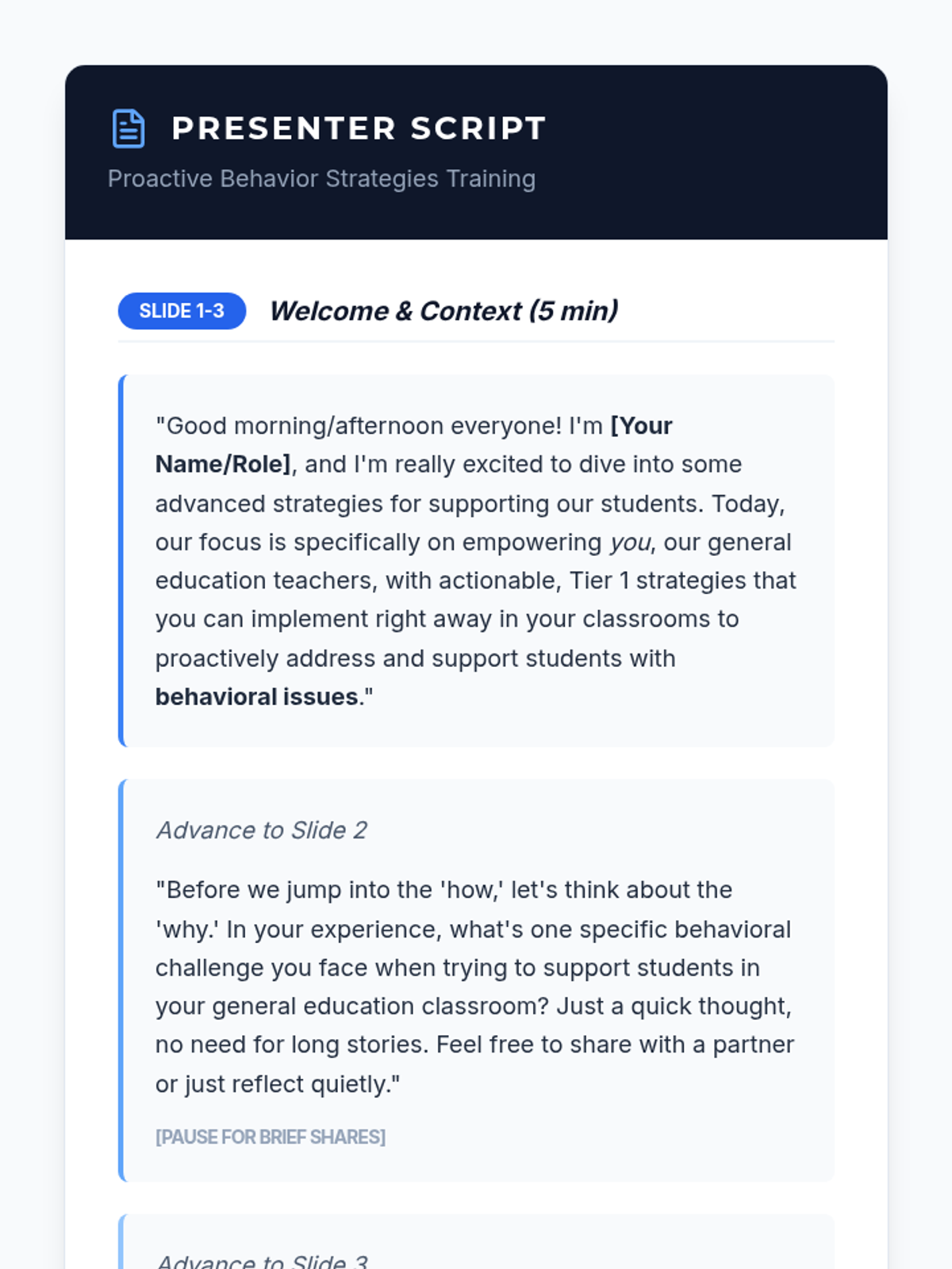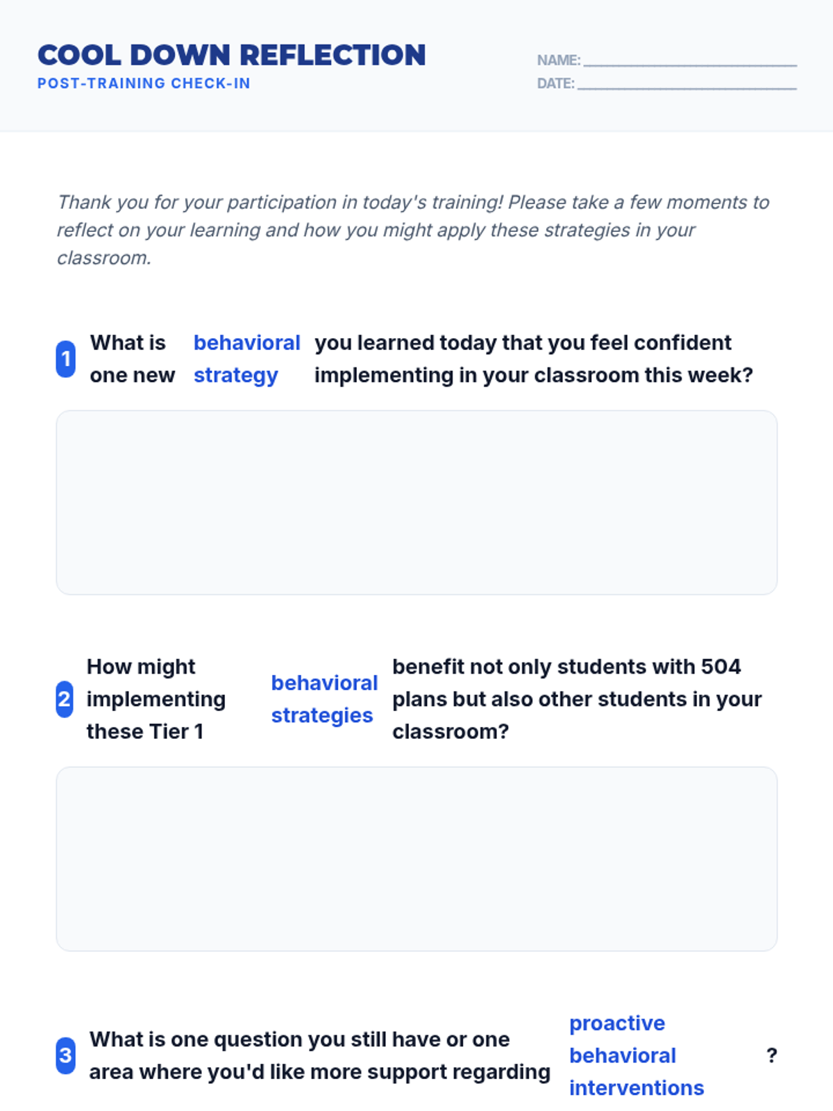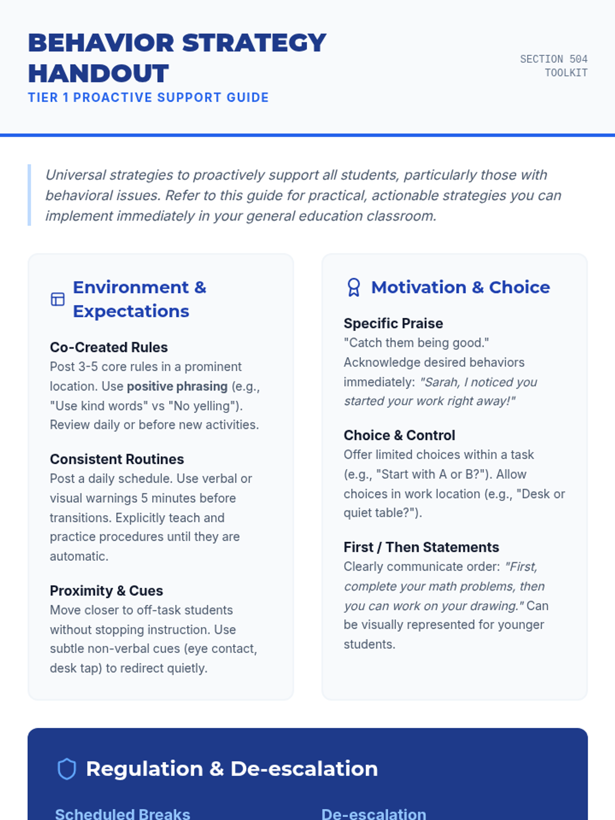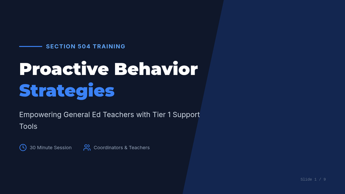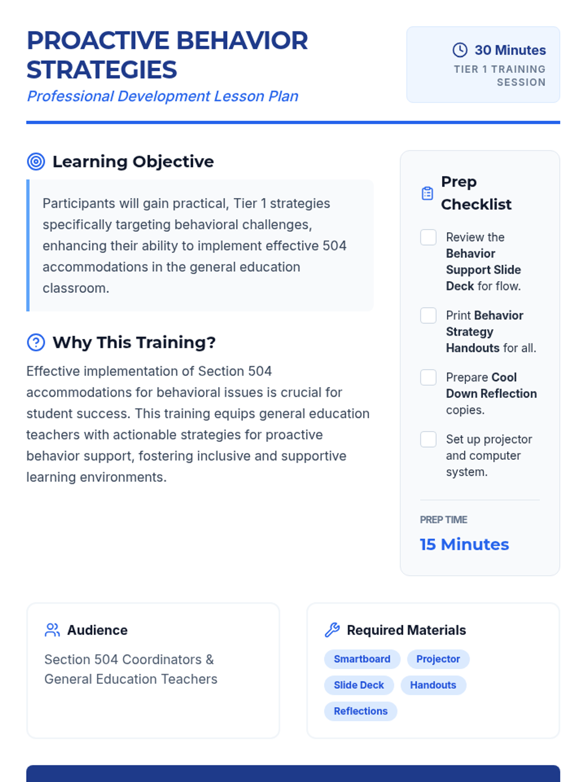 A 30-minute professional development session for 504 coordinators and general education teachers, focusing on proactive Tier 1 behavioral strategies, understanding the root causes of behavior, and practical classroom implementation.