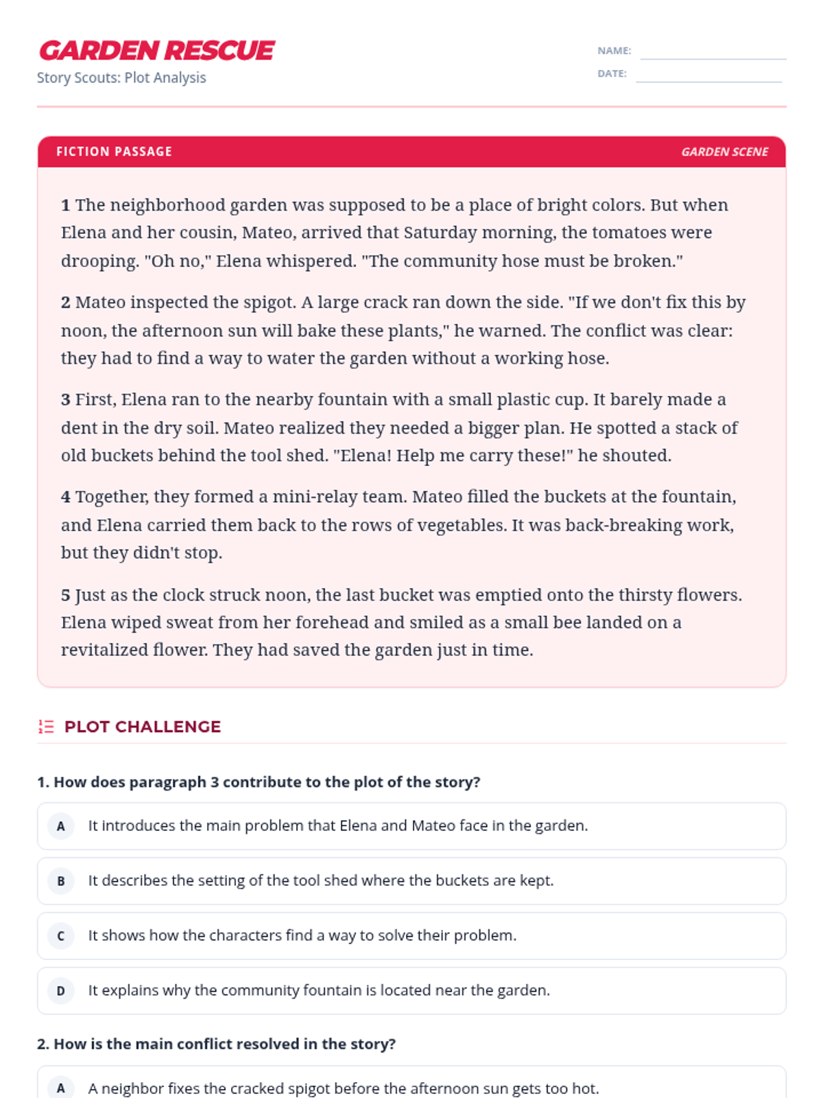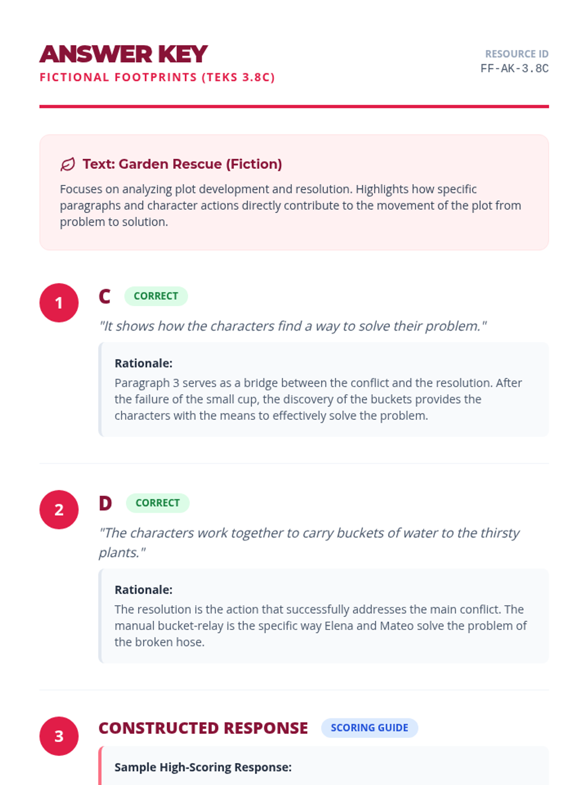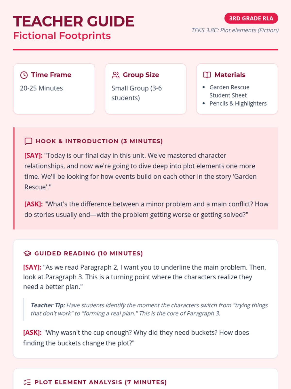 A small group reteach lesson focused on analyzing plot elements, sequence, and resolution within a short fiction text.