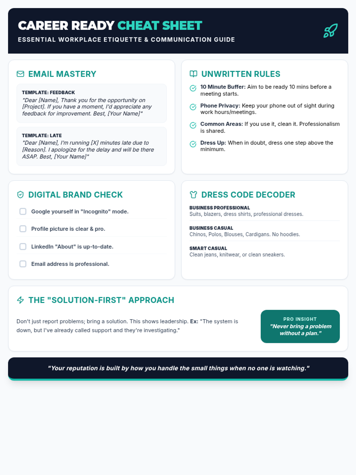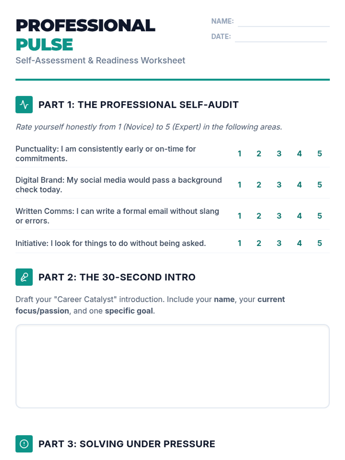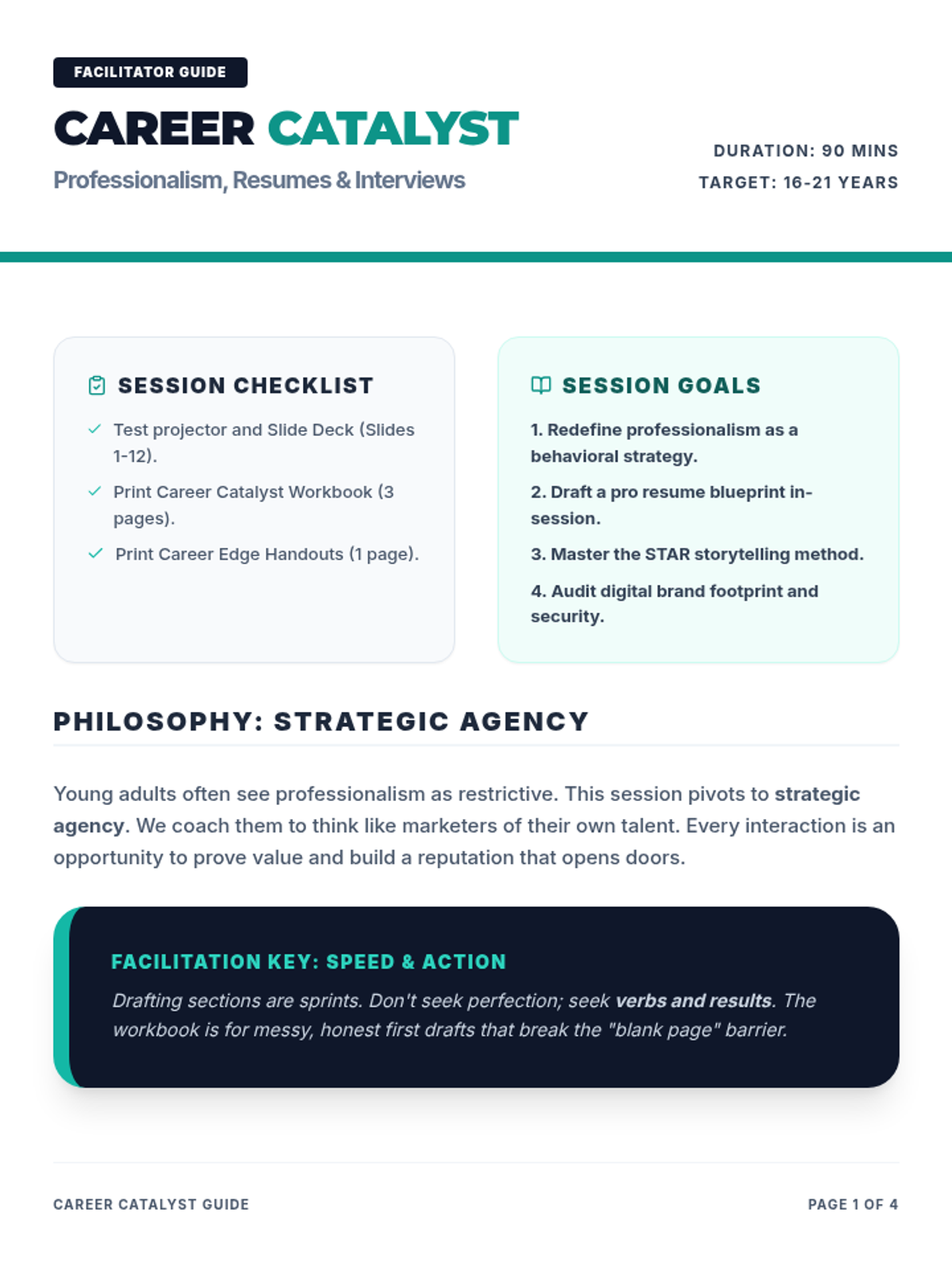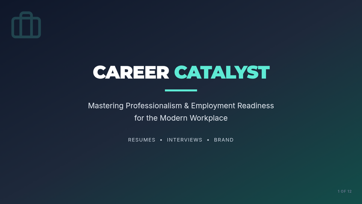 A comprehensive 90-minute session for young adults aged 16-21, focusing on the transition from student to professional through communication, reliability, and workplace etiquette.