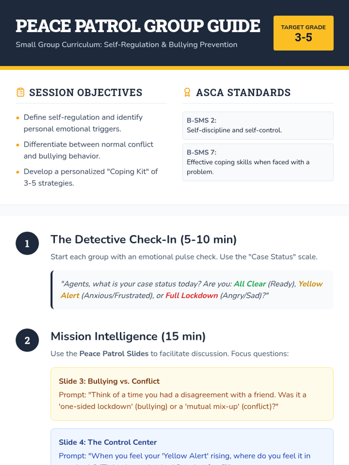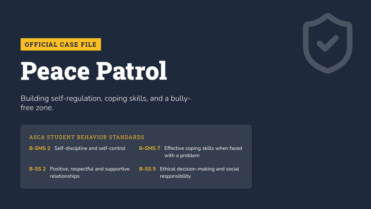 A small group curriculum focused on developing self-regulation skills, identifying bullying behaviors, and practicing effective coping strategies through a detective-themed 'Peace Patrol' lens.