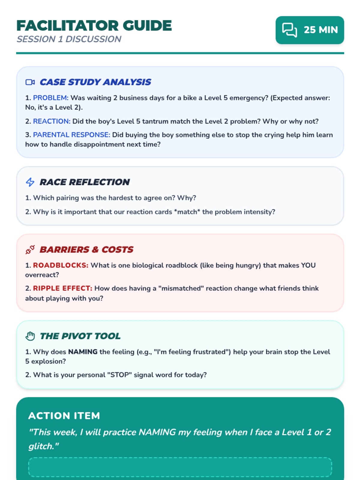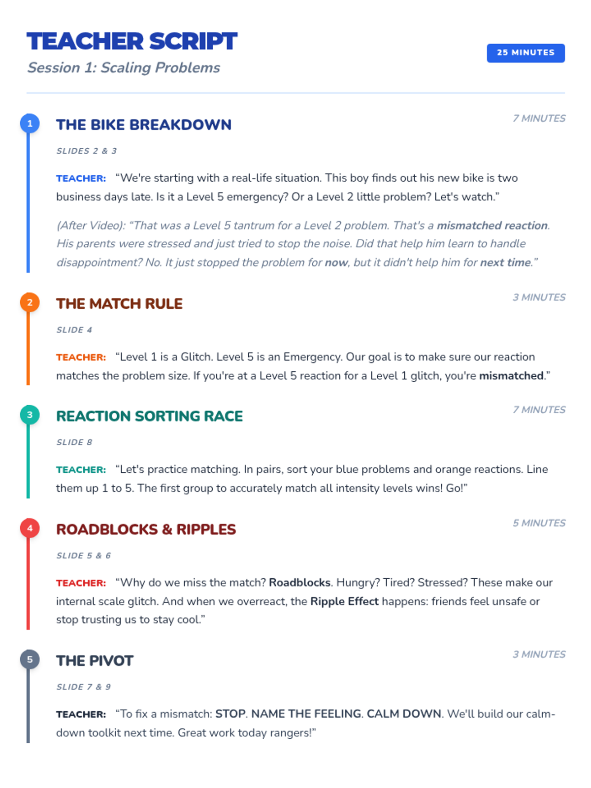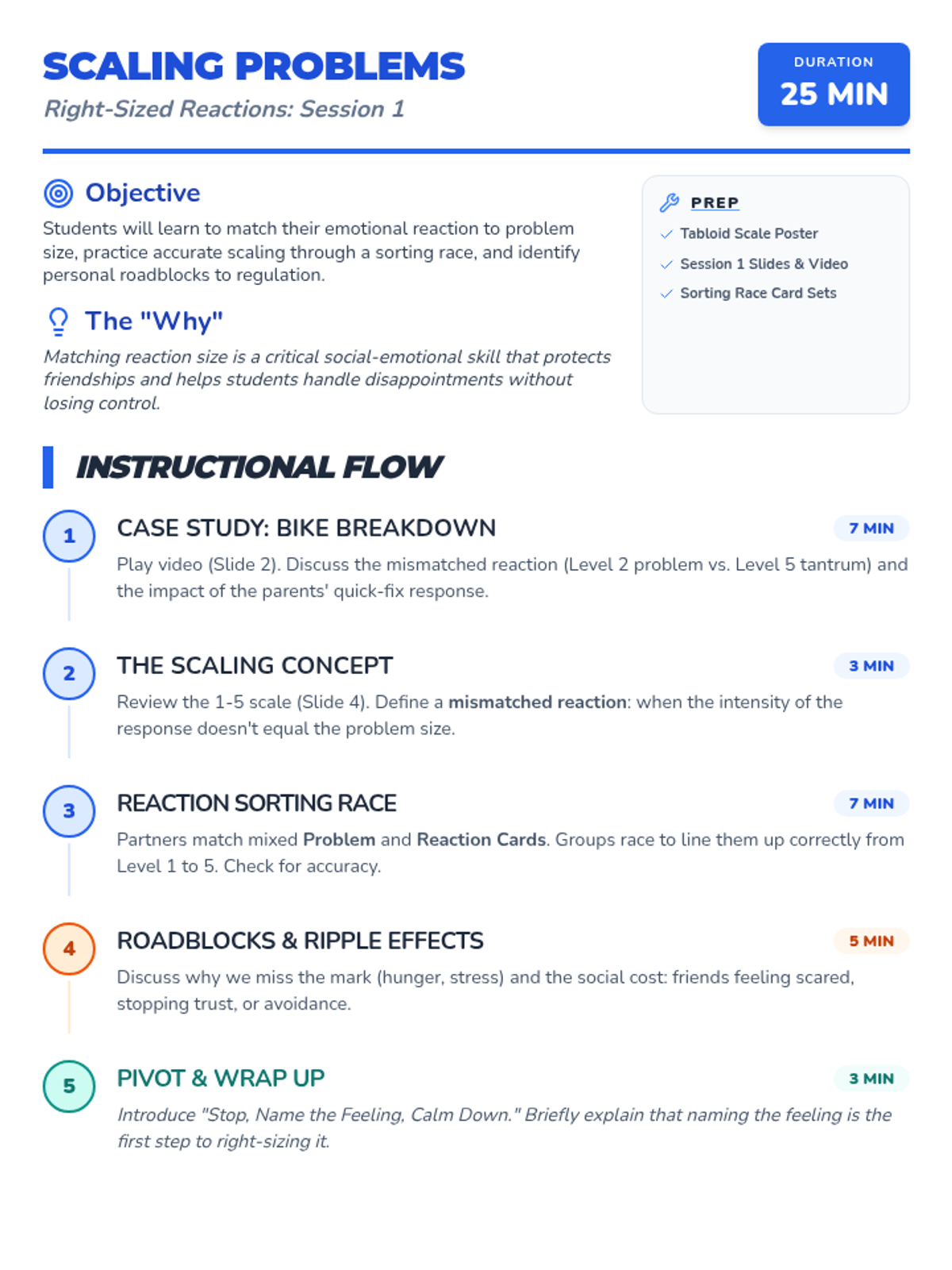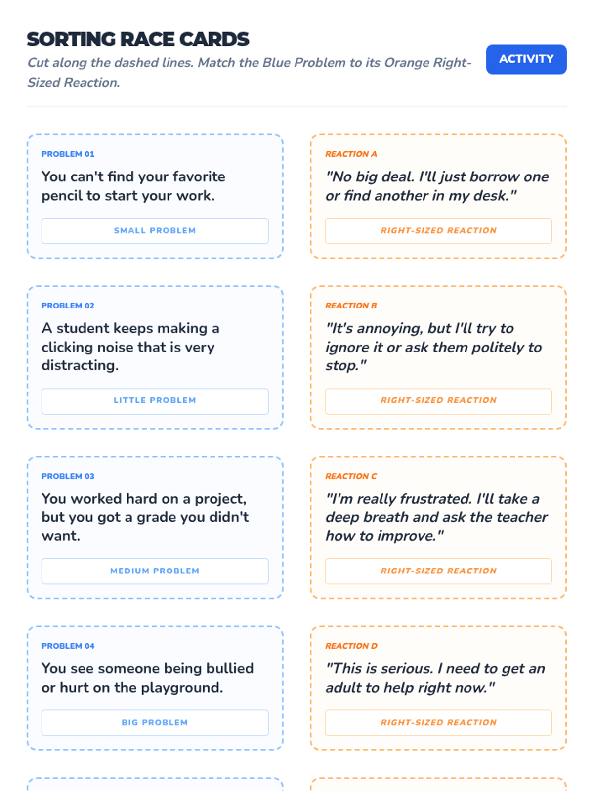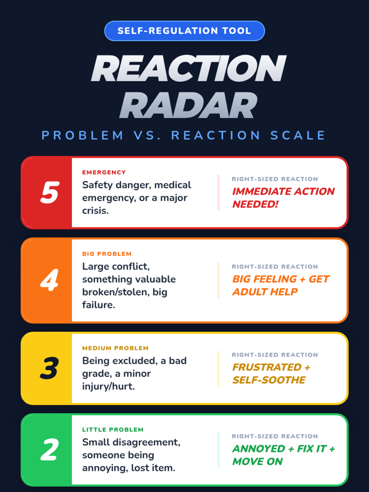 Students learn to use a visual scale to differentiate between small, medium, and big problems and practice matching their reactions to the problem size.