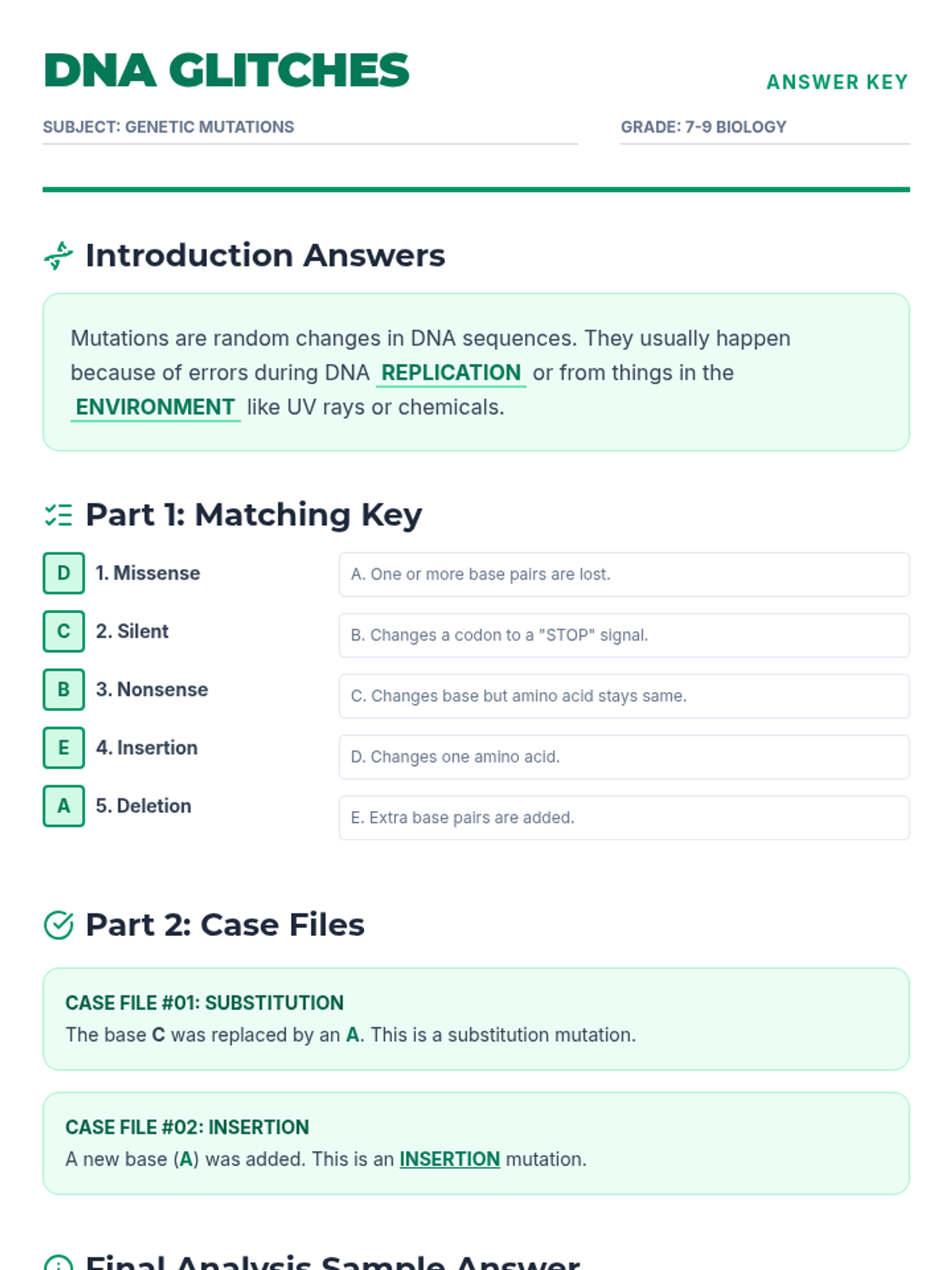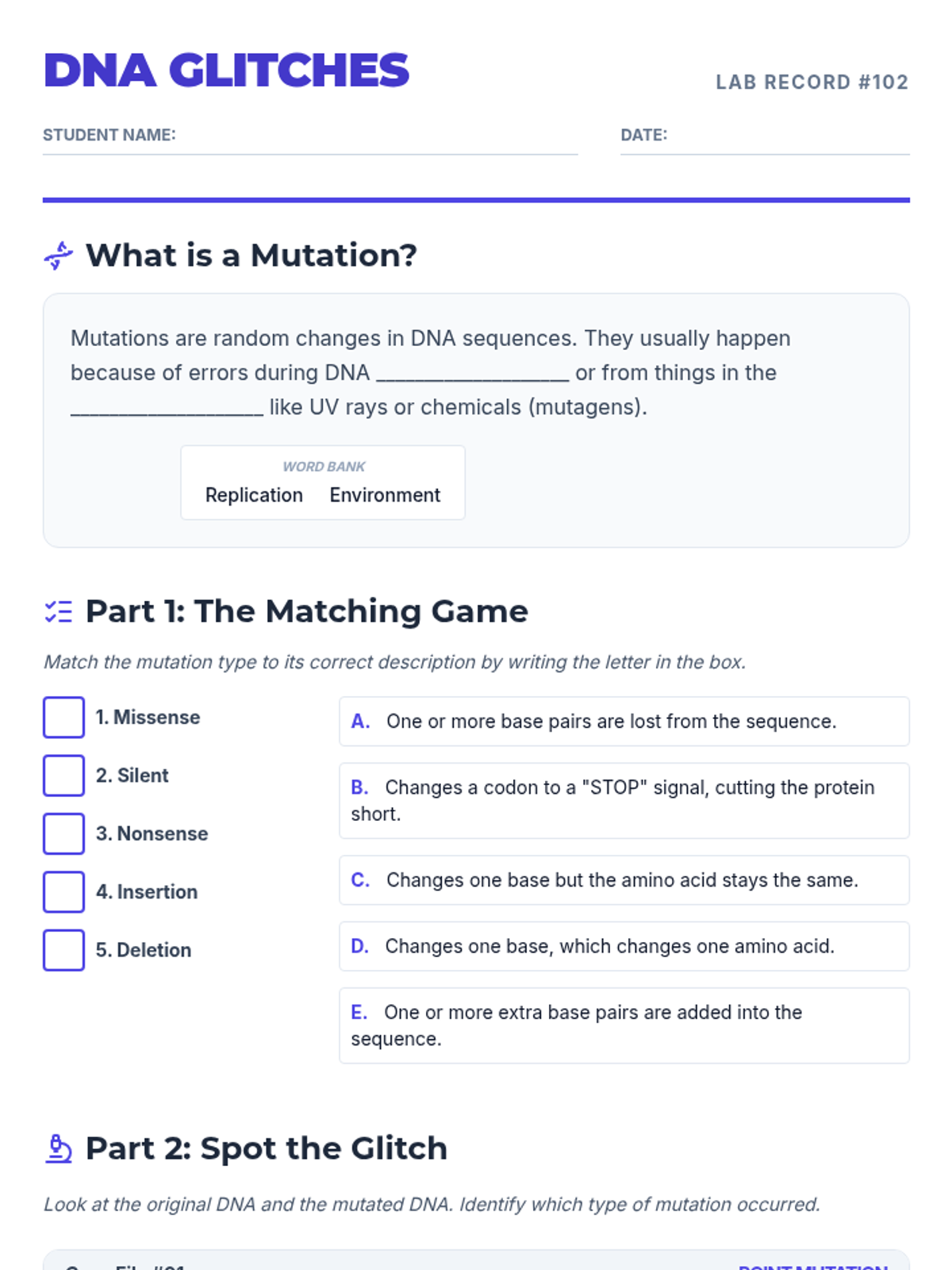 An introductory lesson on genetic mutations, covering point mutations and frameshift mutations, and how they affect protein synthesis.