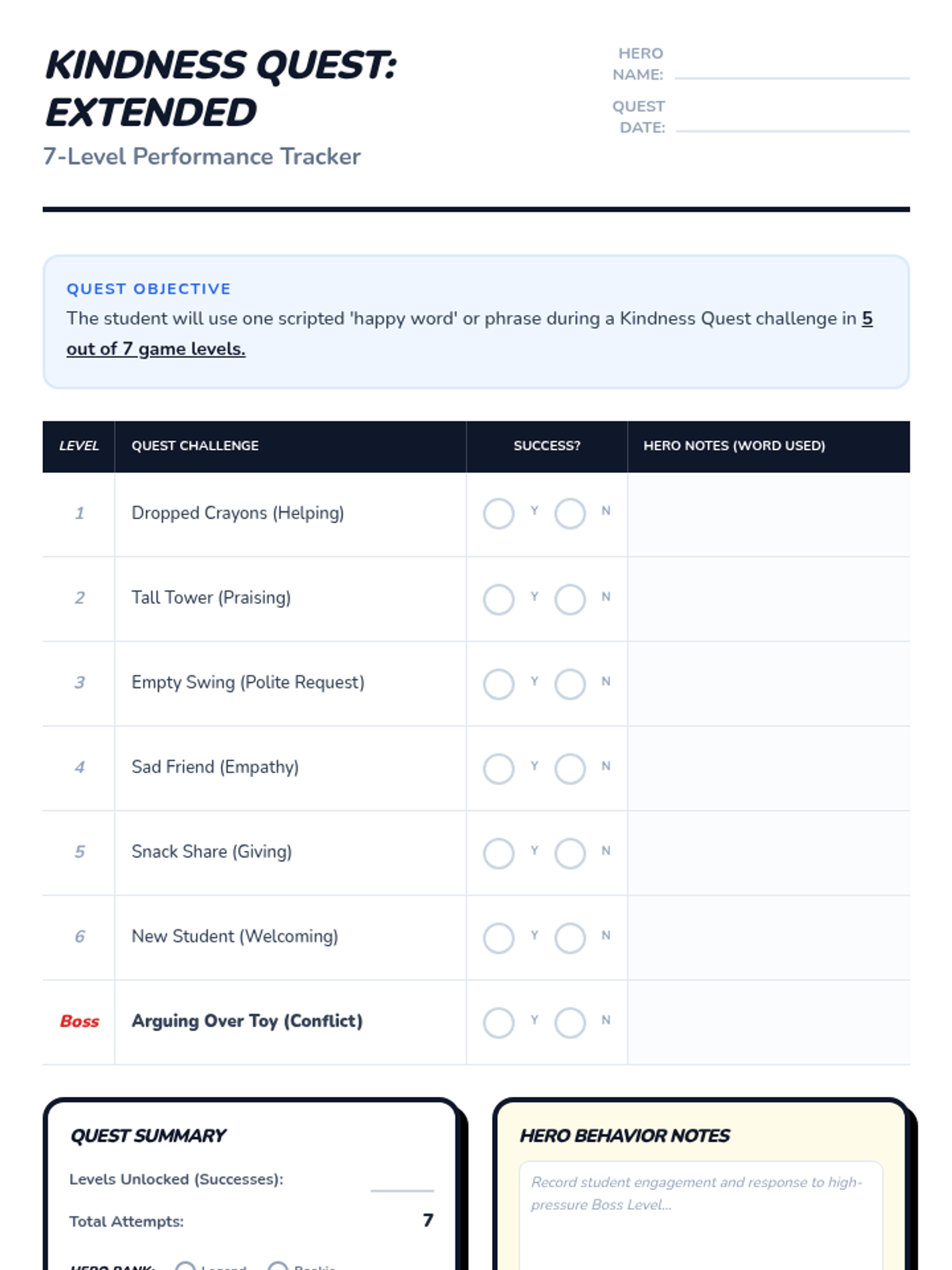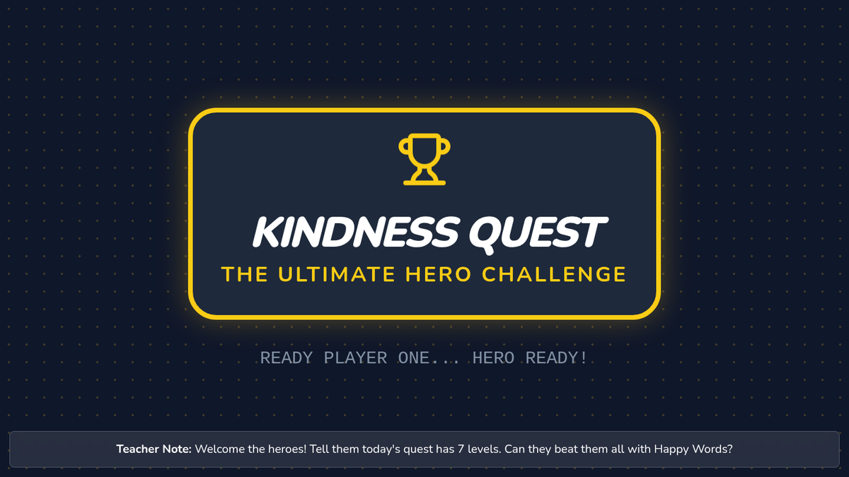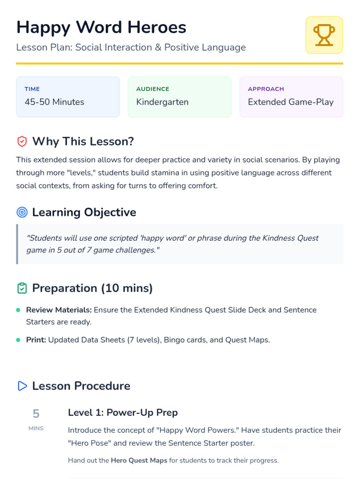 A 45-50 minute Kindergarten lesson focused on using positive language through an immersive 7-level "Kindness Quest" game to build social-emotional skills.
