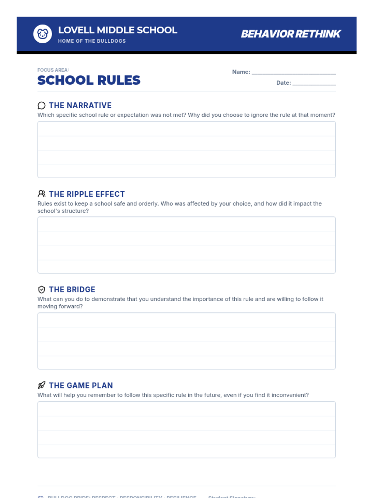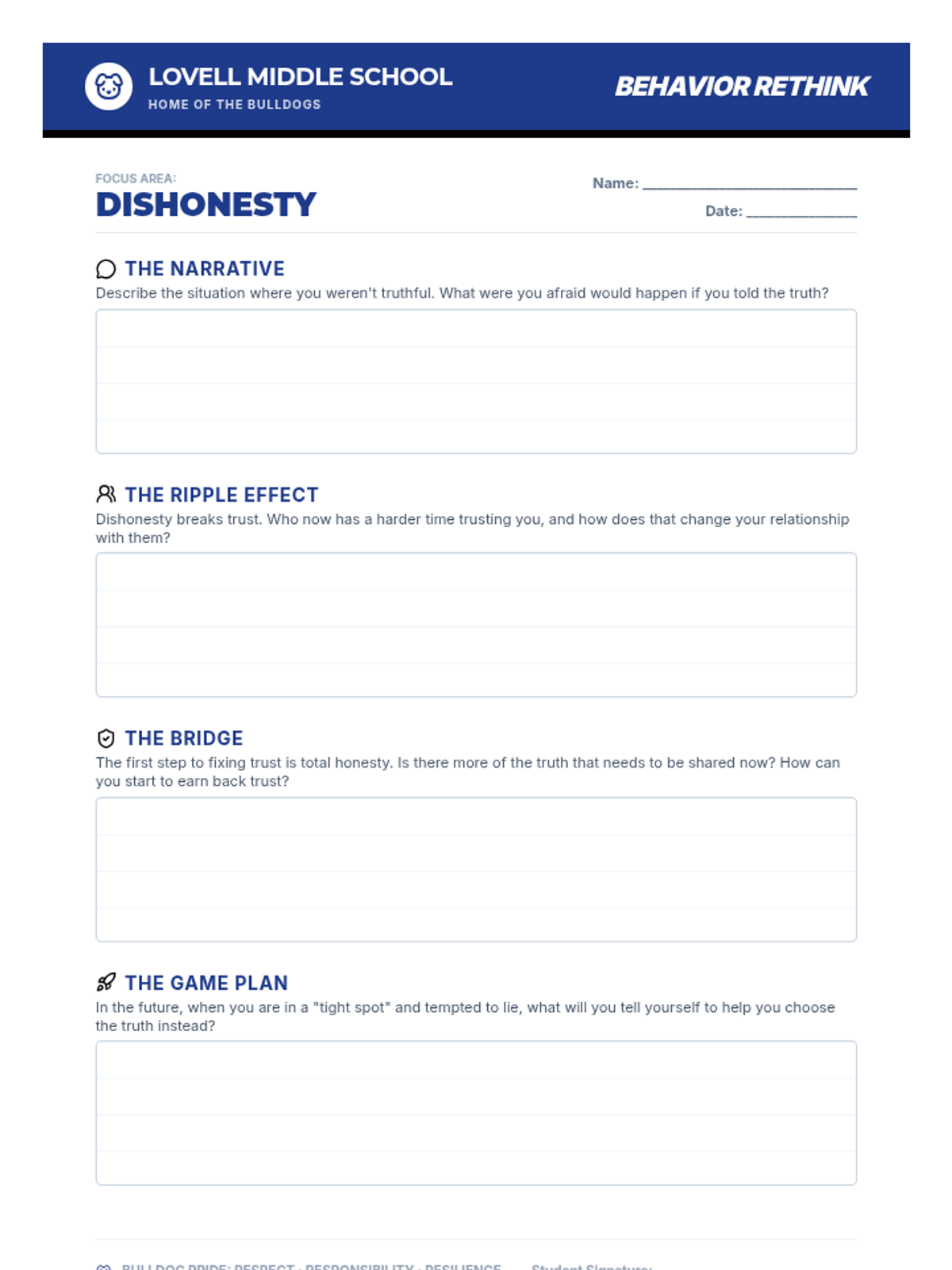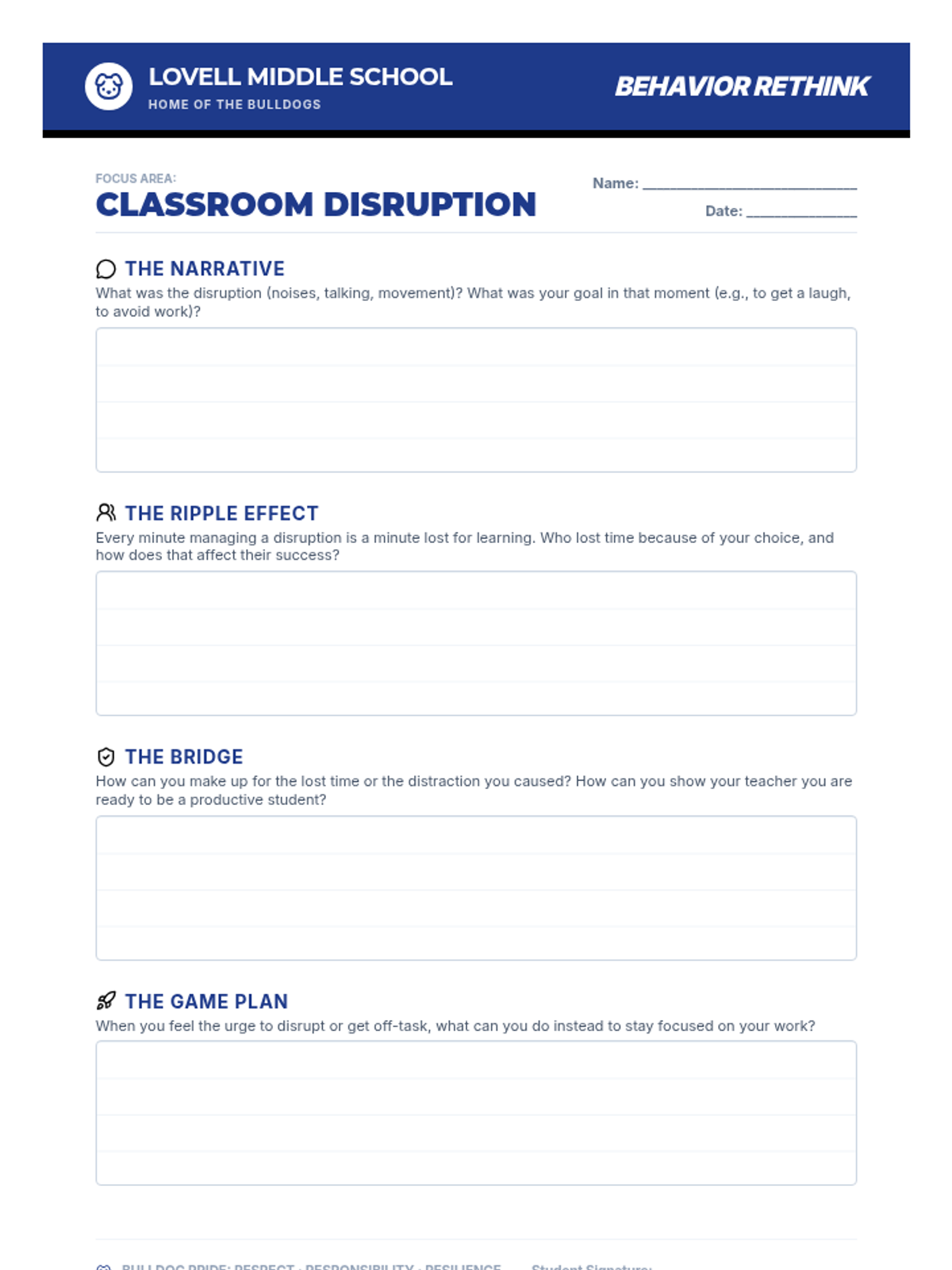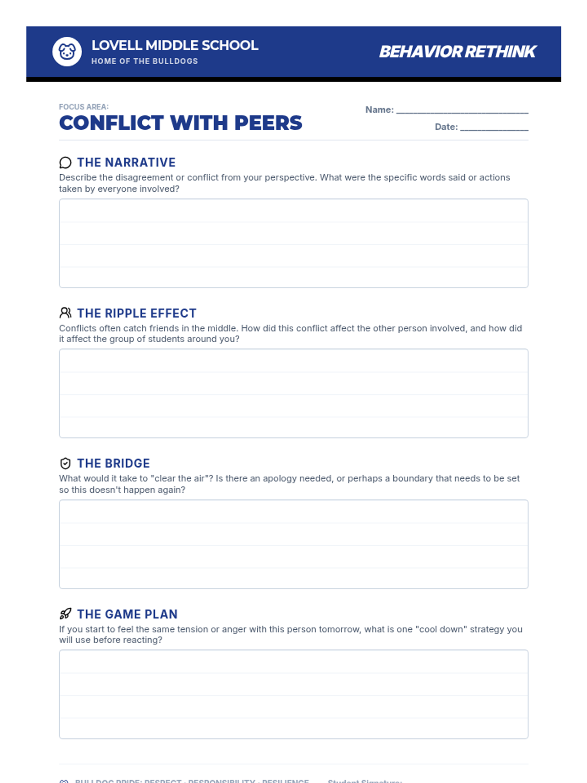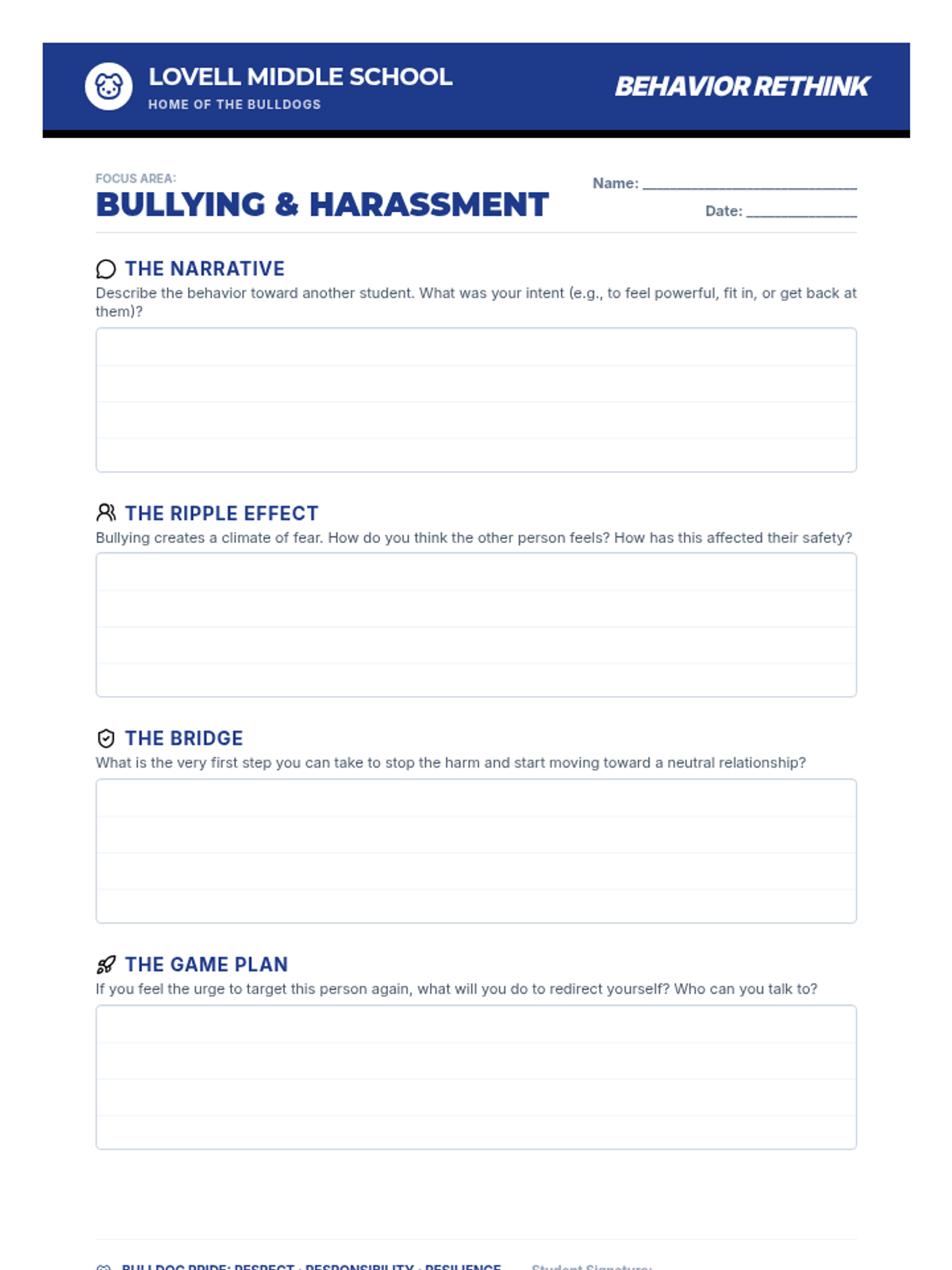 A collection of restorative writing prompts and reflection tools designed to help middle school students process behavioral incidents, understand impact, and plan for repair.