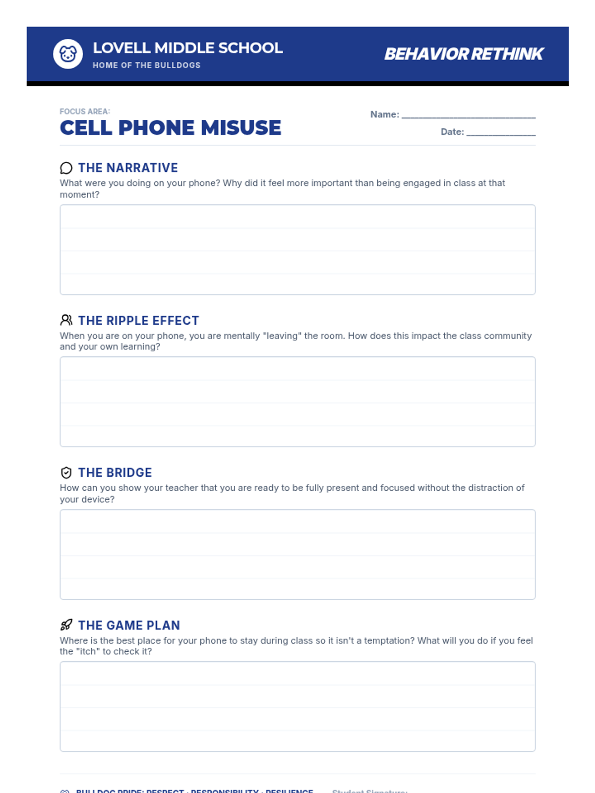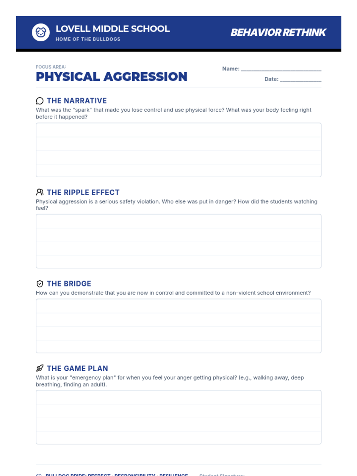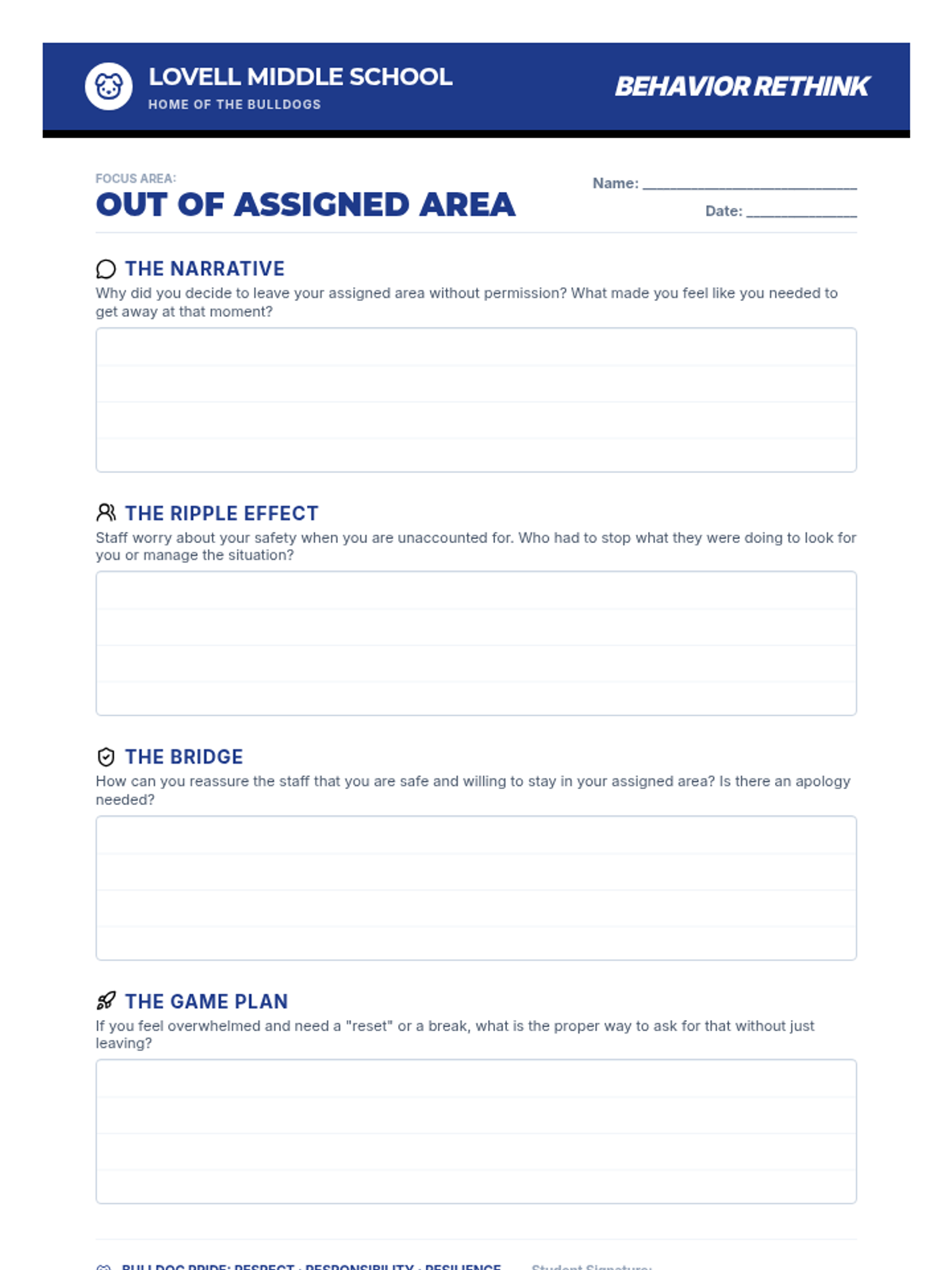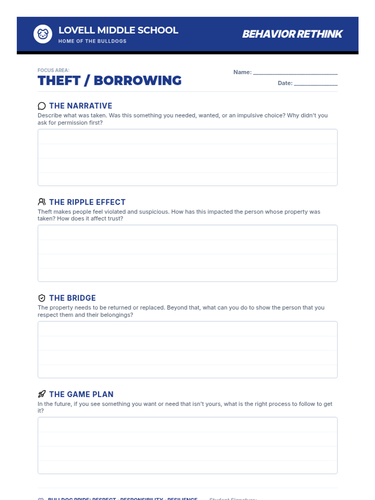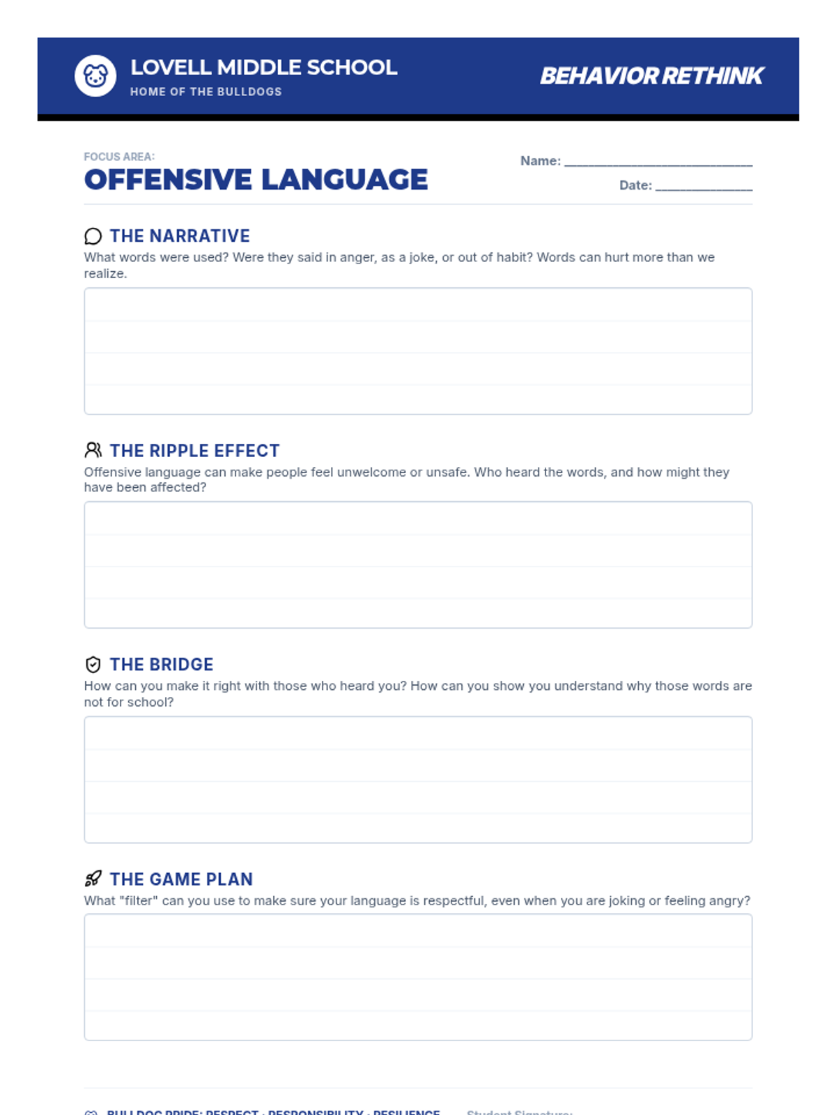 A collection of restorative writing prompts and reflection tools designed to help middle school students process behavioral incidents, understand impact, and plan for repair.
