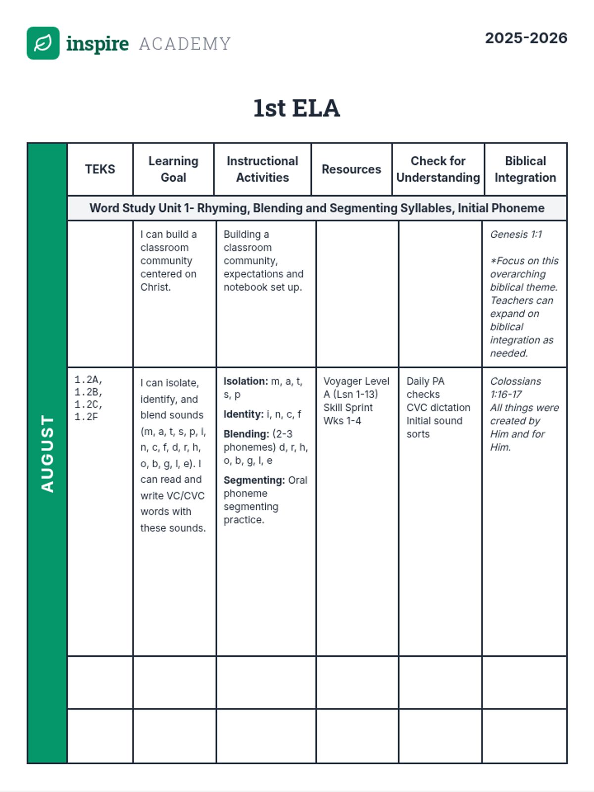 A comprehensive ELA scope and sequence for 1st grade, aligning Voyager Skill Sprint skills and Step Up to Writing curriculum into a monthly calendar format for the 2025-2026 school year.