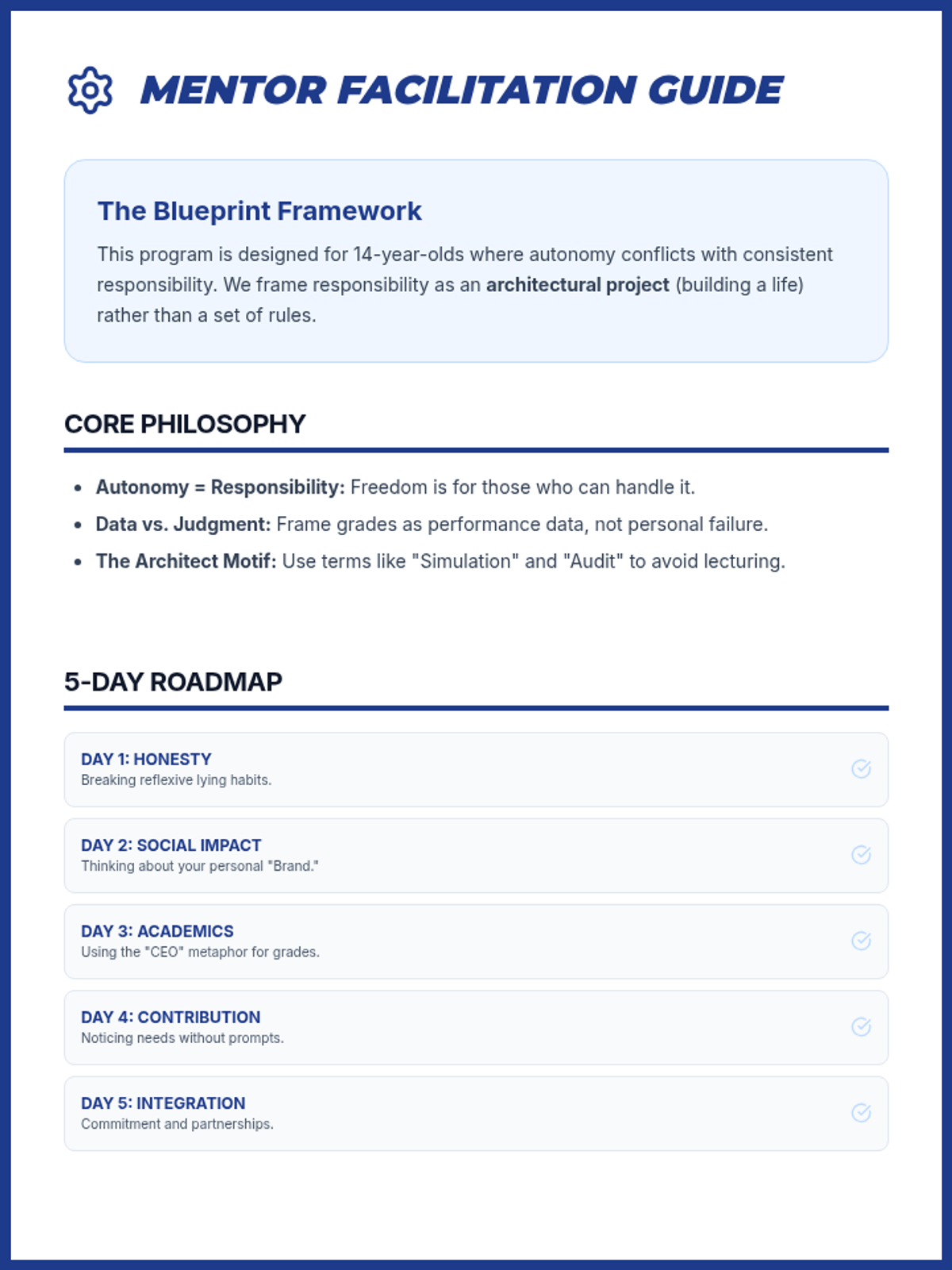 A comprehensive 5-day program for 14-year-olds to develop responsibility across academics, social life, home, and emotional health using a blueprint-inspired framework.