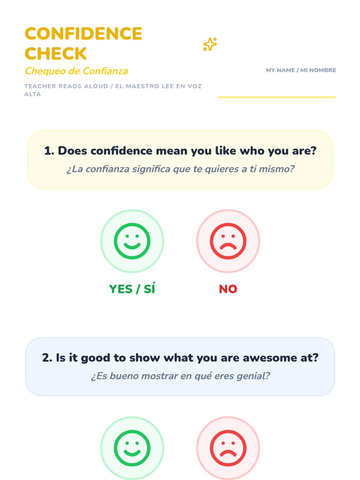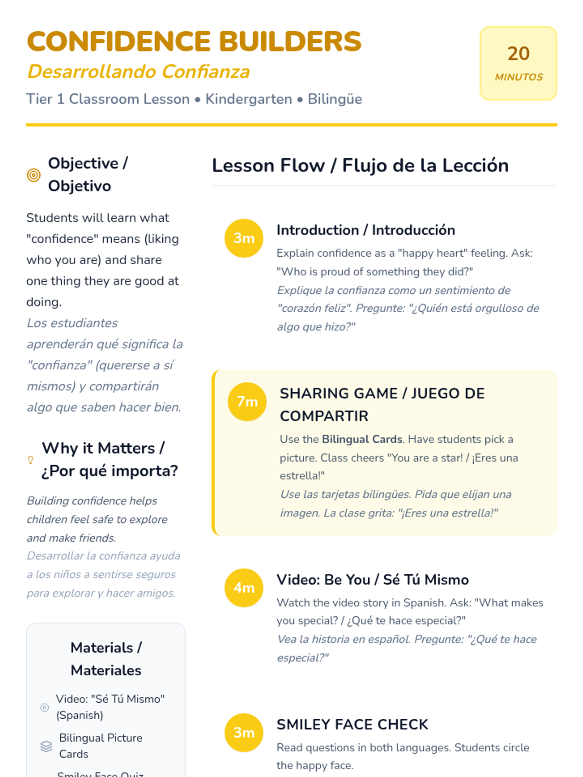 A 20-minute lesson for kindergarteners focused on building self-esteem and confidence through a collaborative game, a video story, and personal reflection. Students learn to identify their unique strengths and practice positive self-talk.