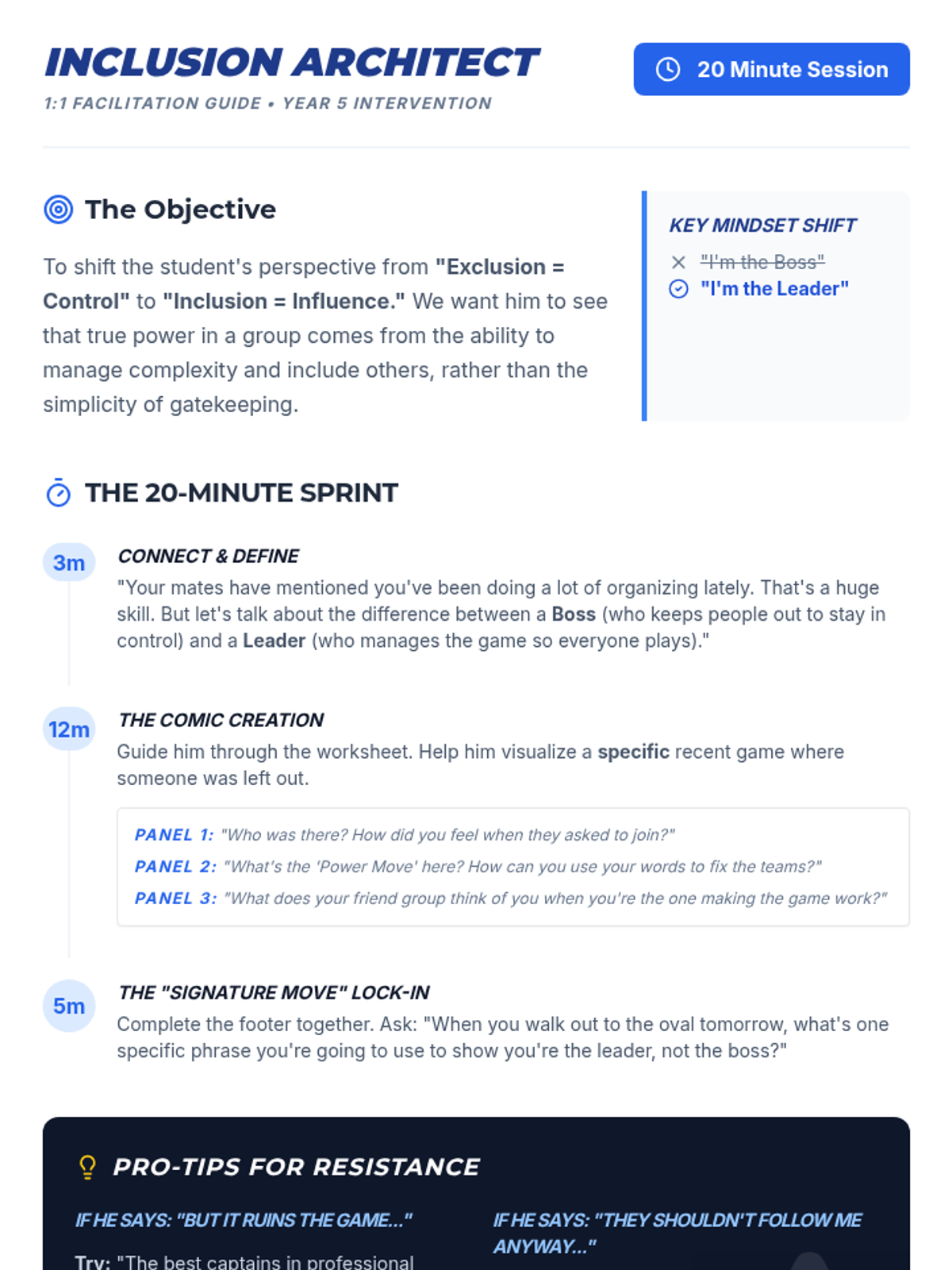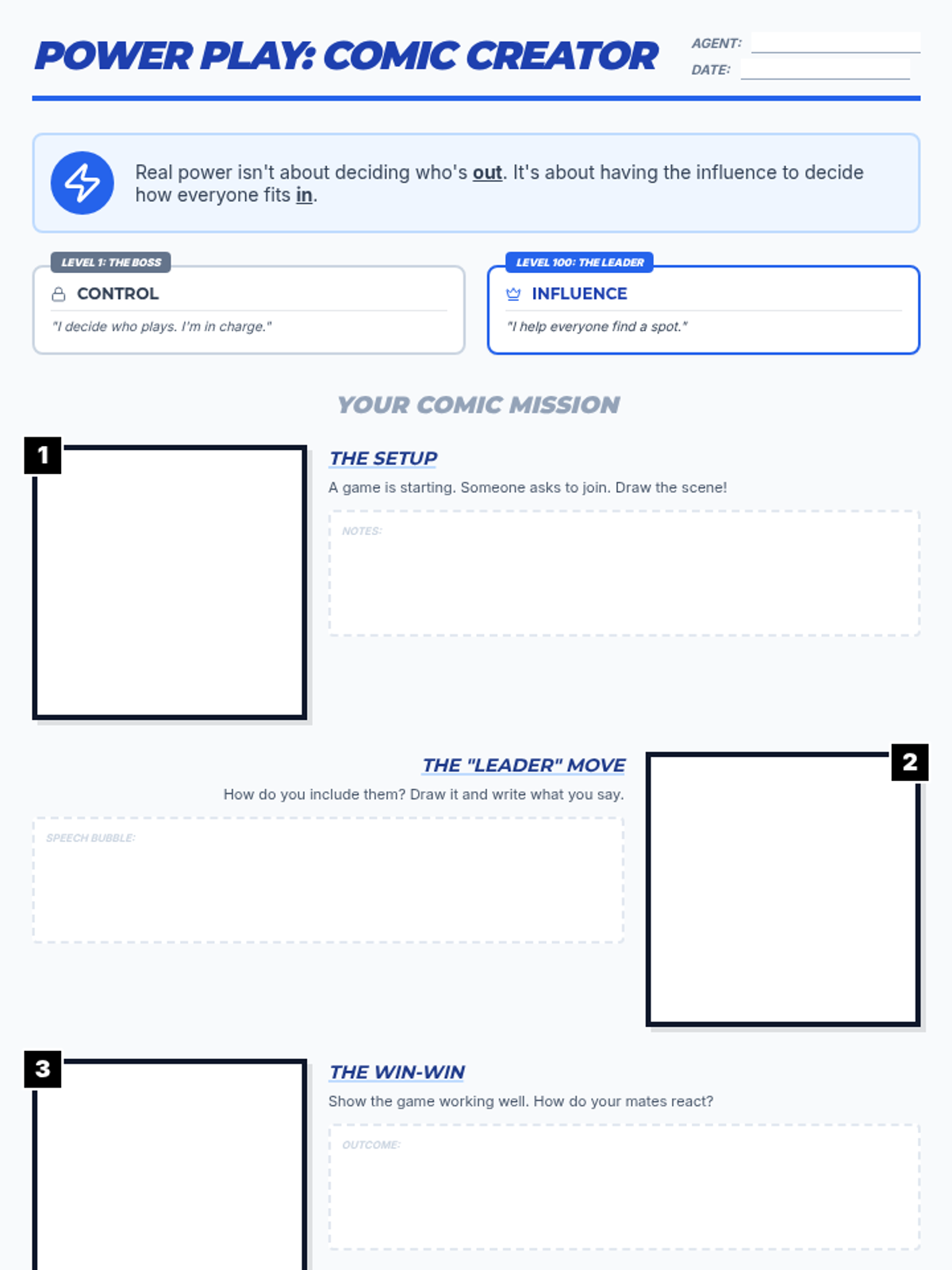 A 1:1 intervention session designed for a Year 5 student to explore the difference between controlling others and leading through inclusion, using a comic-strip format to visualize social impact.