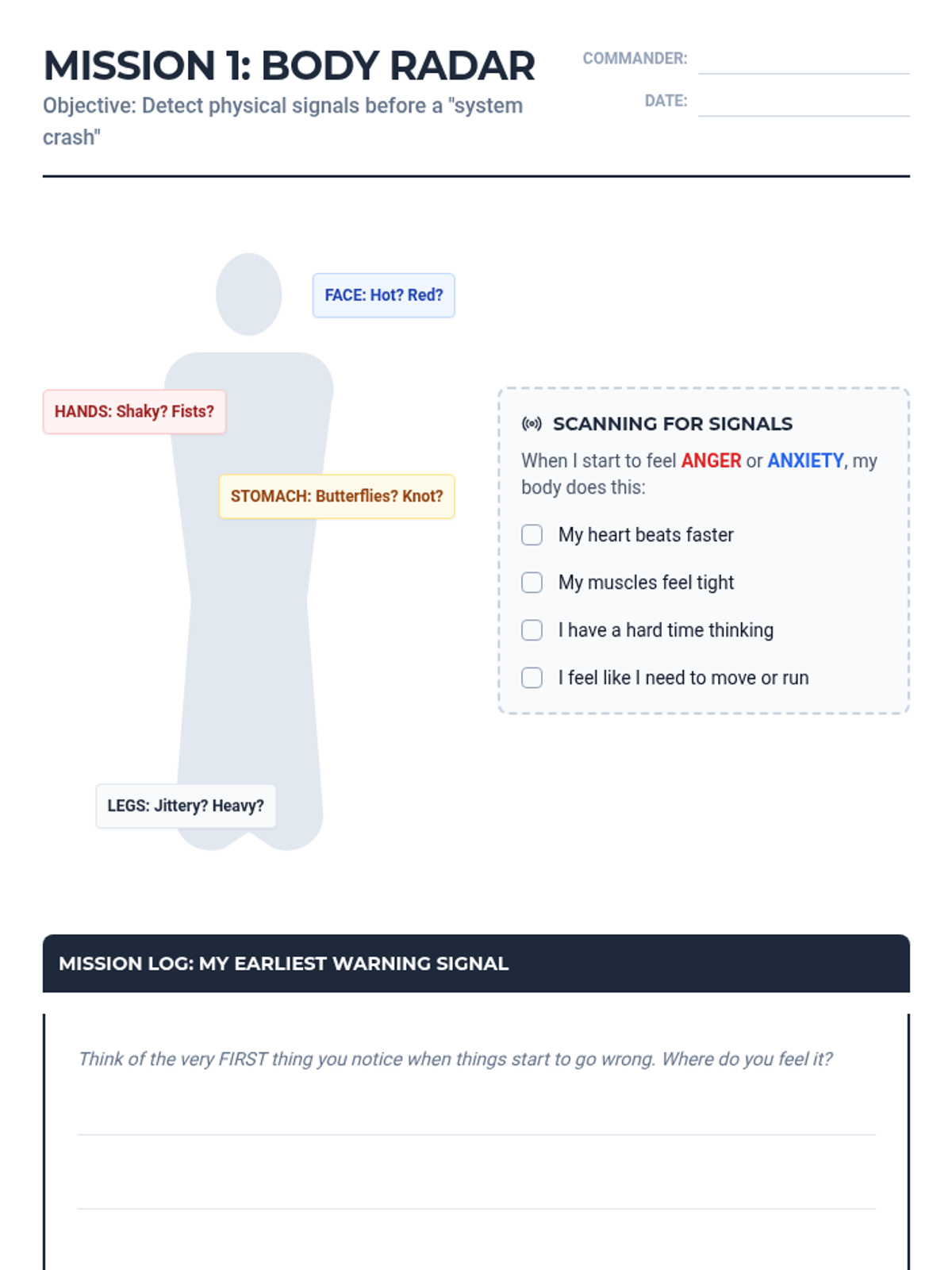 Focuses on identifying physiological responses to stress and anger, helping the student recognize 'early warning signals' in their body.