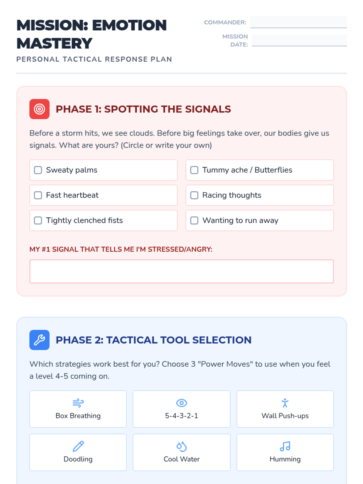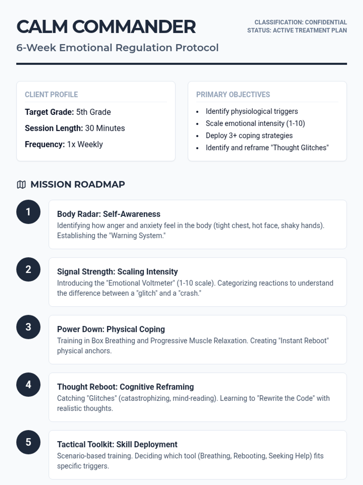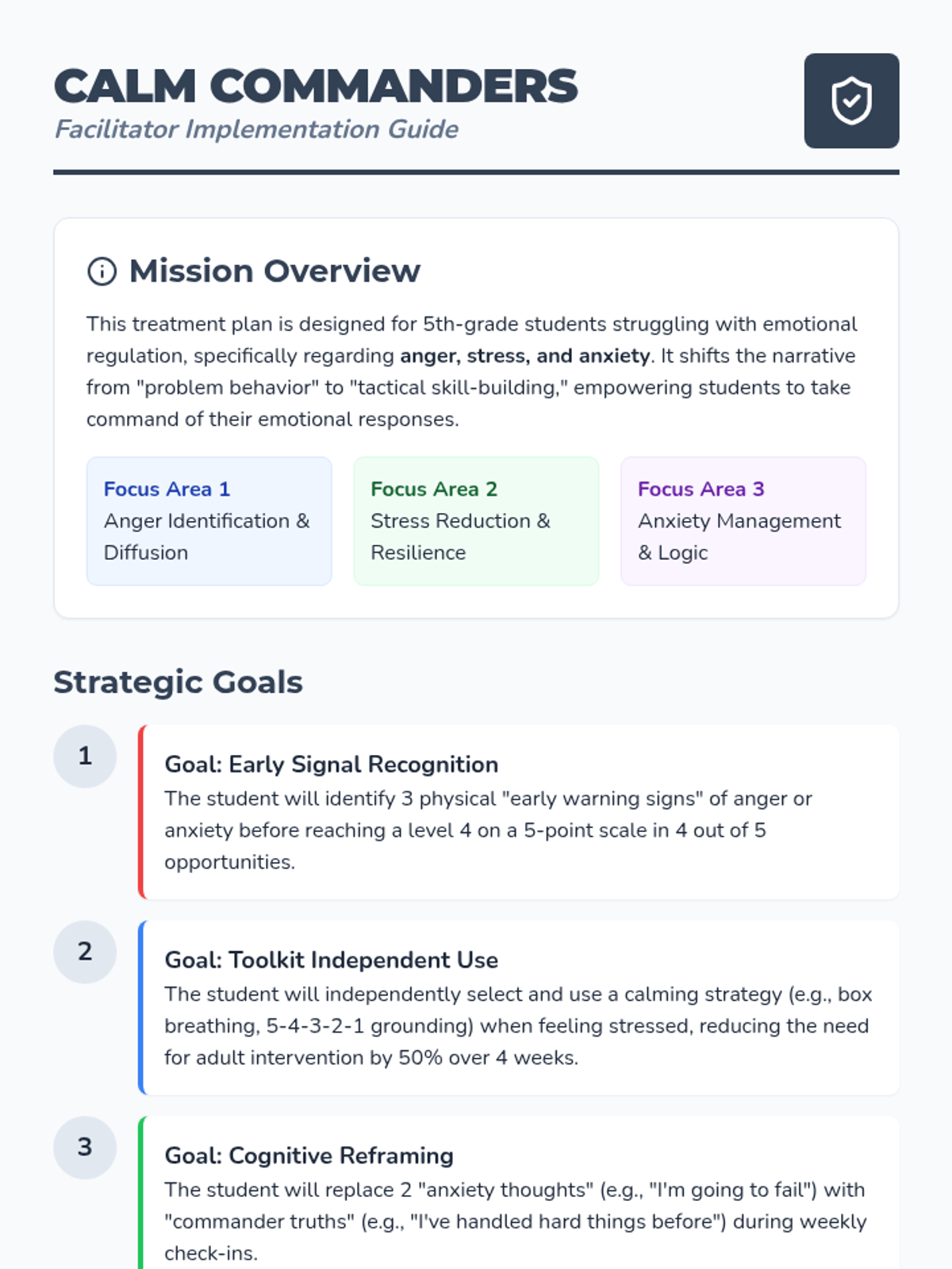 A comprehensive emotion management sequence designed for 5th graders to identify, track, and regulate feelings of anger, stress, and anxiety through goal-setting and evidence-based activities.
