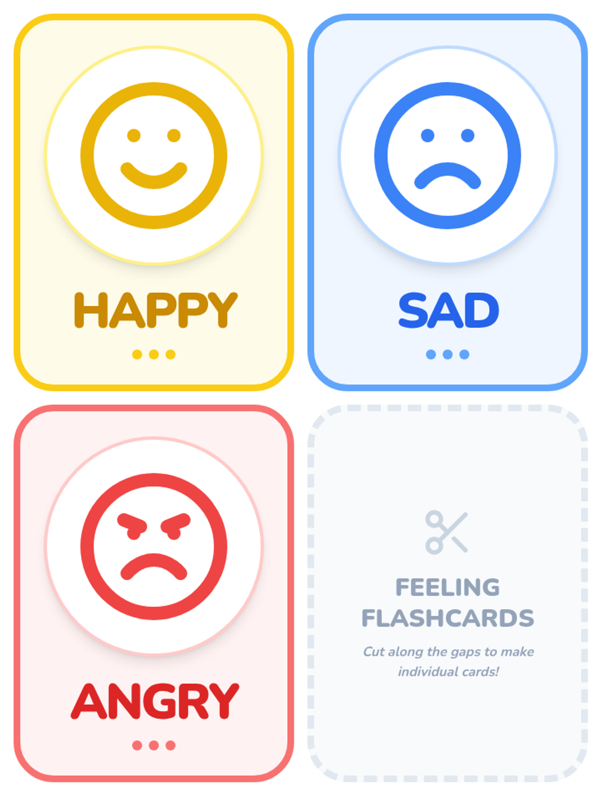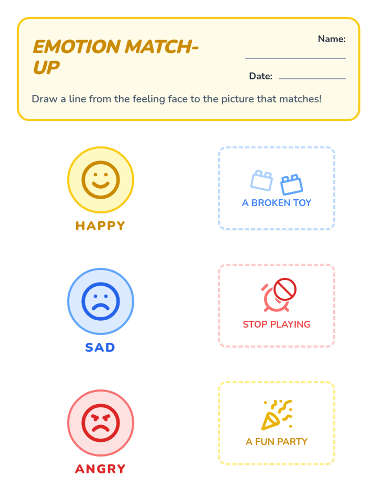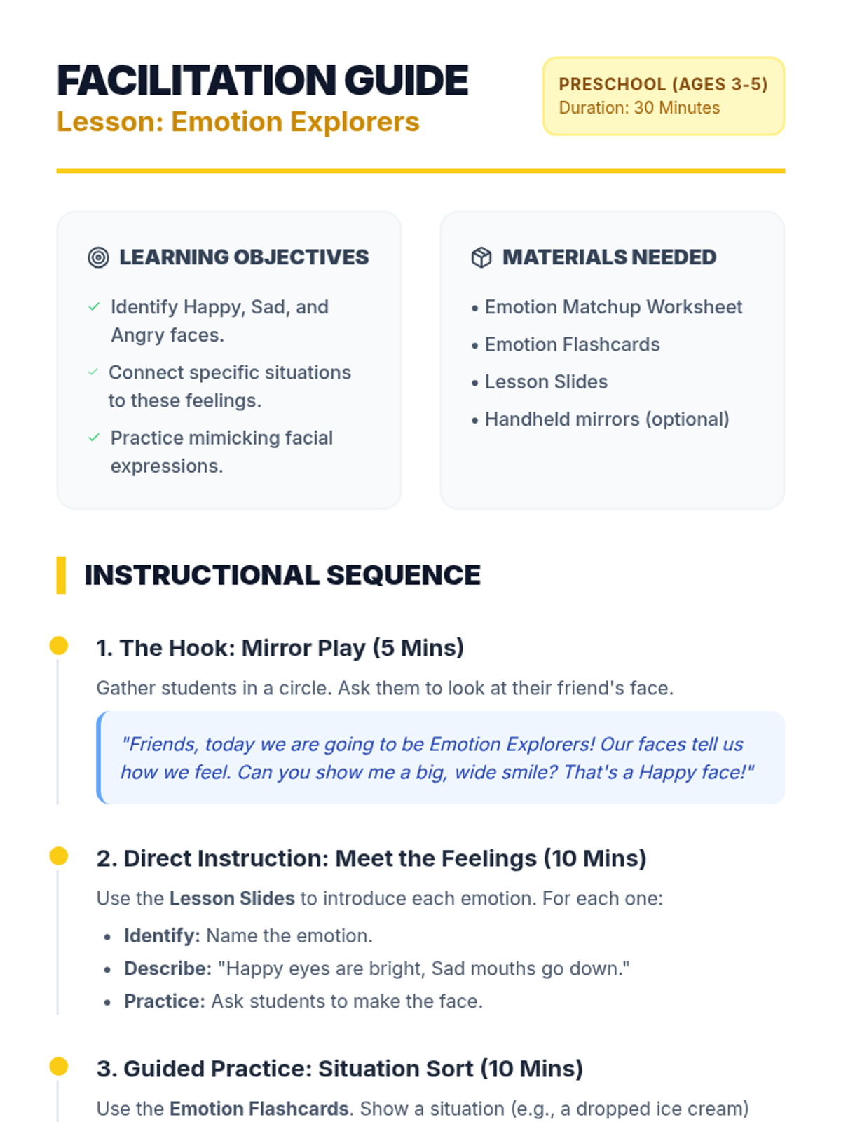 A foundational lesson for preschoolers to identify and understand the emotions of happy, sad, and angry through visual recognition and situational context.