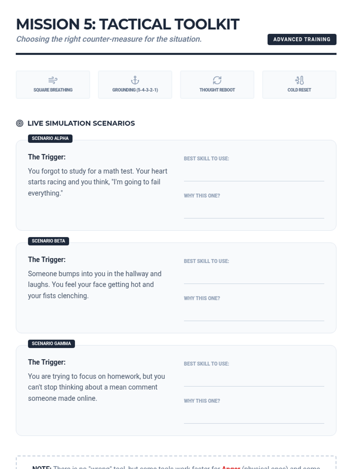 A scenario-based session where the student practices selecting the most effective coping skill for specific stressors.