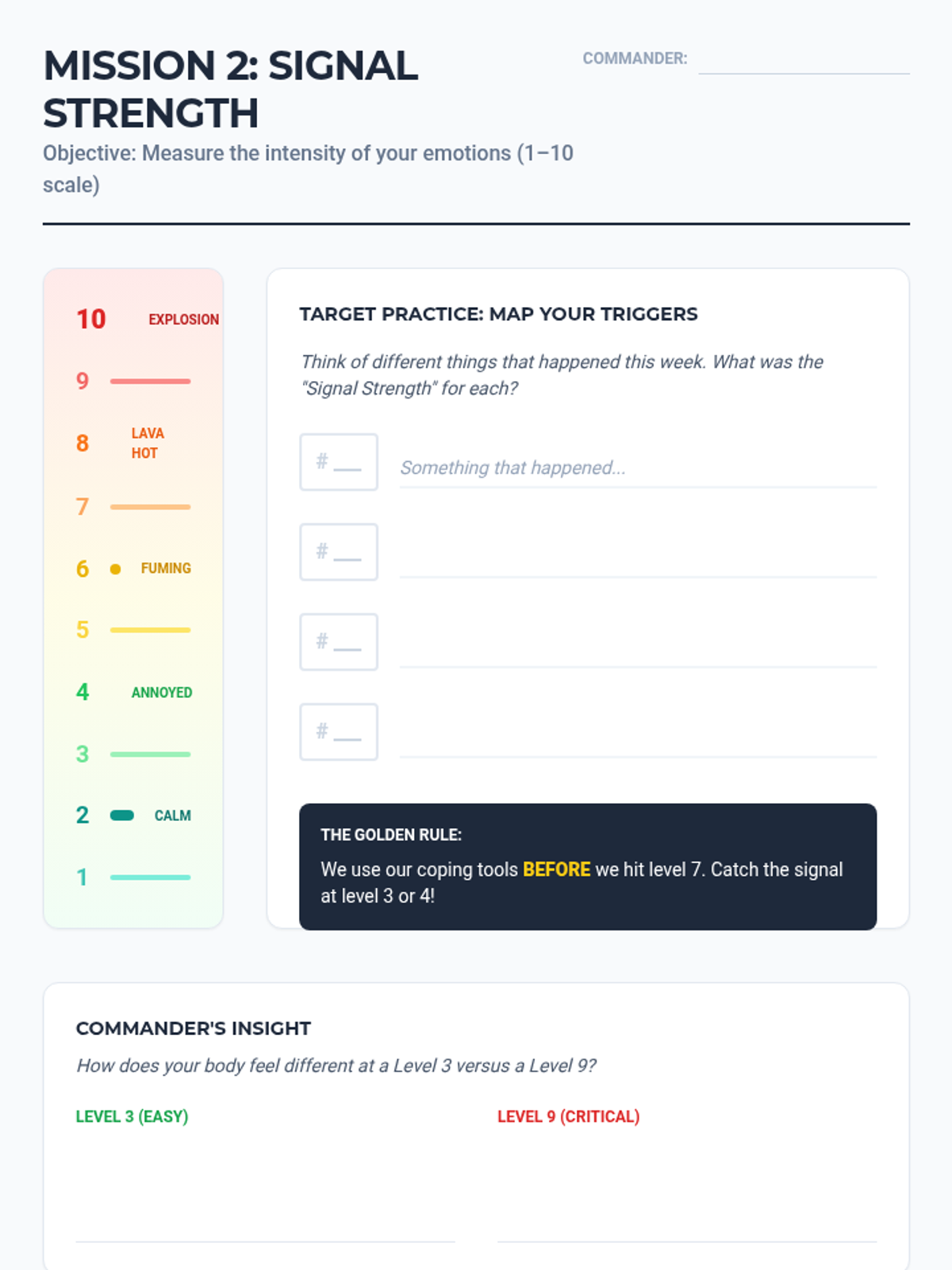 Introduces an intensity scale to help the student differentiate between mild frustration and high-intensity anger or anxiety.