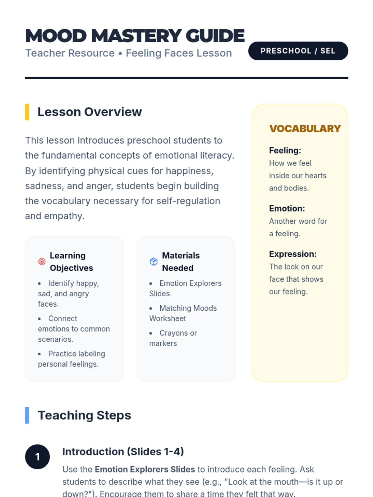 A foundational social-emotional lesson designed to help preschool students identify and understand basic emotions through visual cues and relatable scenarios.