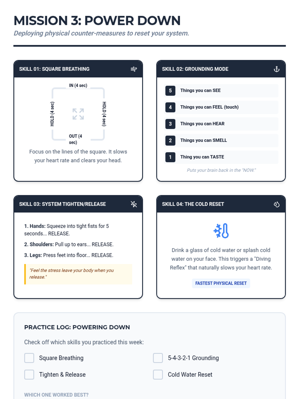 Teaches concrete physical coping mechanisms including deep breathing and progressive muscle relaxation to lower physiological arousal.