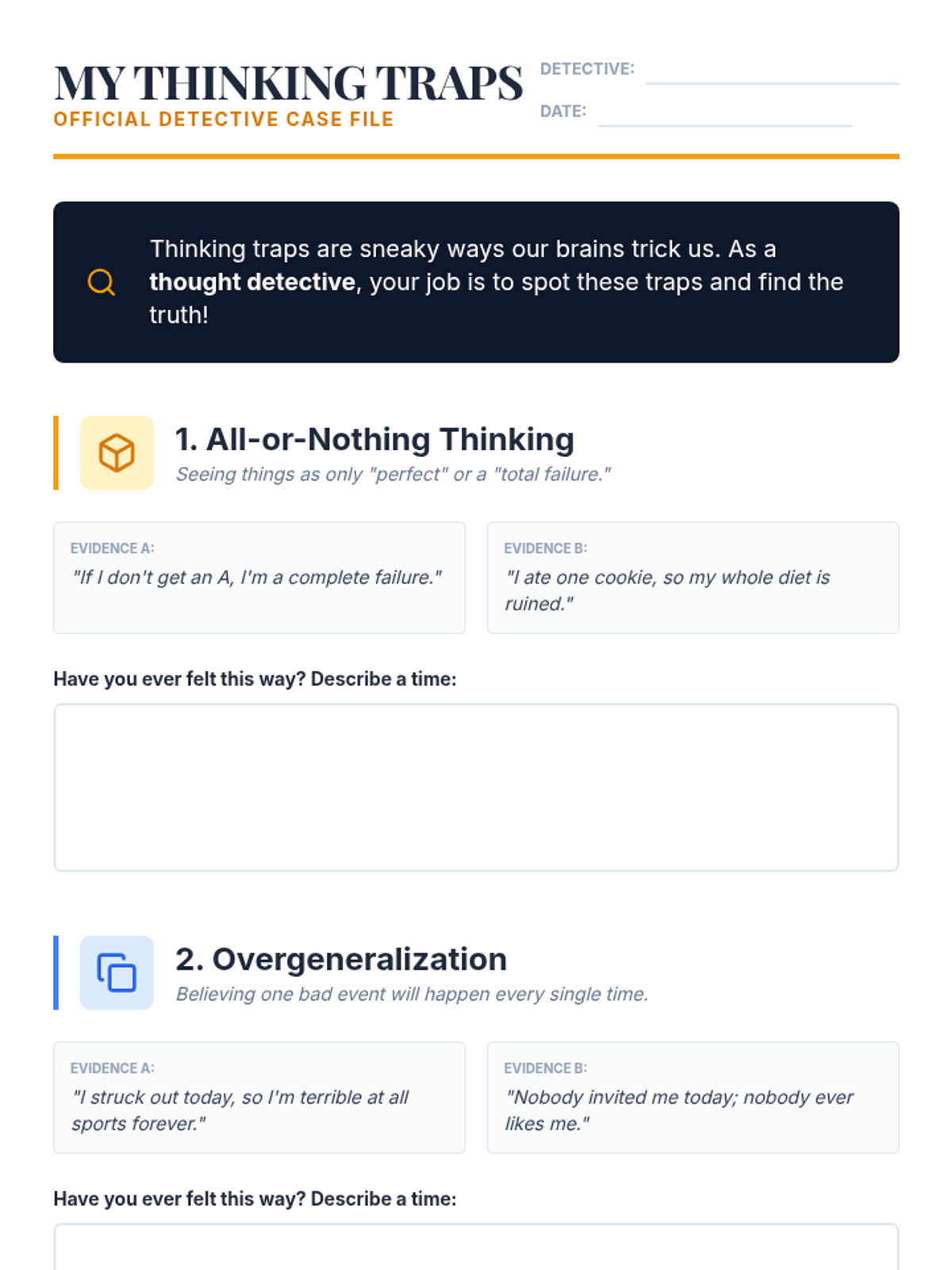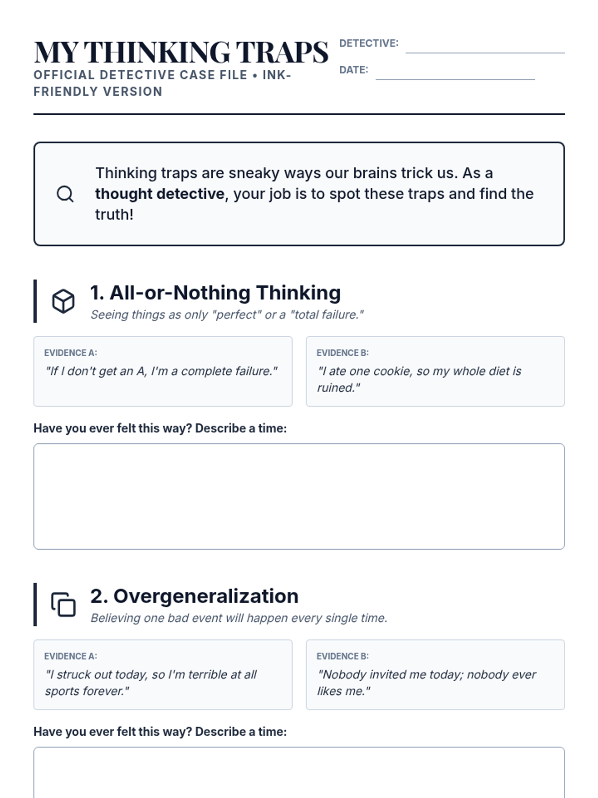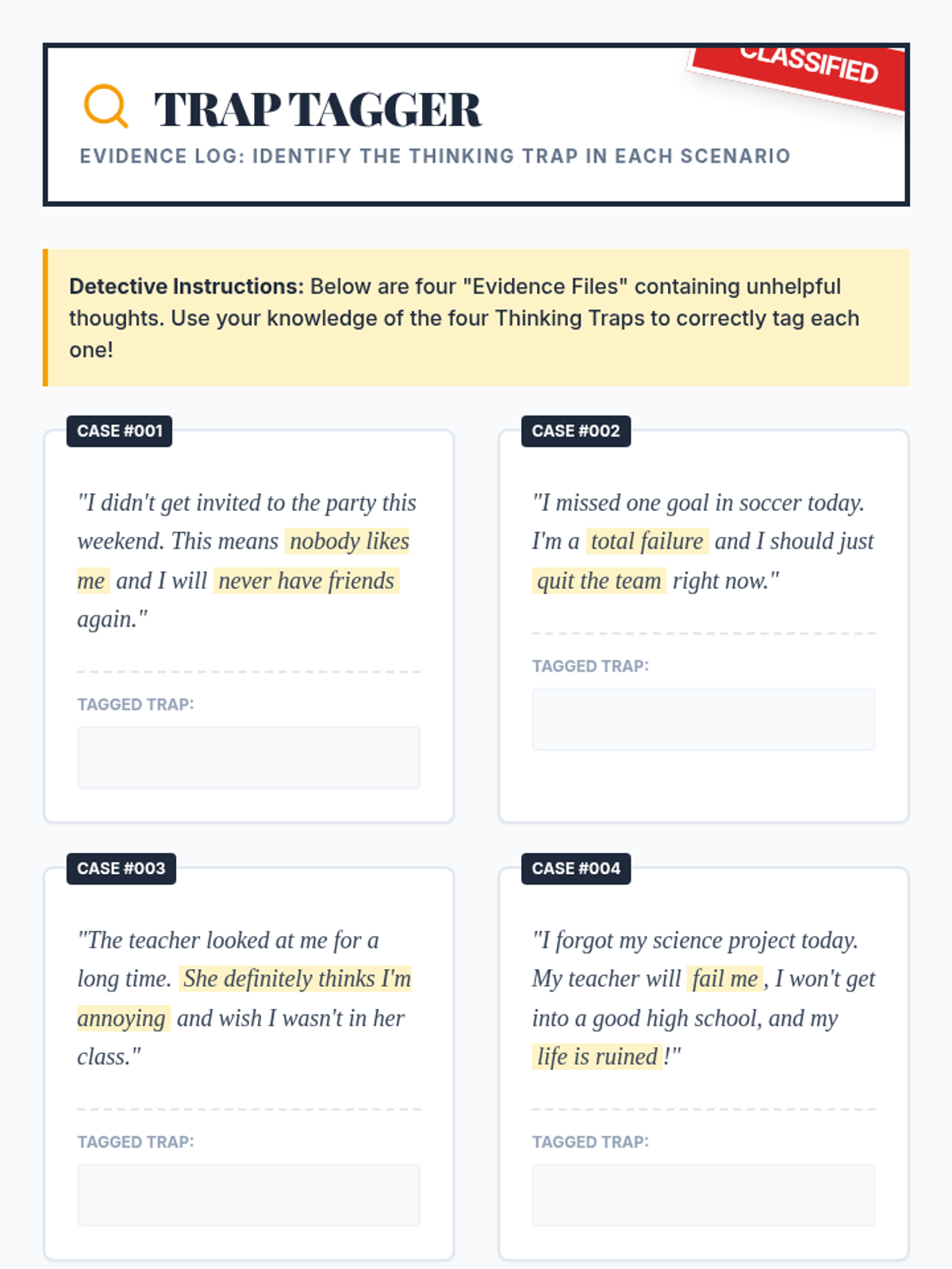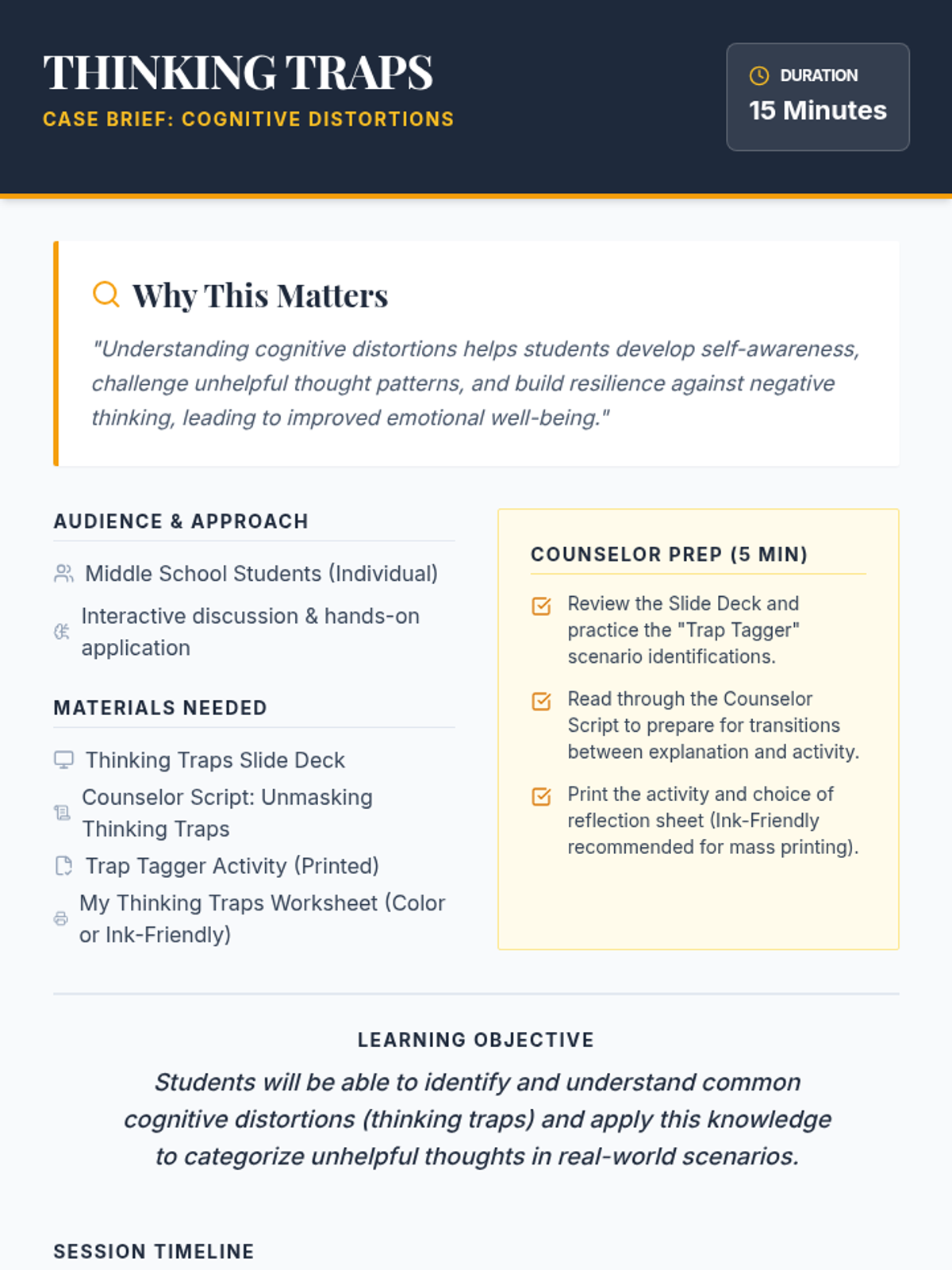 A 15-minute individual Tier 3 counseling session for middle schoolers to identify and understand cognitive distortions using a 'thought detective' approach.