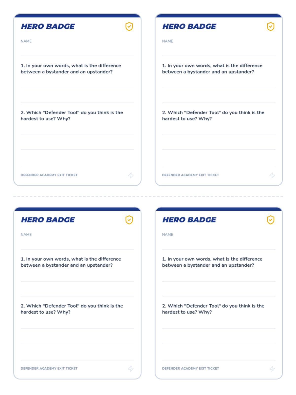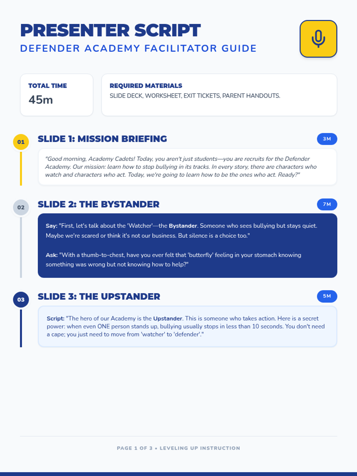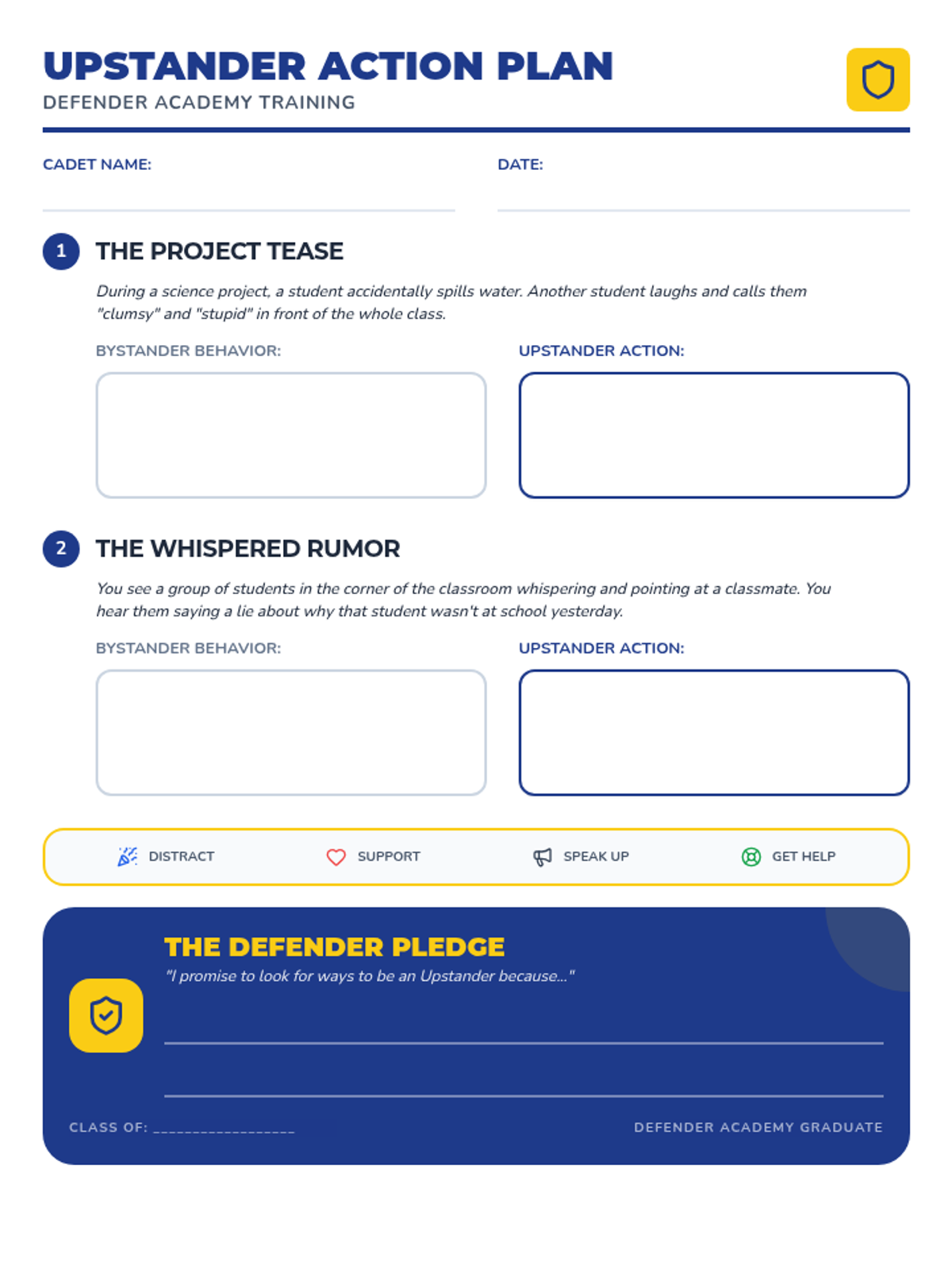 An interactive lesson teaching 4th graders the difference between bystanders and upstanders through 'Defender Academy' training scenarios and actionable strategies.