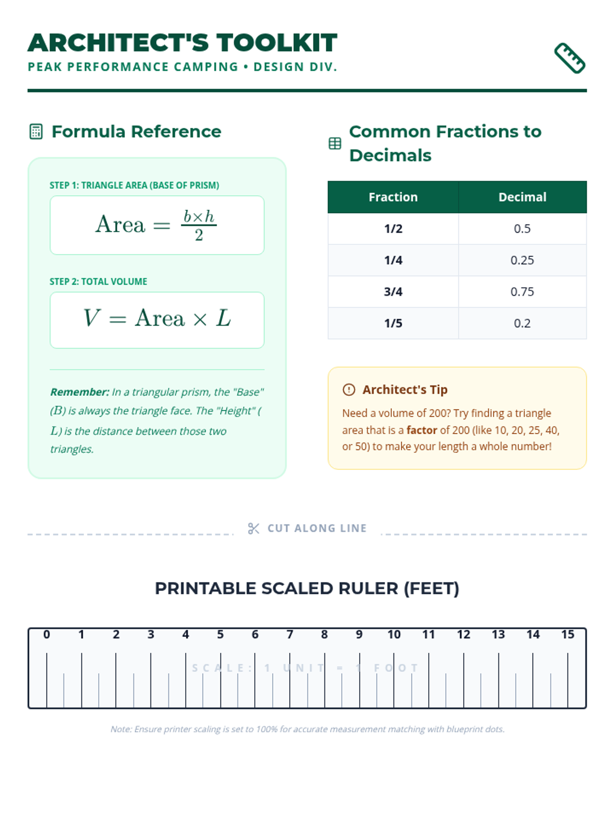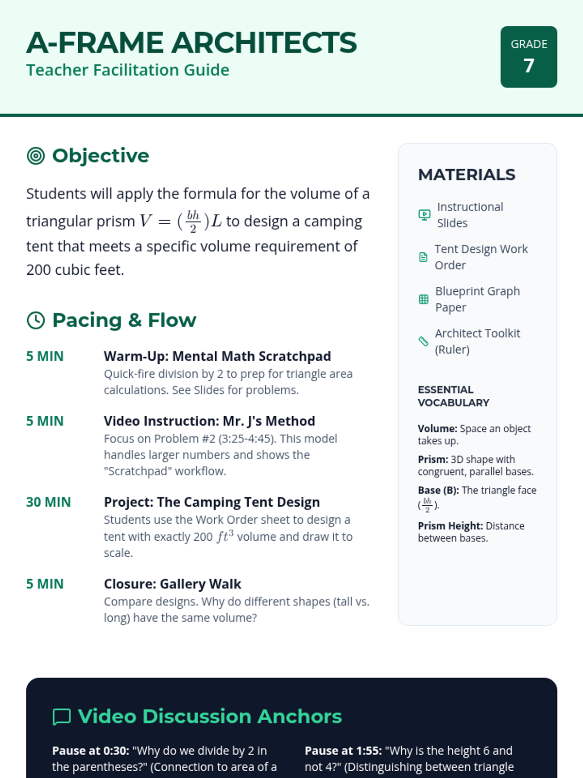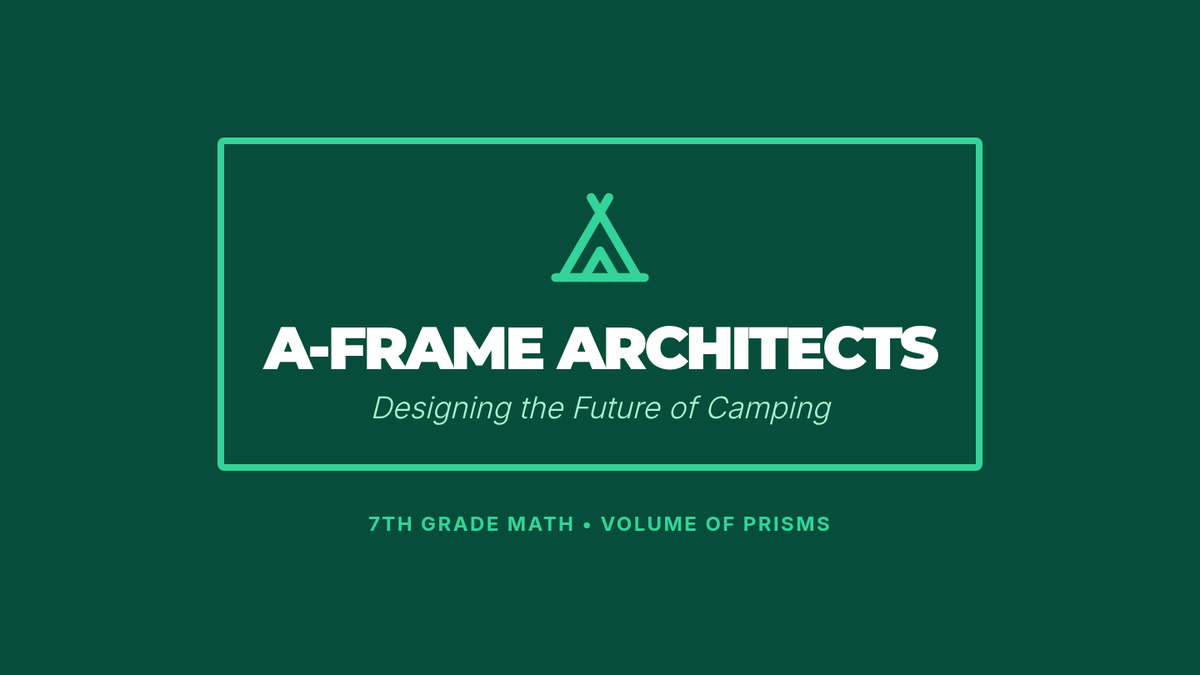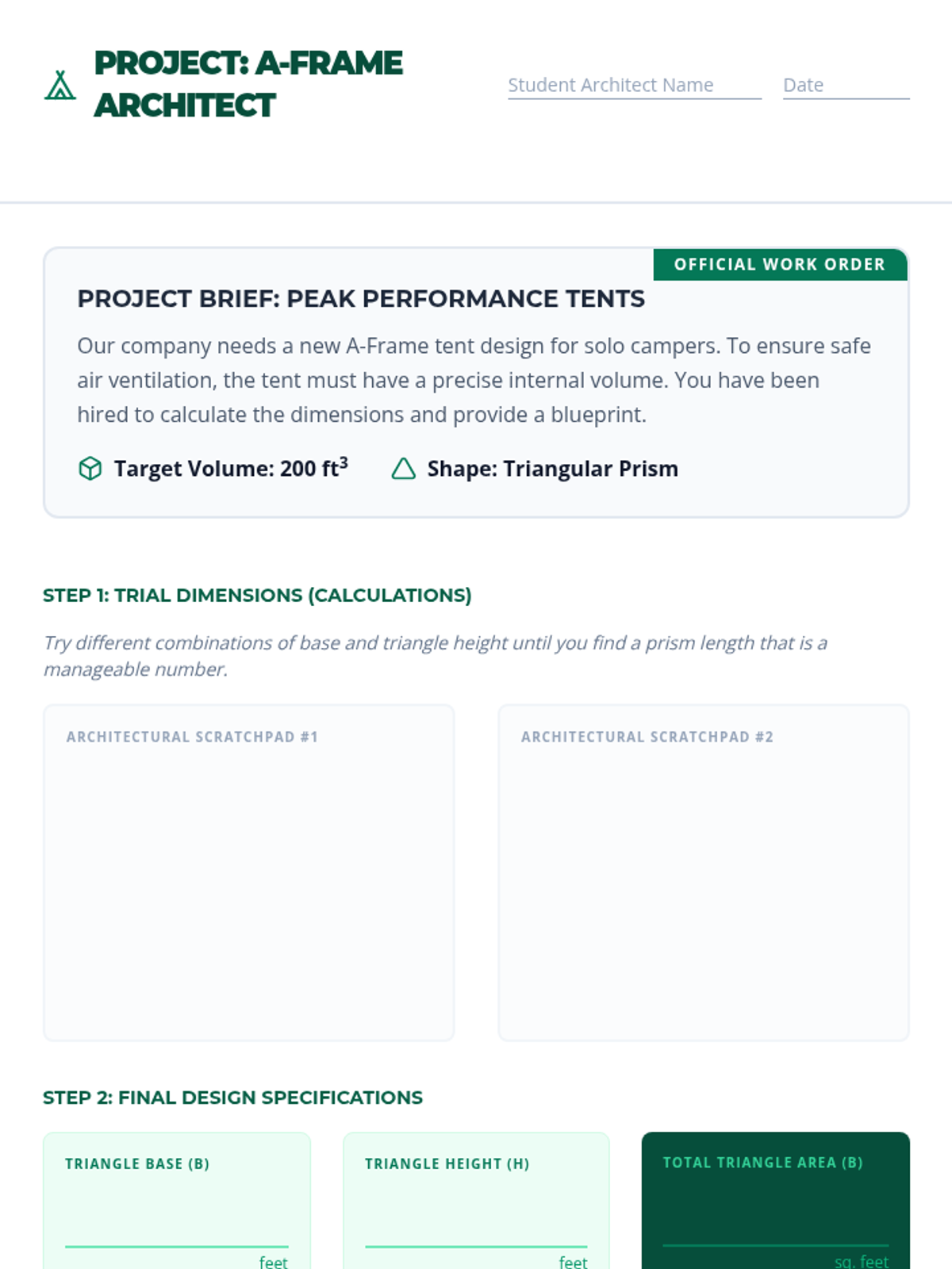 Students become architects to design an A-frame camping tent with a specific volume, applying their knowledge of triangular prism volume formulas and dimensions.