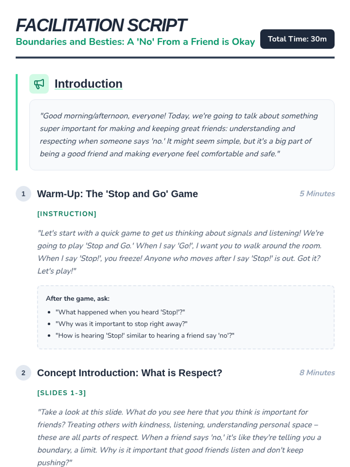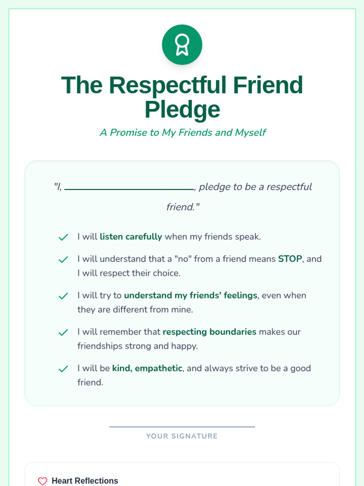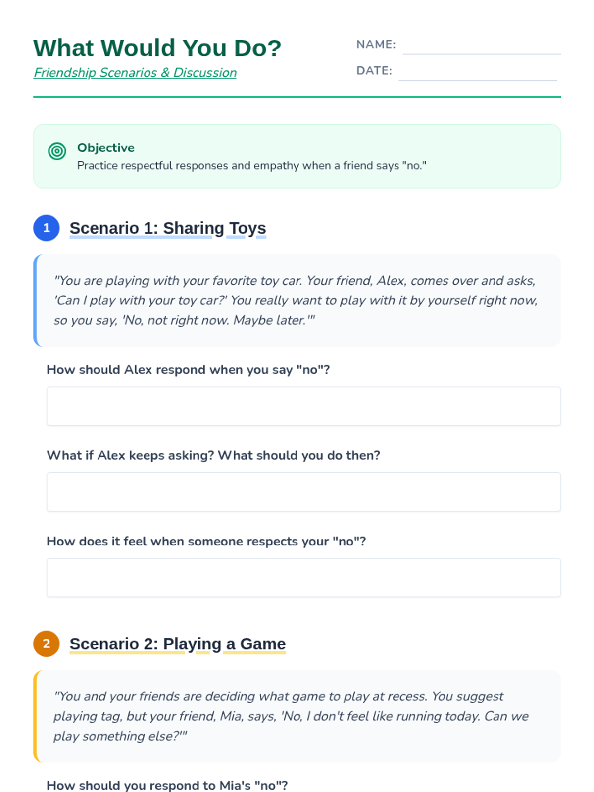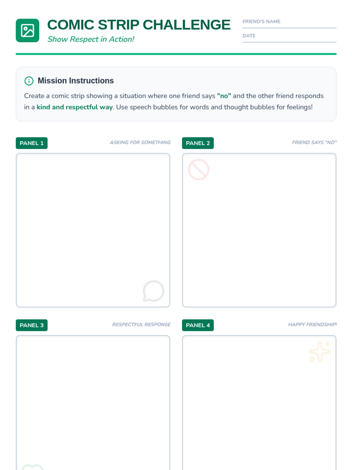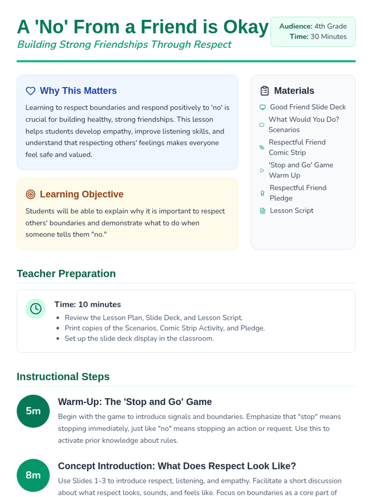 A 30-minute lesson for 4th graders on respecting personal boundaries, listening to 'no,' and maintaining healthy friendships through empathy and kindness.