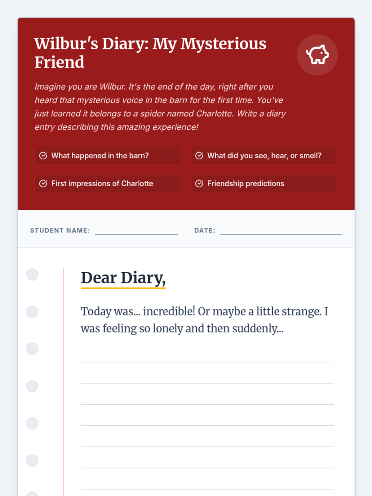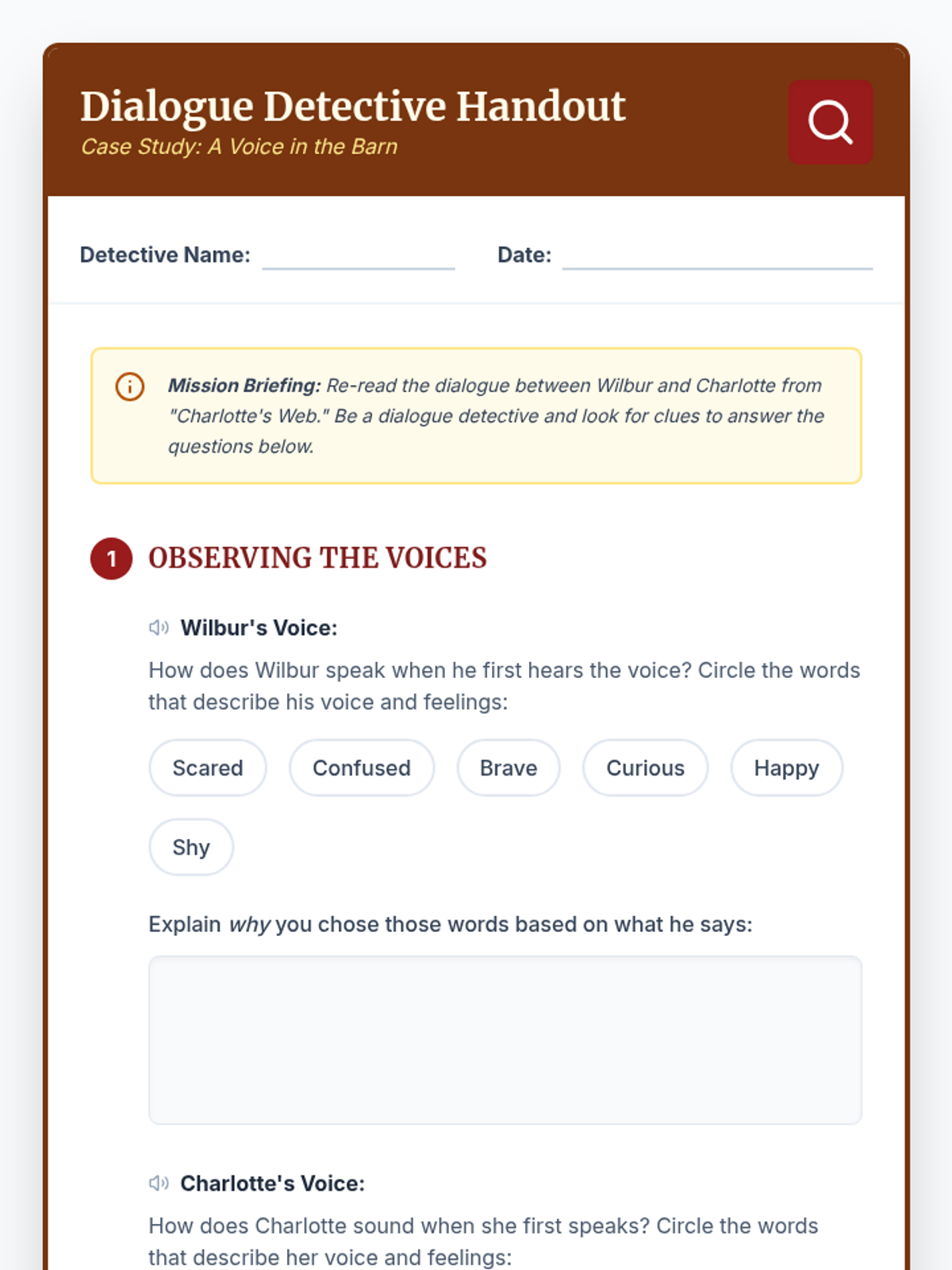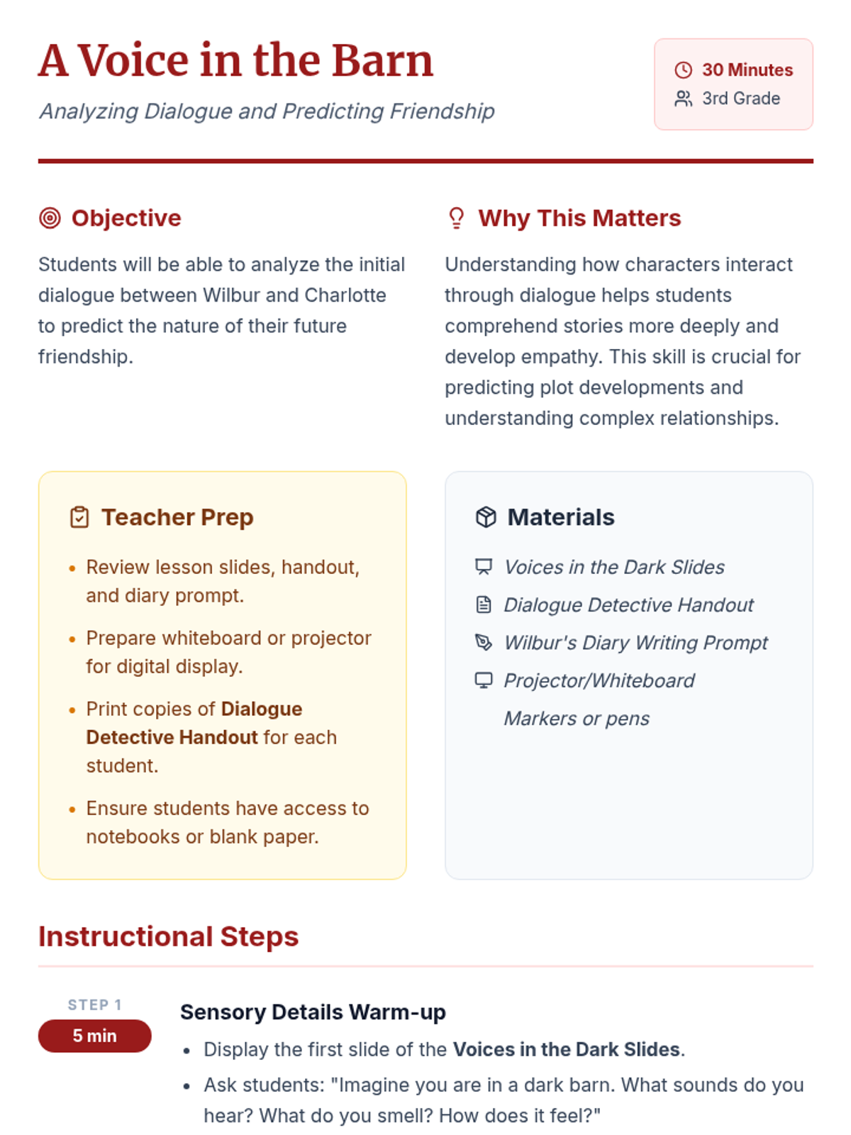 A 30-minute 3rd grade lesson focusing on the initial interaction between Wilbur and Charlotte in E.B. White's 'Charlotte's Web'. Students analyze character dialogue to predict their future friendship.