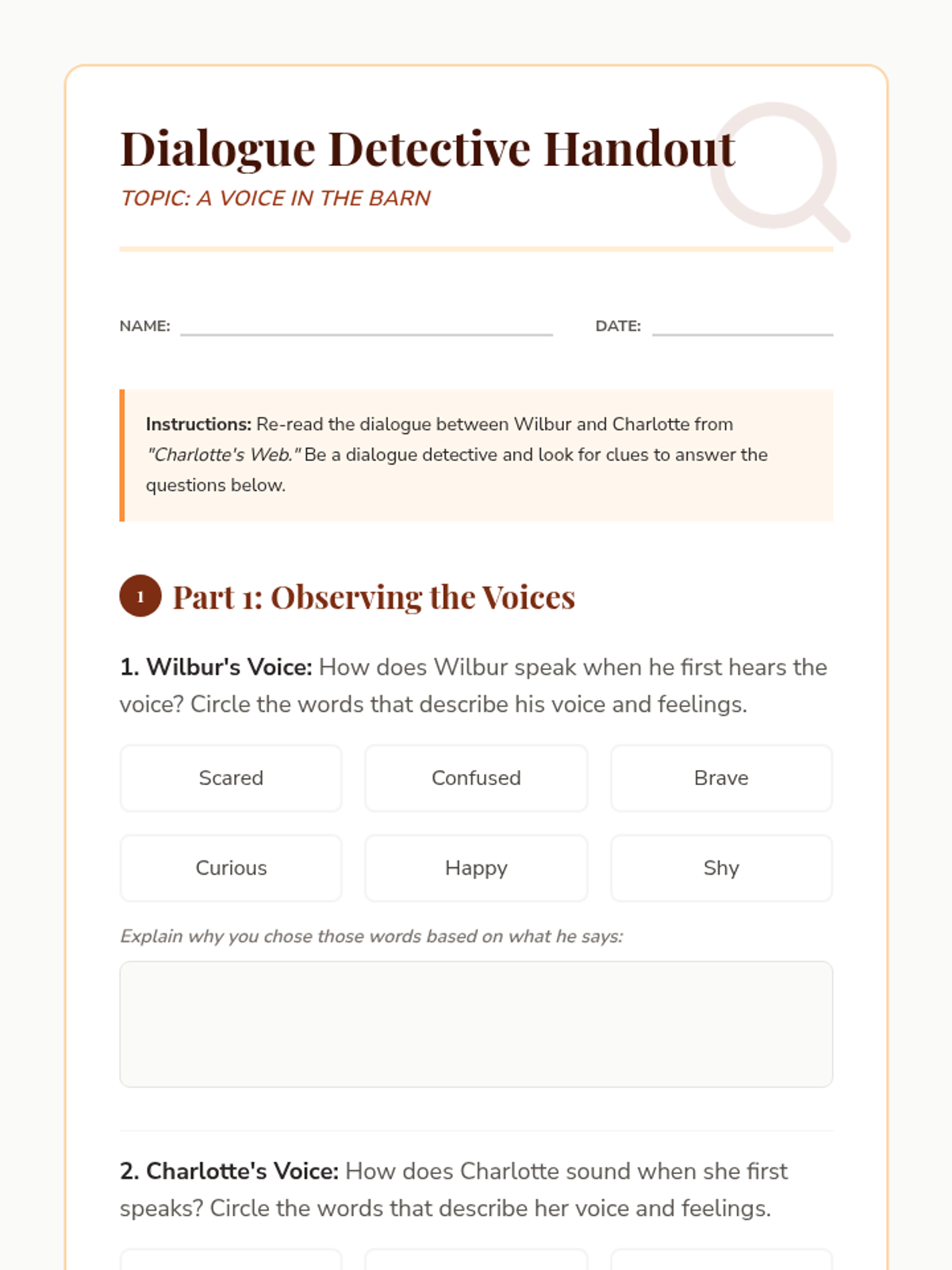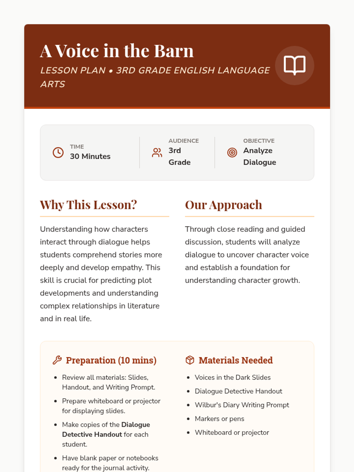 A 30-minute lesson for 3rd Graders focusing on Wilbur and Charlotte's first meeting in 'Charlotte's Web', analyzing dialogue to predict their future friendship.