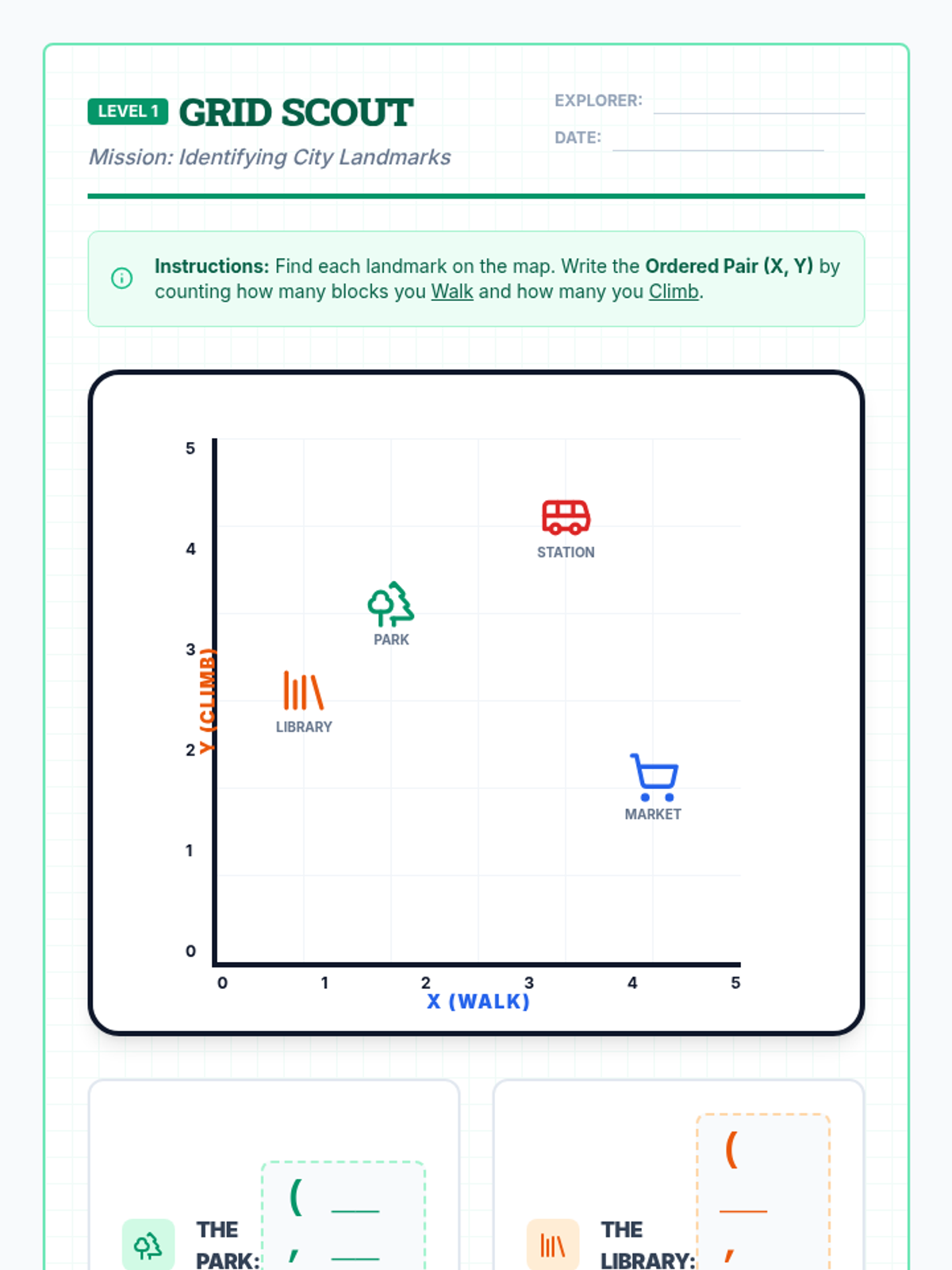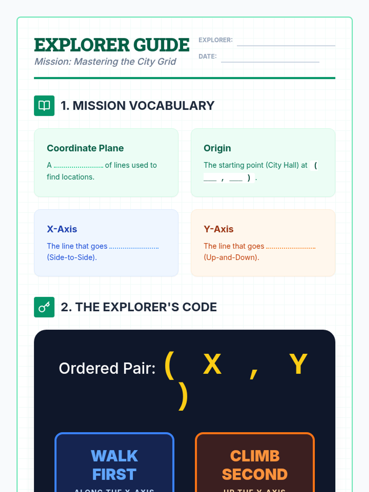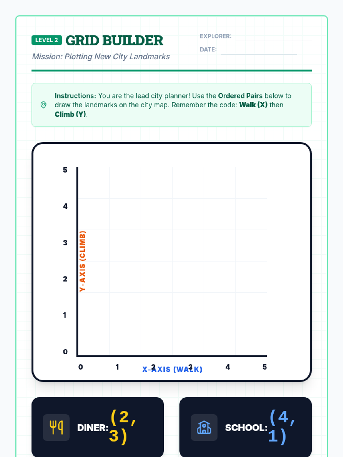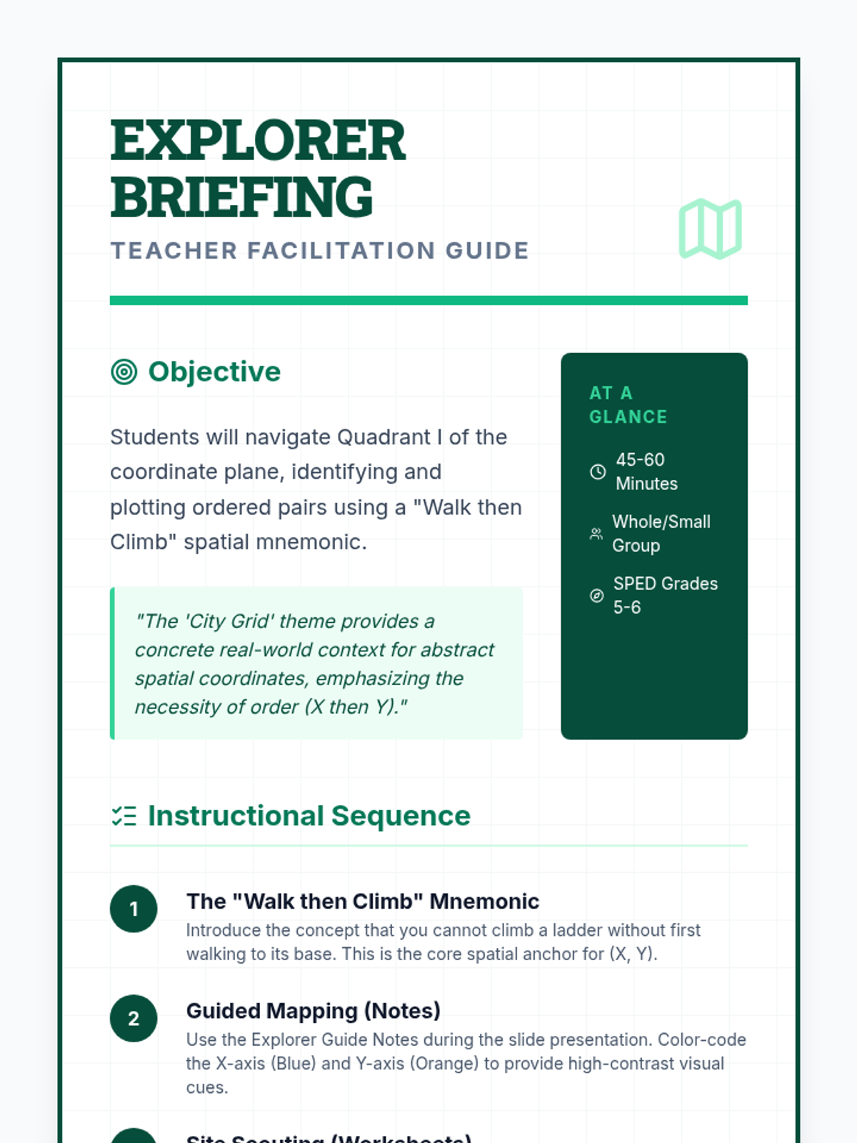 A visual introduction to the coordinate plane (Quadrant I) focusing on plotting points and identifying coordinates through a city mapping theme. Designed for special education students with heavy scaffolding and spatial mnemonics.