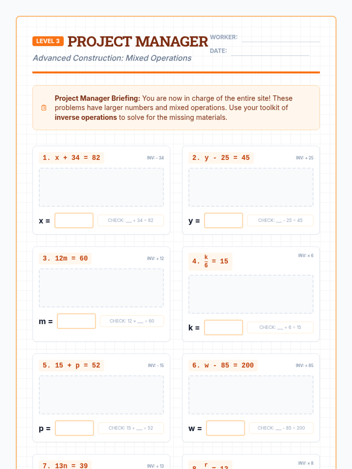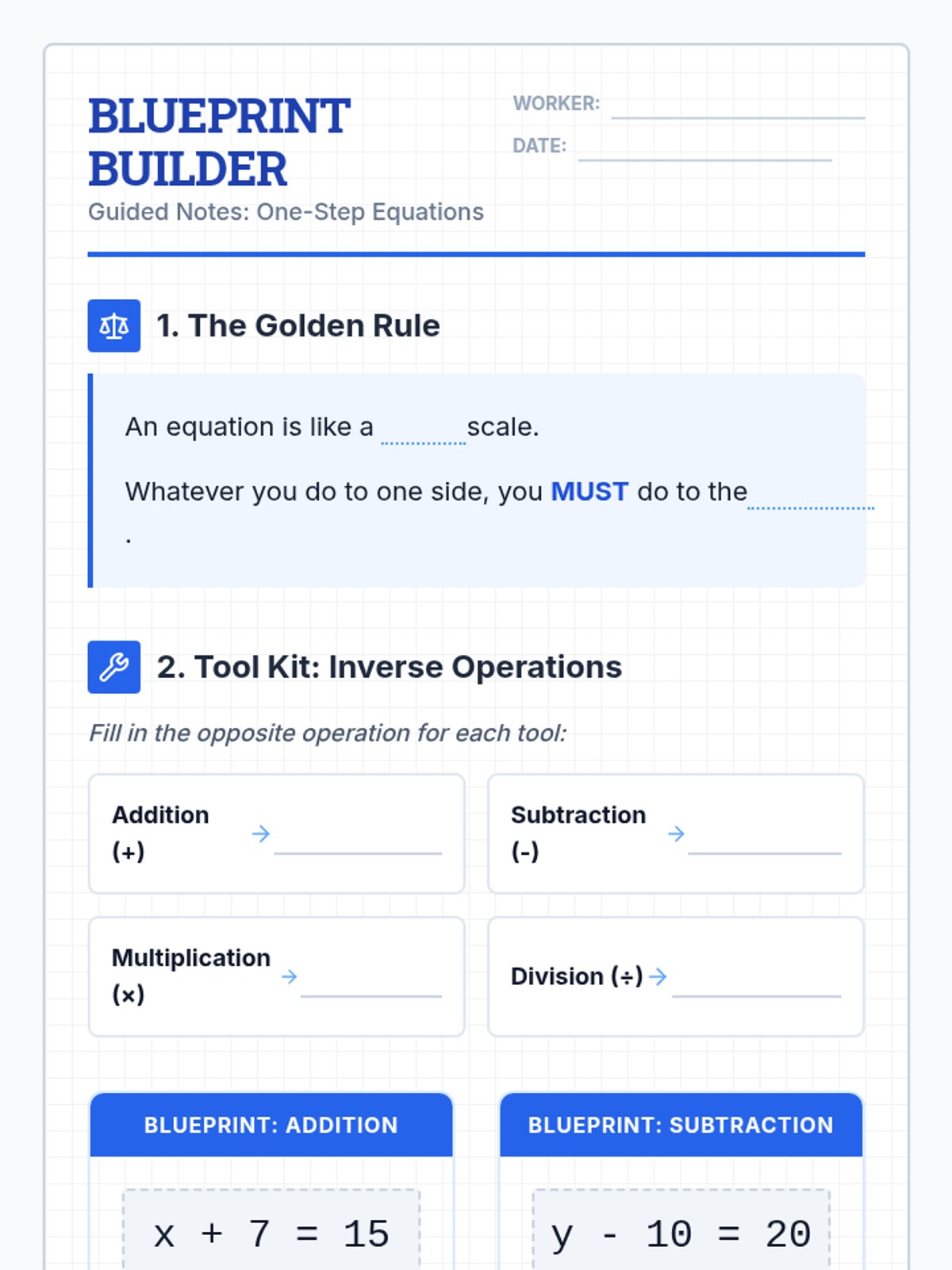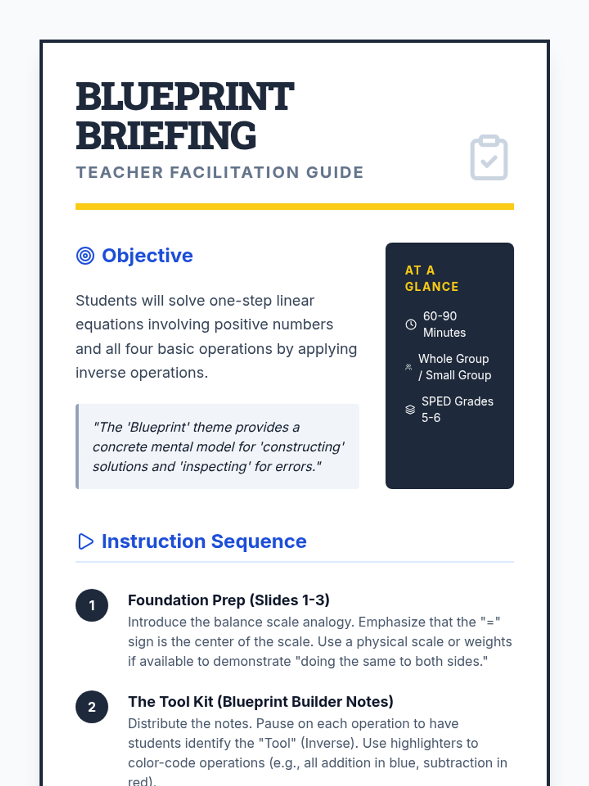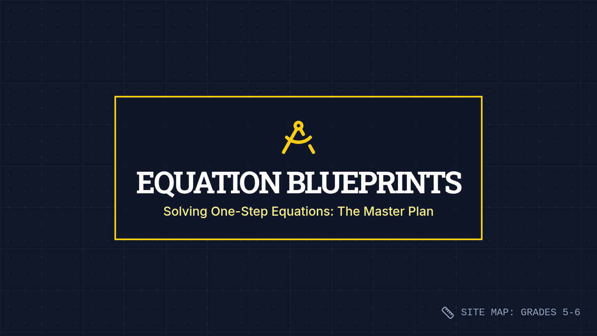 A foundational lesson on solving one-step equations using the four basic operations, designed specifically for special education students with heavy visual scaffolding and a blueprint construction theme.